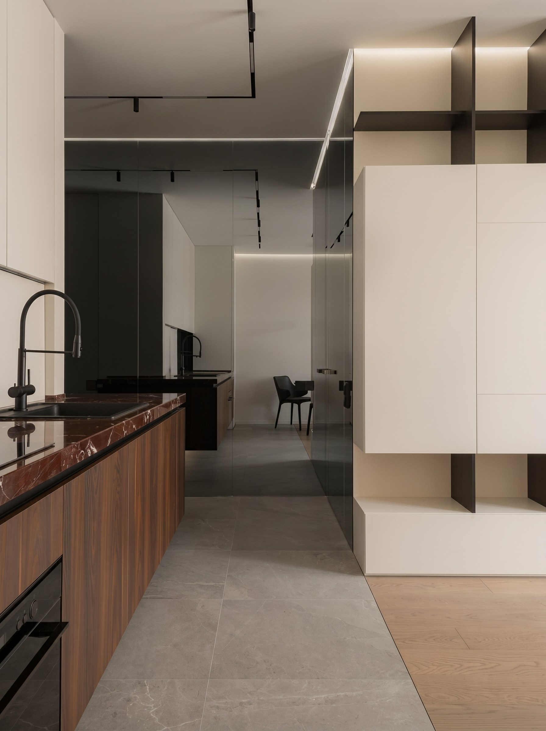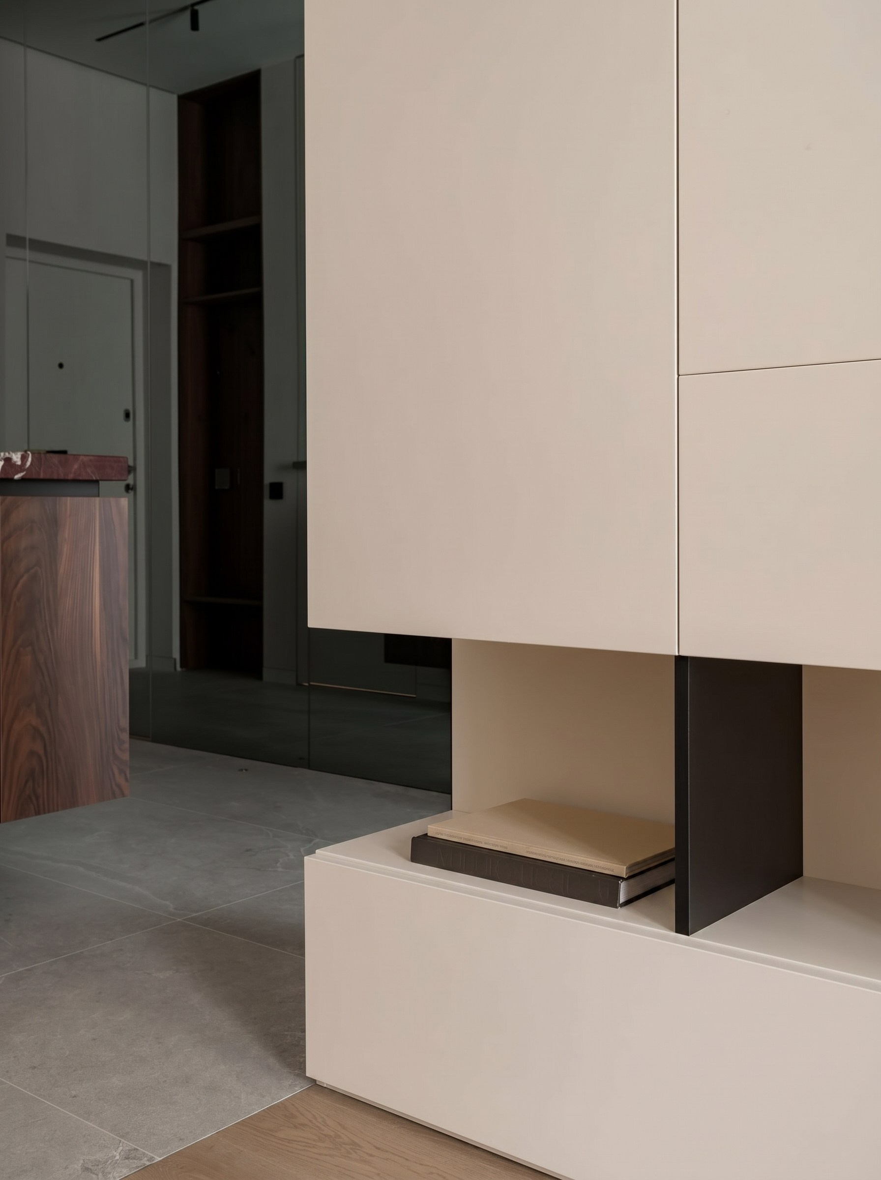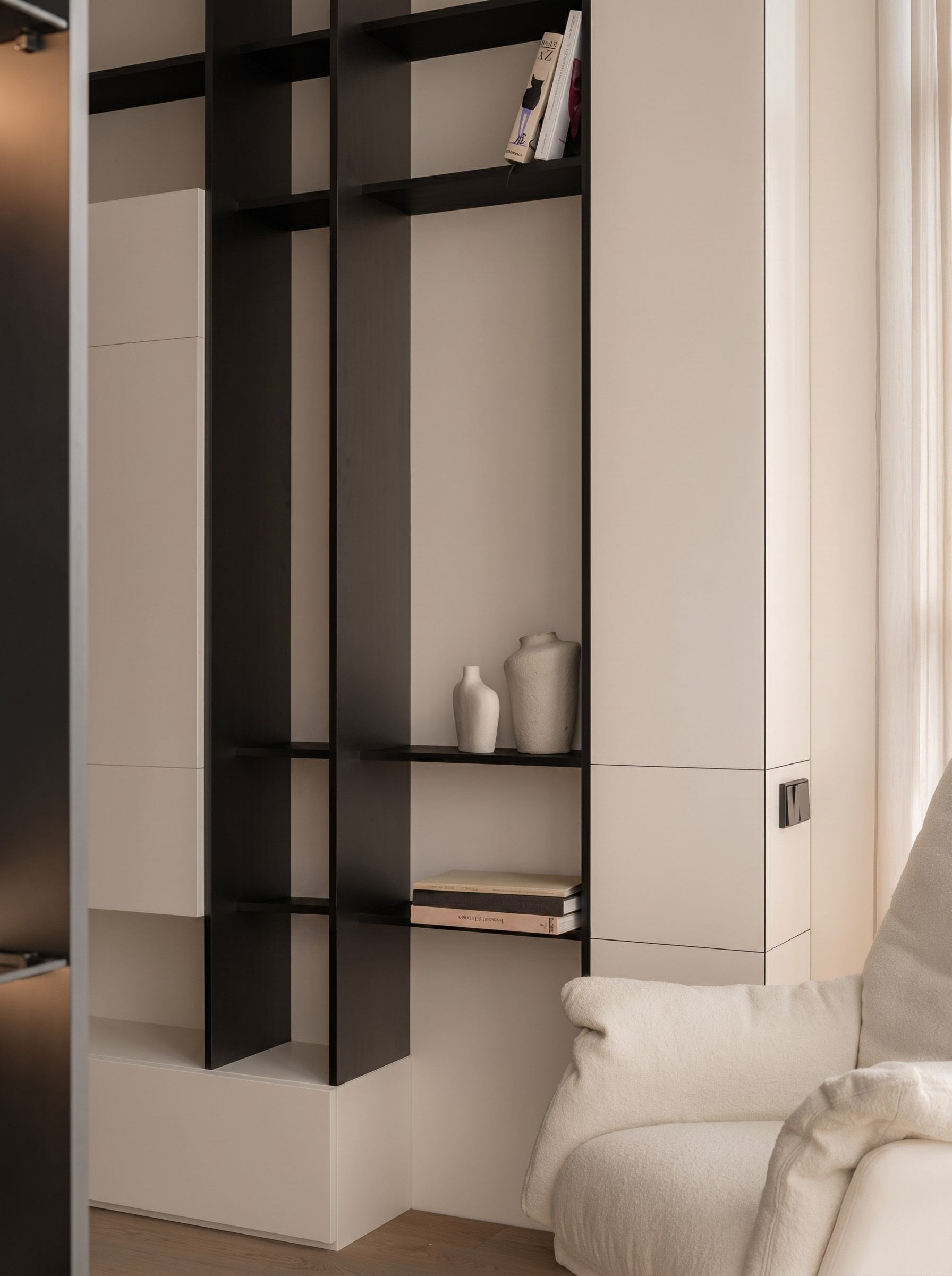 Светлые встроенные объёмы, открытые тёмные стеллажи, зеркальные поверхности и аккуратные графичные элементы помогают зонировать пространство, формируют ритм и добавляют интерьеру глубину. За счёт этого квартира воспринимается не перегруженной, а очень собранной и спокойной.