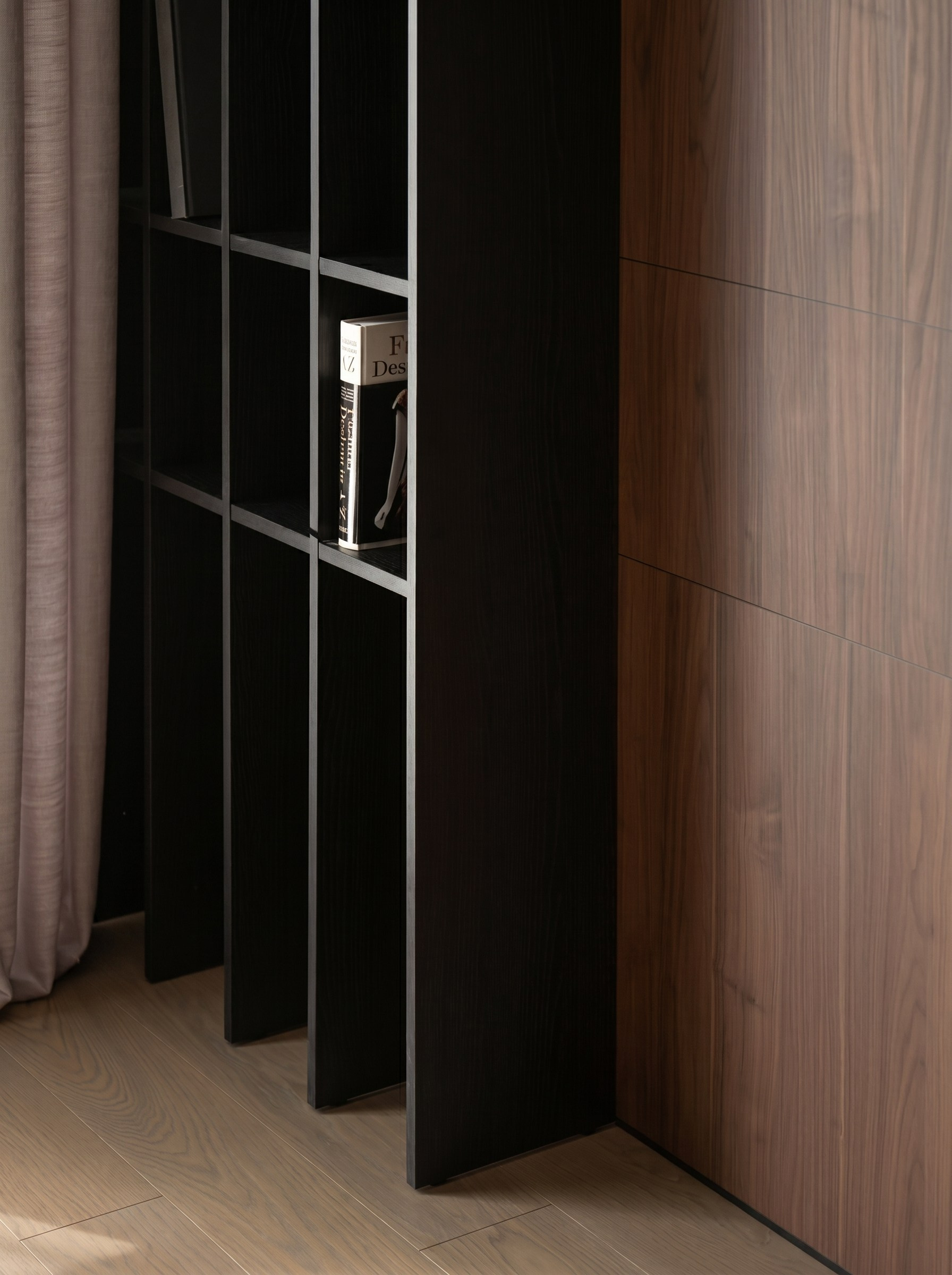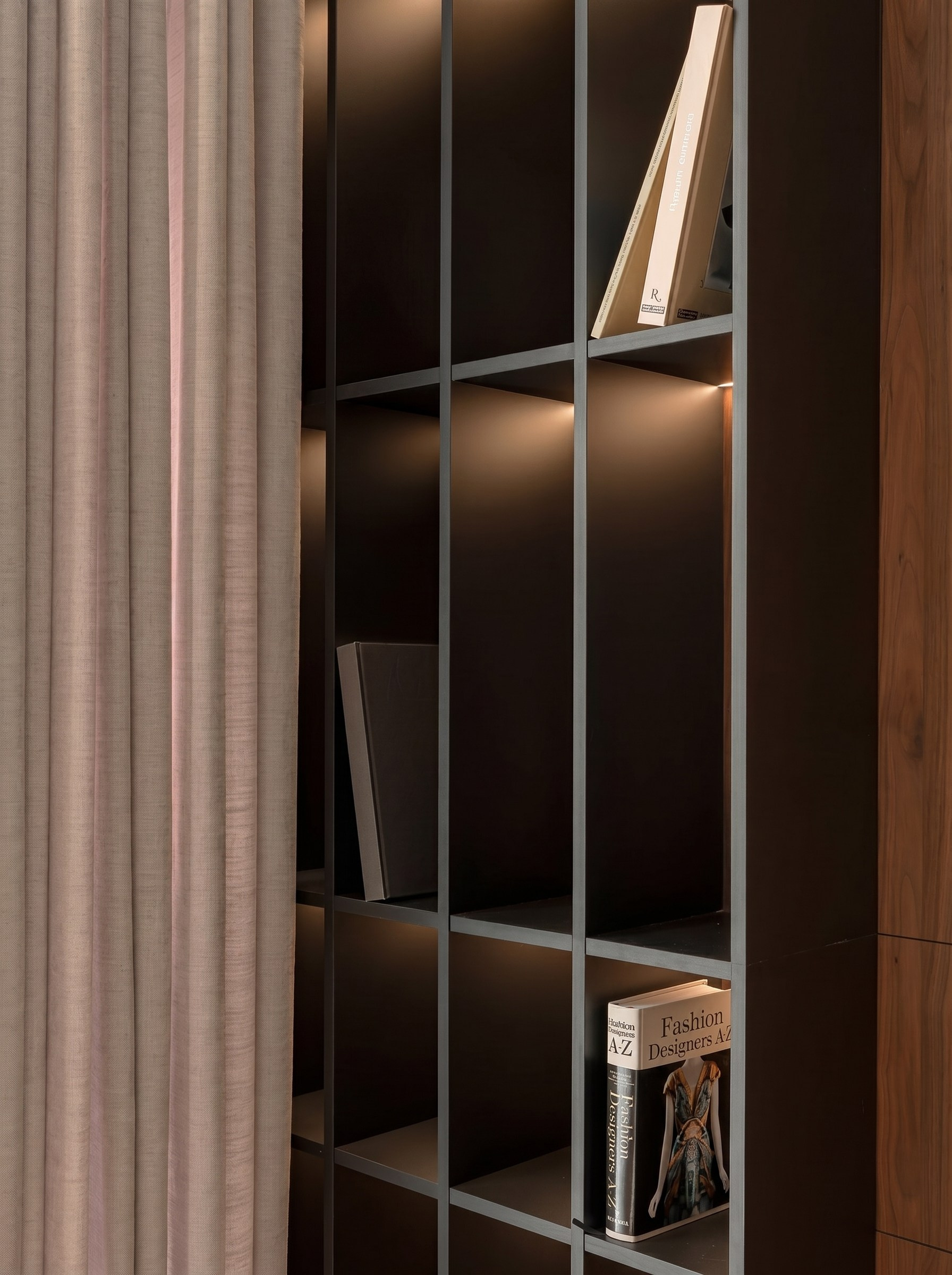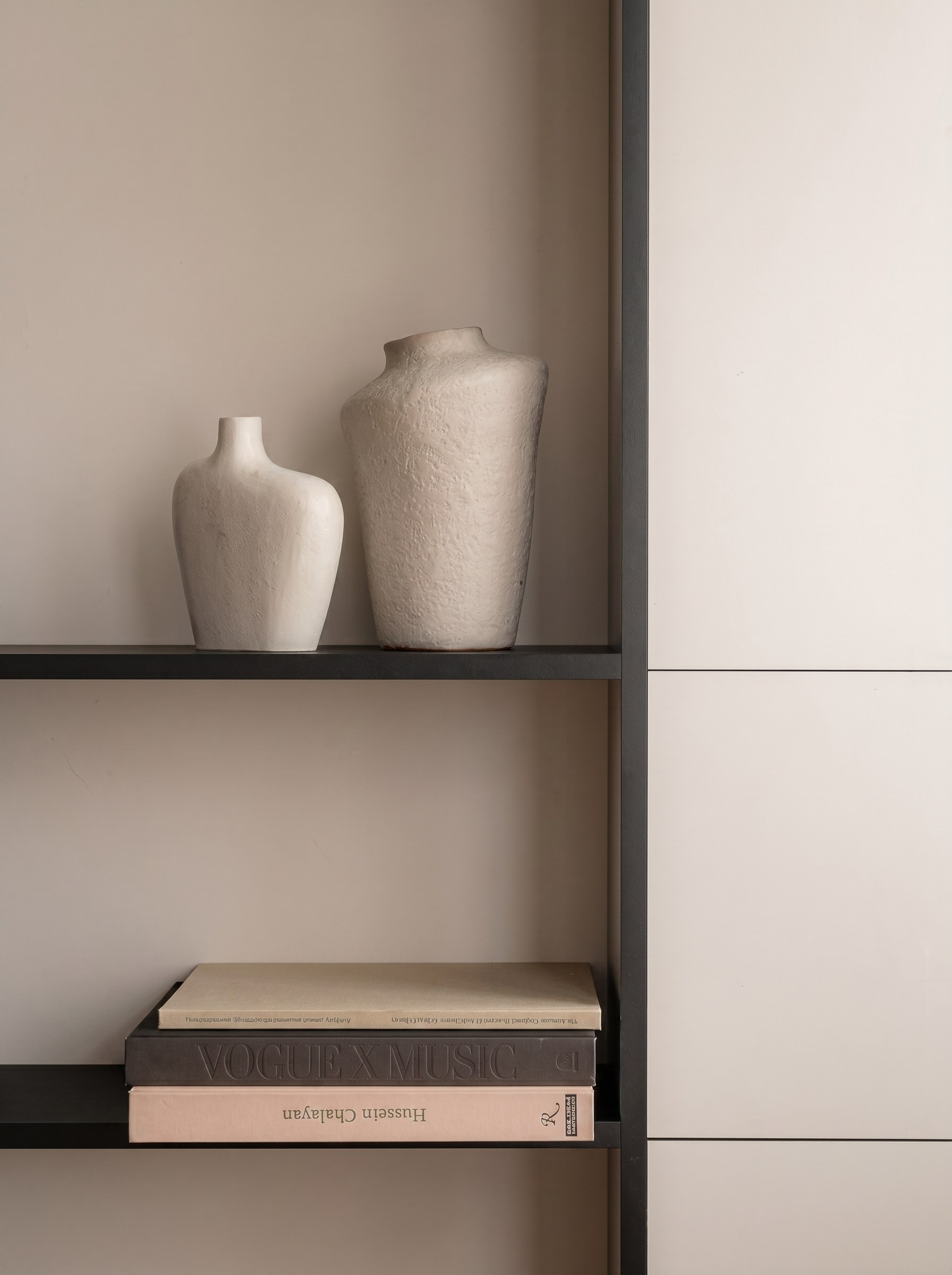Светлые встроенные объёмы, открытые тёмные стеллажи, зеркальные поверхности и аккуратные графичные элементы помогают зонировать пространство, формируют ритм и добавляют интерьеру глубину. За счёт этого квартира воспринимается не перегруженной, а очень собранной и спокойной.
