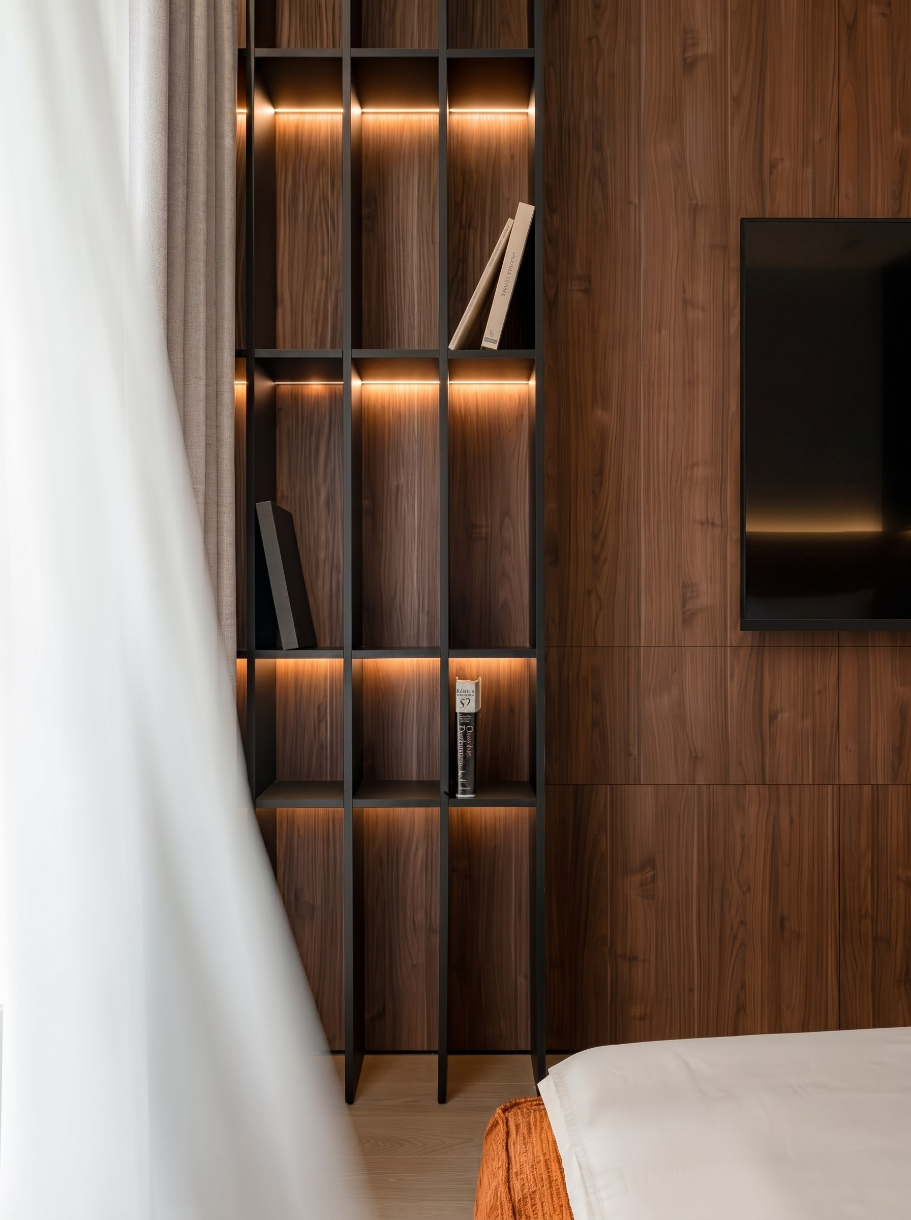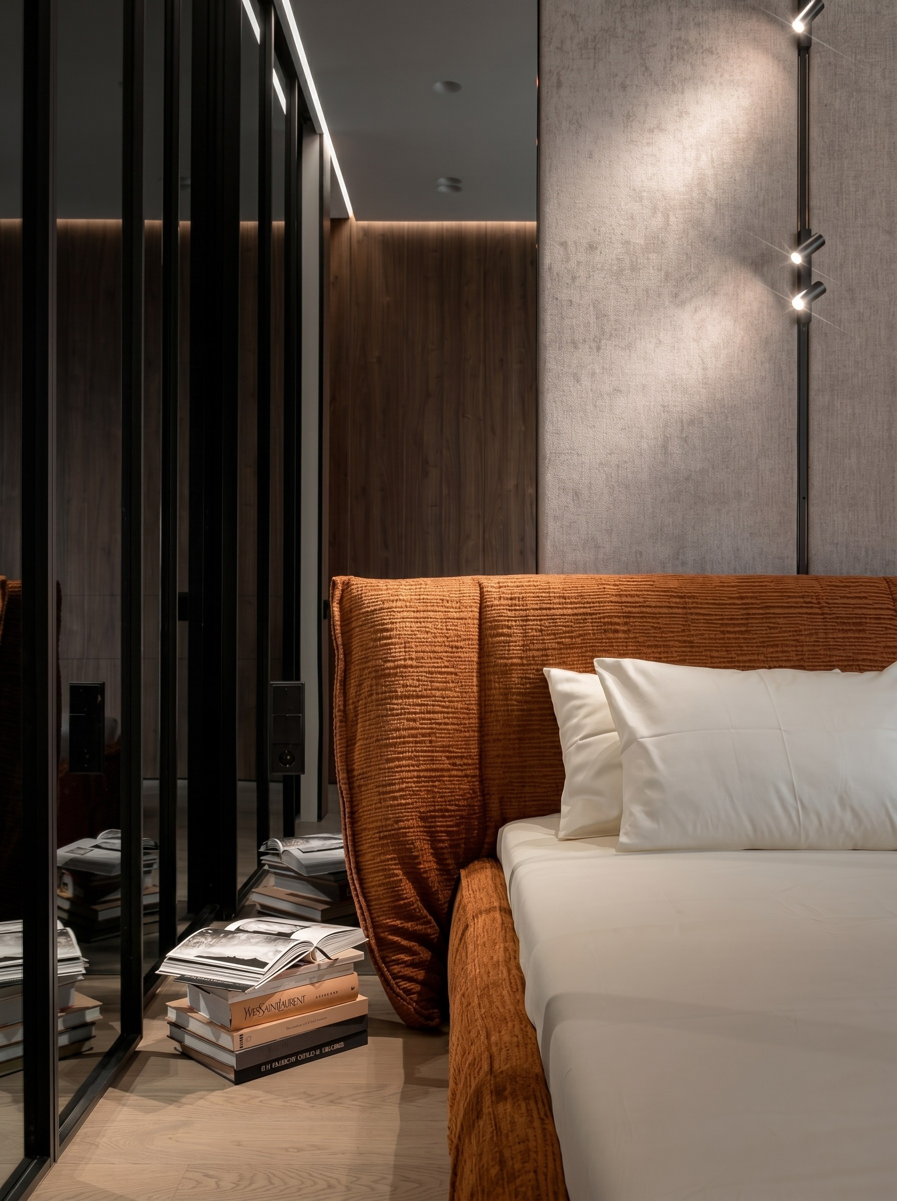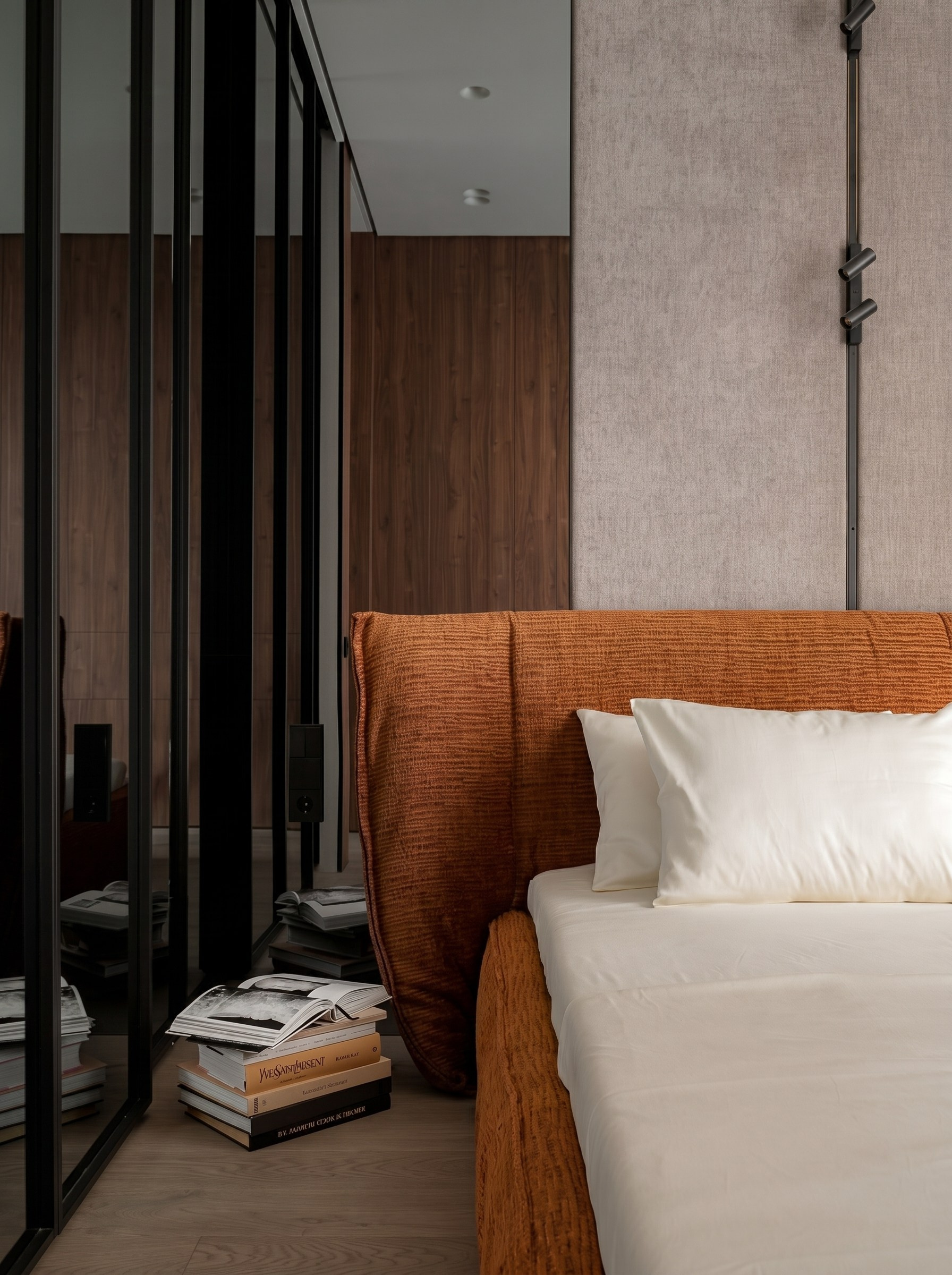 Спальня продолжает общую эстетику квартиры, но раскрывается более камерно и мягко. Здесь особенно важны фактуры, свет и глубокие тёплые оттенки. Пространство получилось уютным, приватным и при этом очень собранным по композиции.