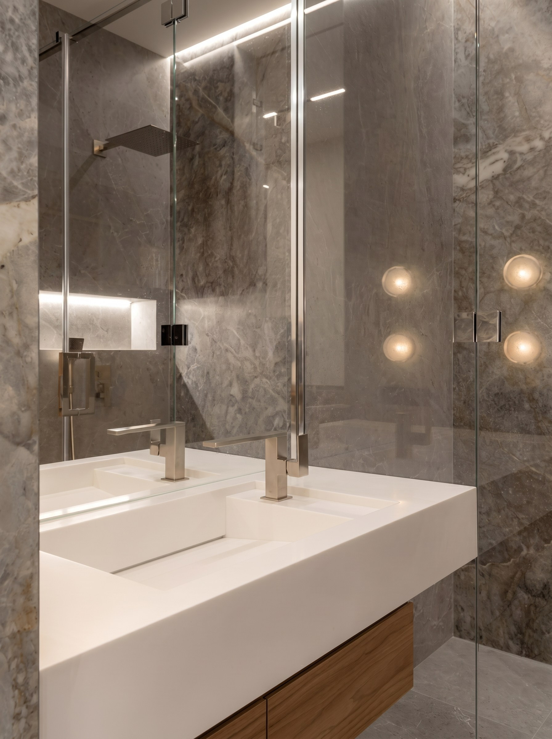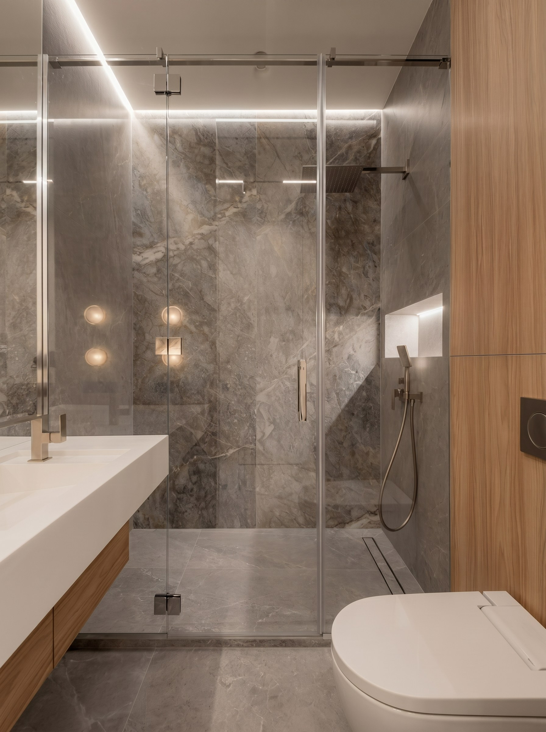 Душевая зона выполнена максимально чисто и архитектурно. Стеклянная перегородка не дробит пространство, ниша с подсветкой делает использование более удобным, а крупный каменный рисунок формирует эффектный и дорогой фон. Интегрированная раковина подчёркивает чистоту линий, а локальные светильники у зеркала смягчают интерьер и добавляют ему выразительности.