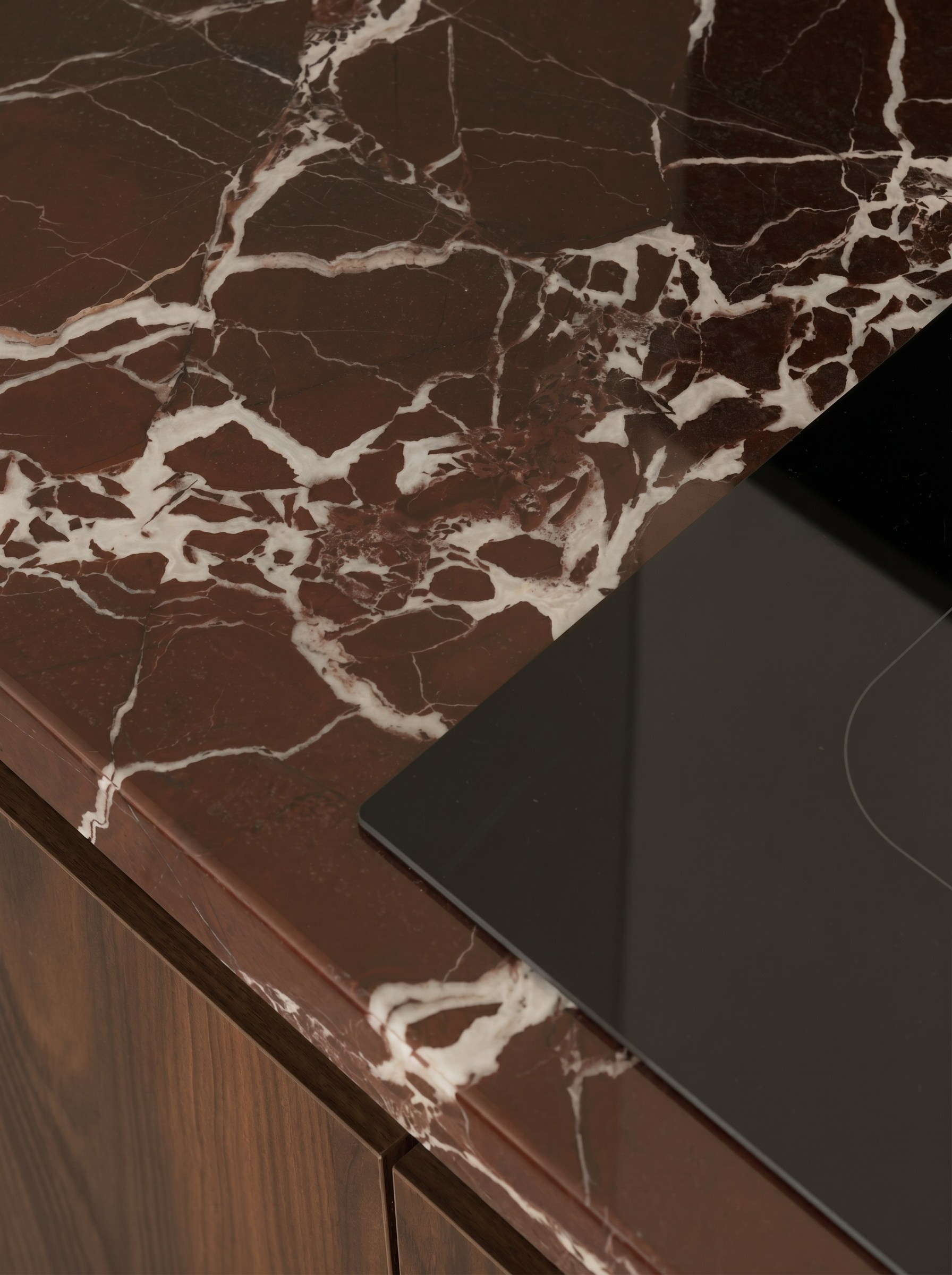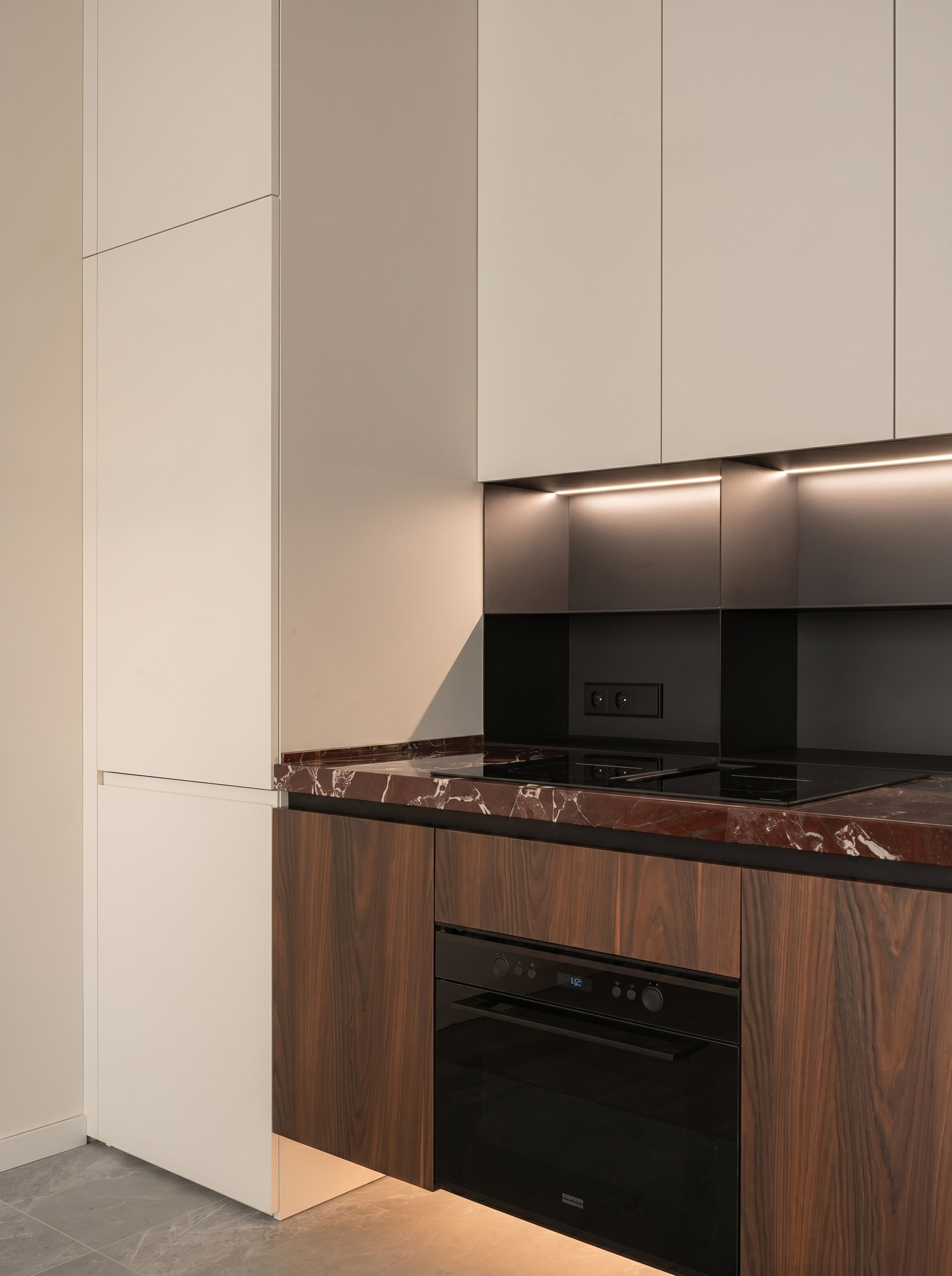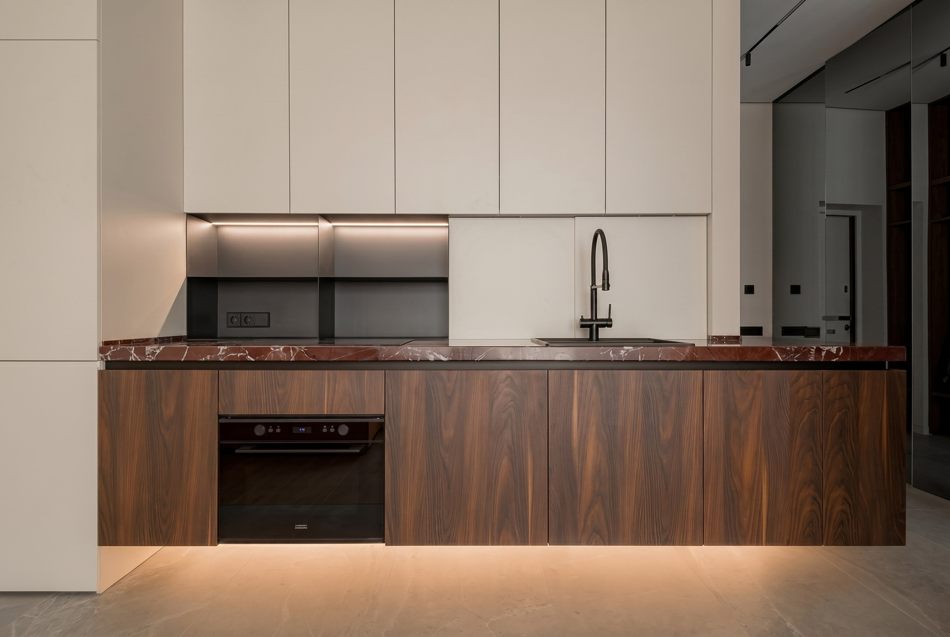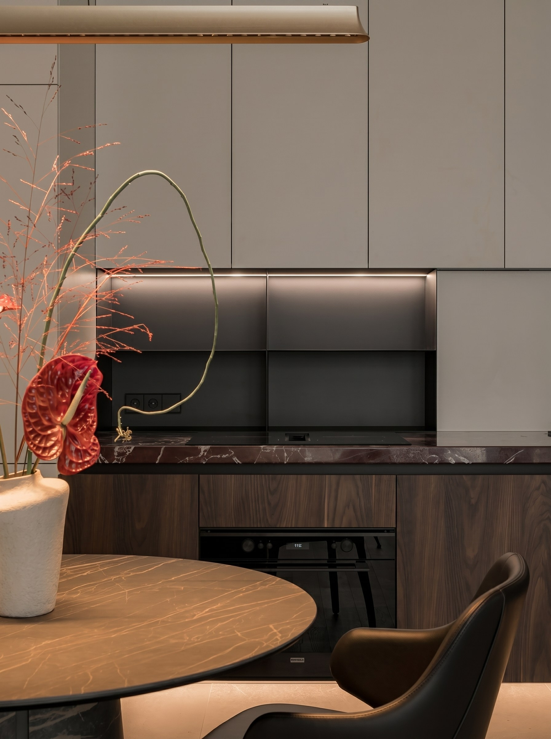 Кухня выстроена предельно лаконично. Светлые верхние фасады делают композицию визуально легче, а нижний блок в насыщенной древесной отделке добавляет глубину и характер. Каменная столешница с активным рисунком становится выразительным акцентом и усиливает ощущение дорогого, тщательно собранного интерьера. Тёмный фартук, чёрная сантехника и мягкая встроенная подсветка поддерживают современную графику пространства.