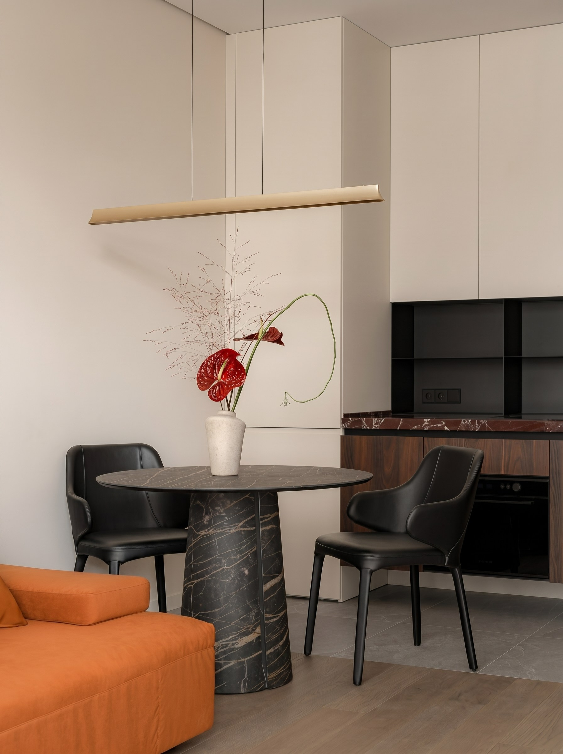 Обеденная группа компактная, но выглядит полноценно и статусно. Круглый стол смягчает общую геометрию, делает пространство более пластичным и удобным в использовании, а тонкий подвесной светильник завершает композицию и добавляет интерьеру аккуратную дизайнерскую выразительность.