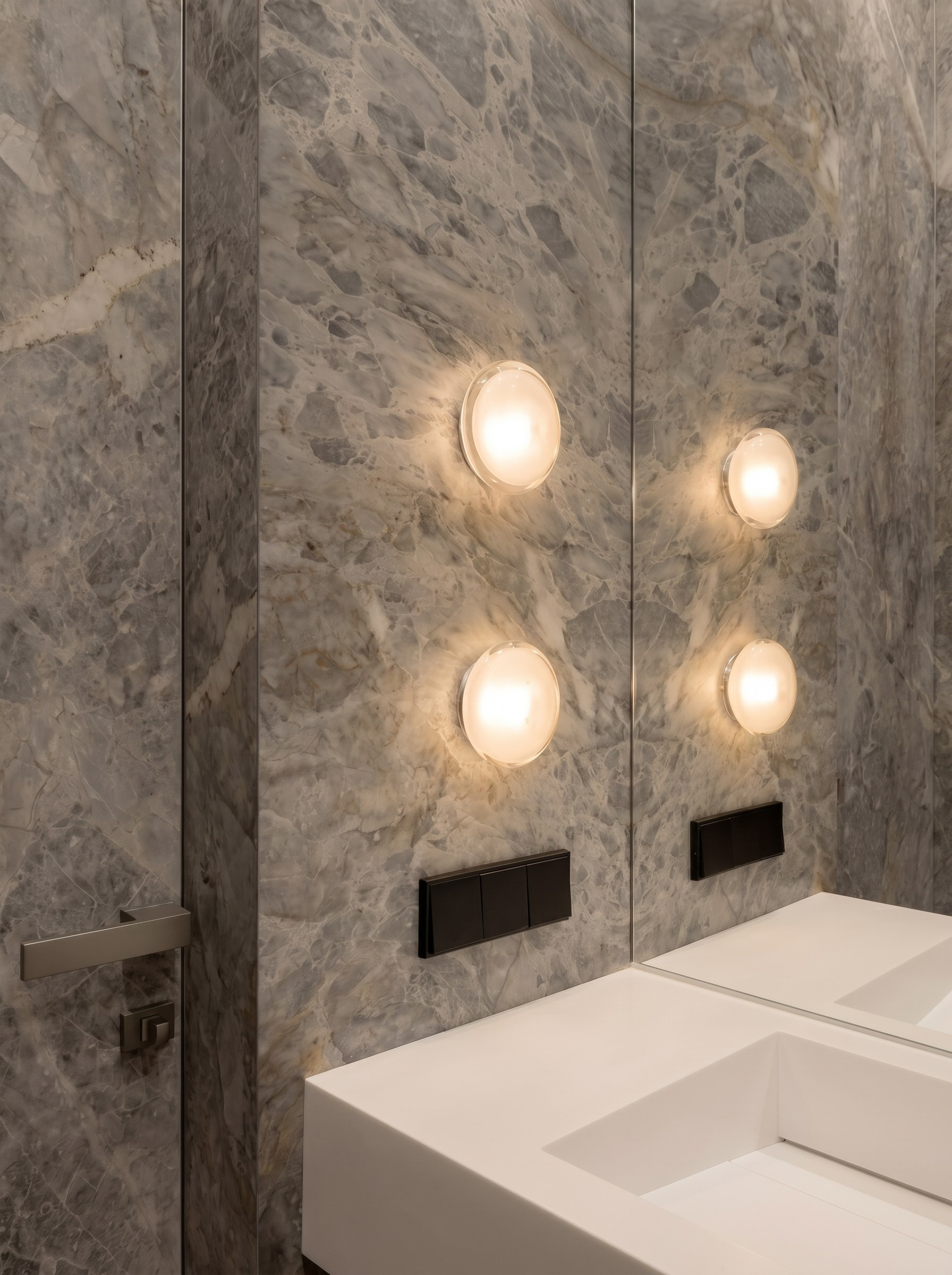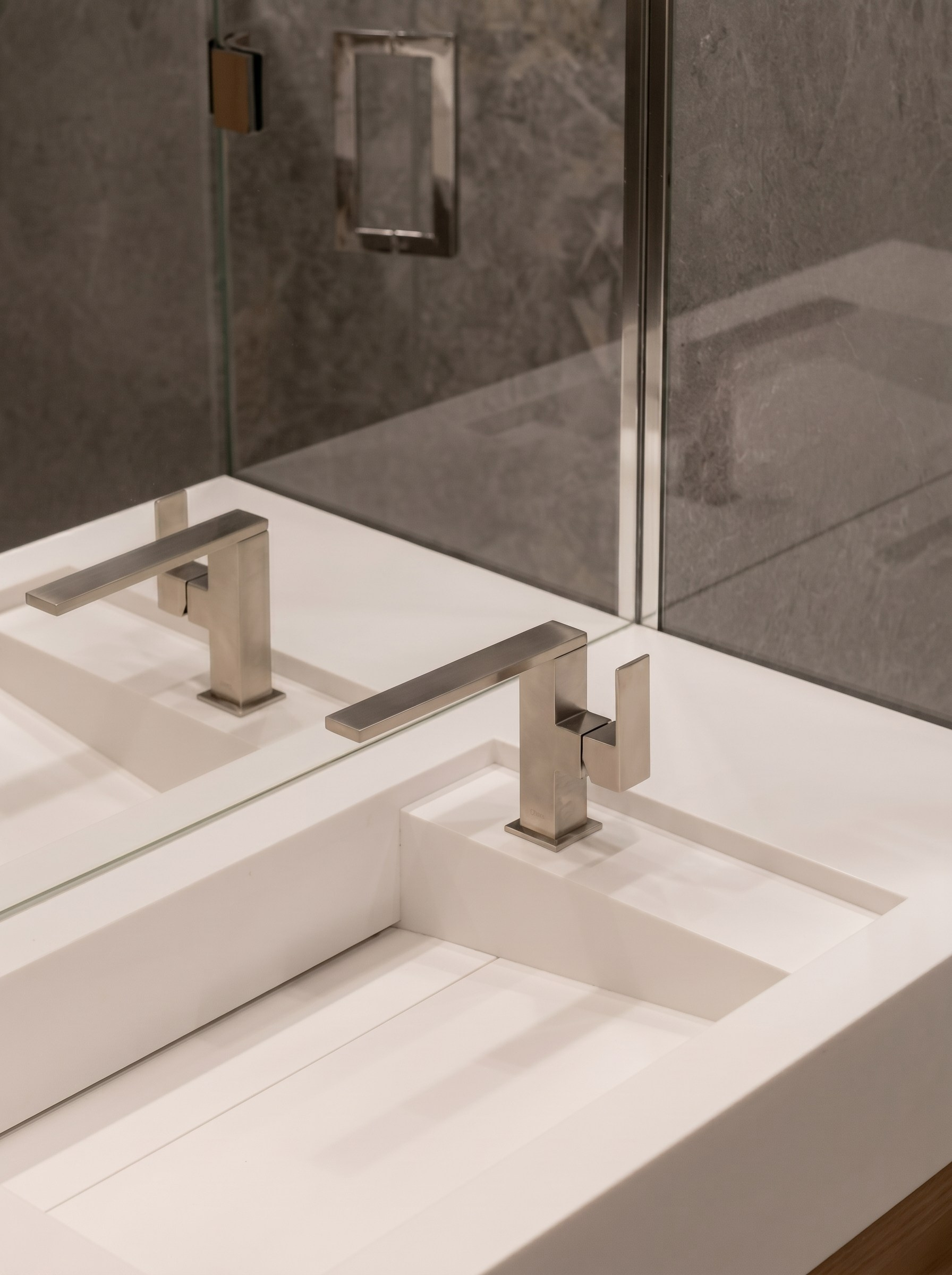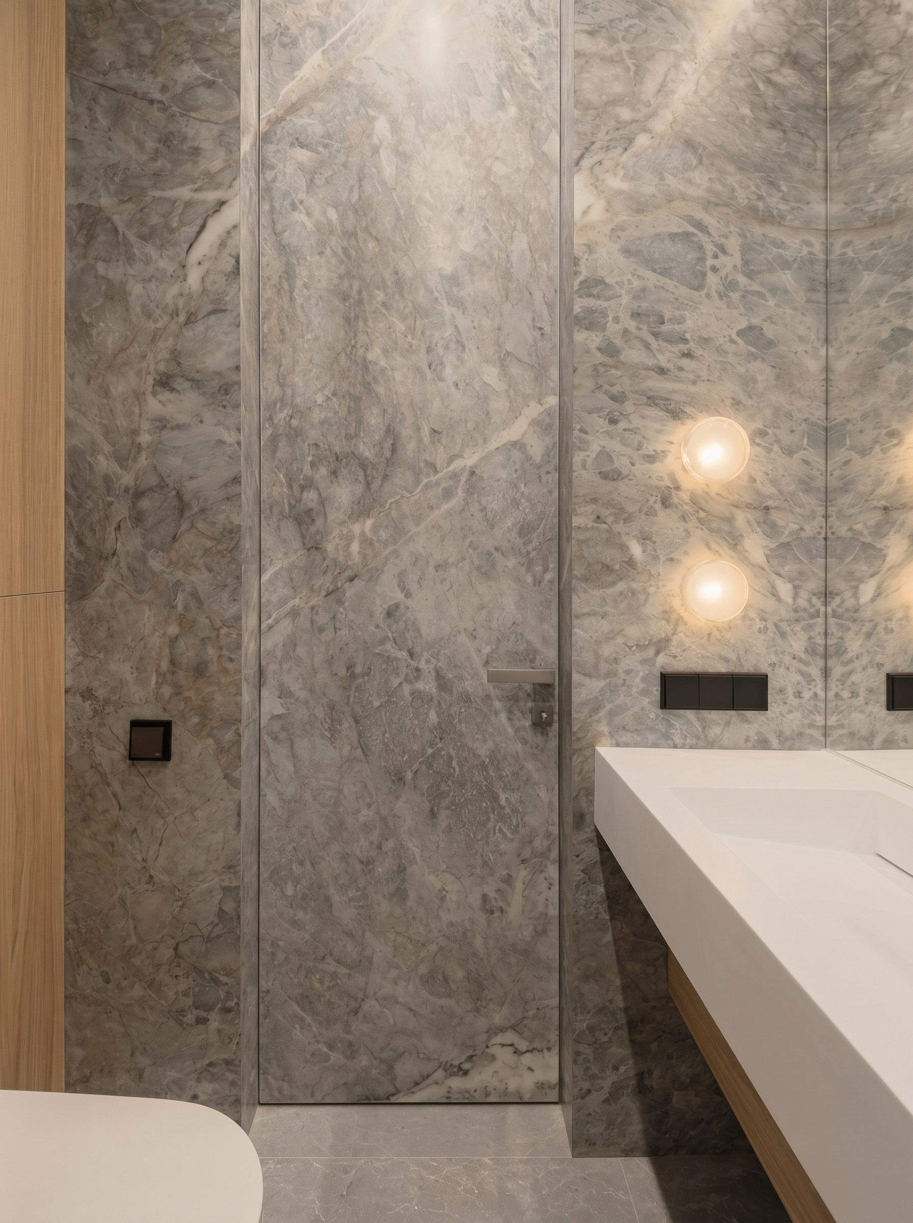 Санузел решён в эстетике современной спокойной роскоши. Здесь сочетаются крупная серая каменная текстура, чистая белая геометрия раковины, стекло, металл и тёплые древесные акценты. Благодаря этому интерьер выглядит цельным, глубоким и очень аккуратно собранным.