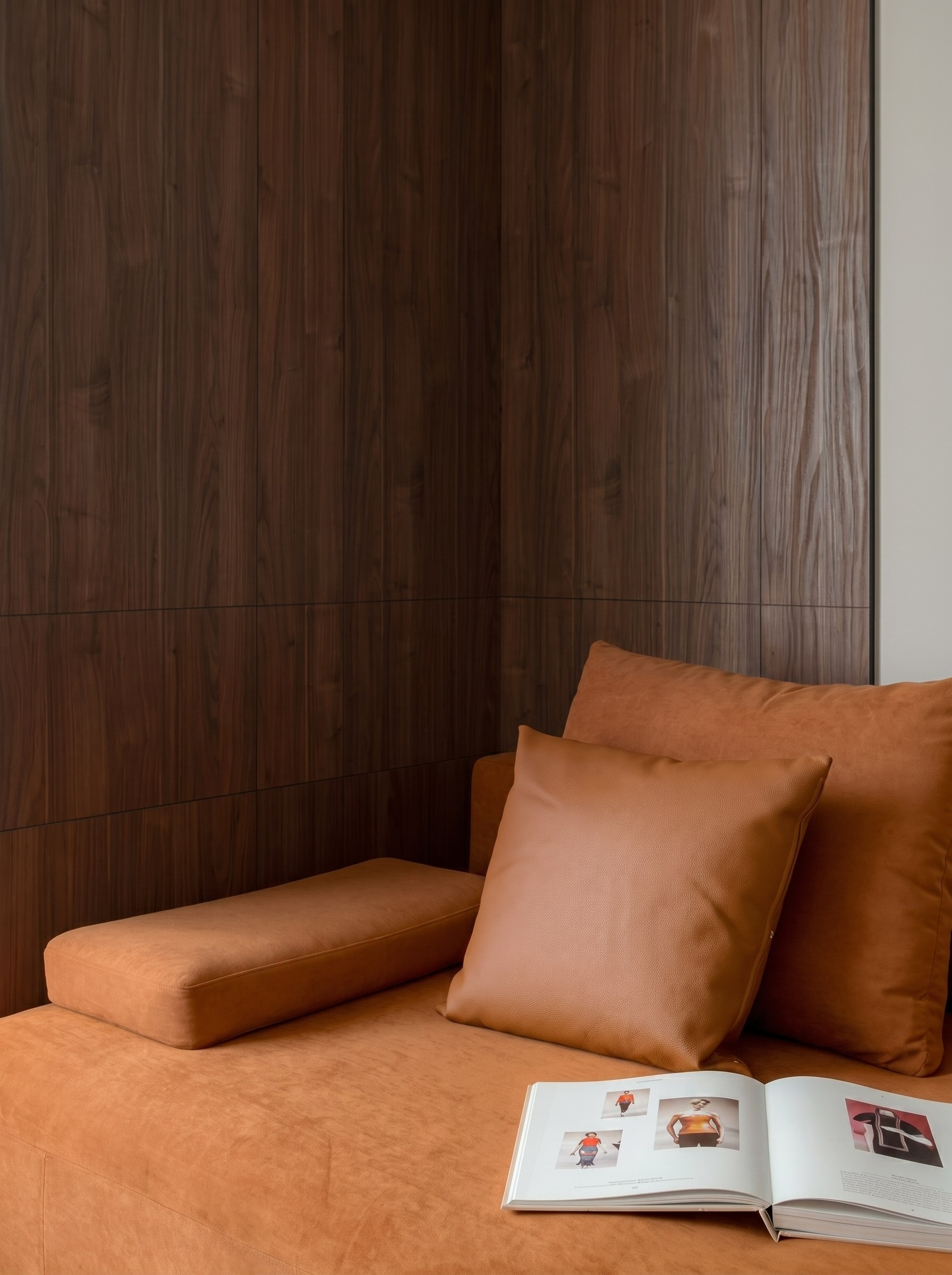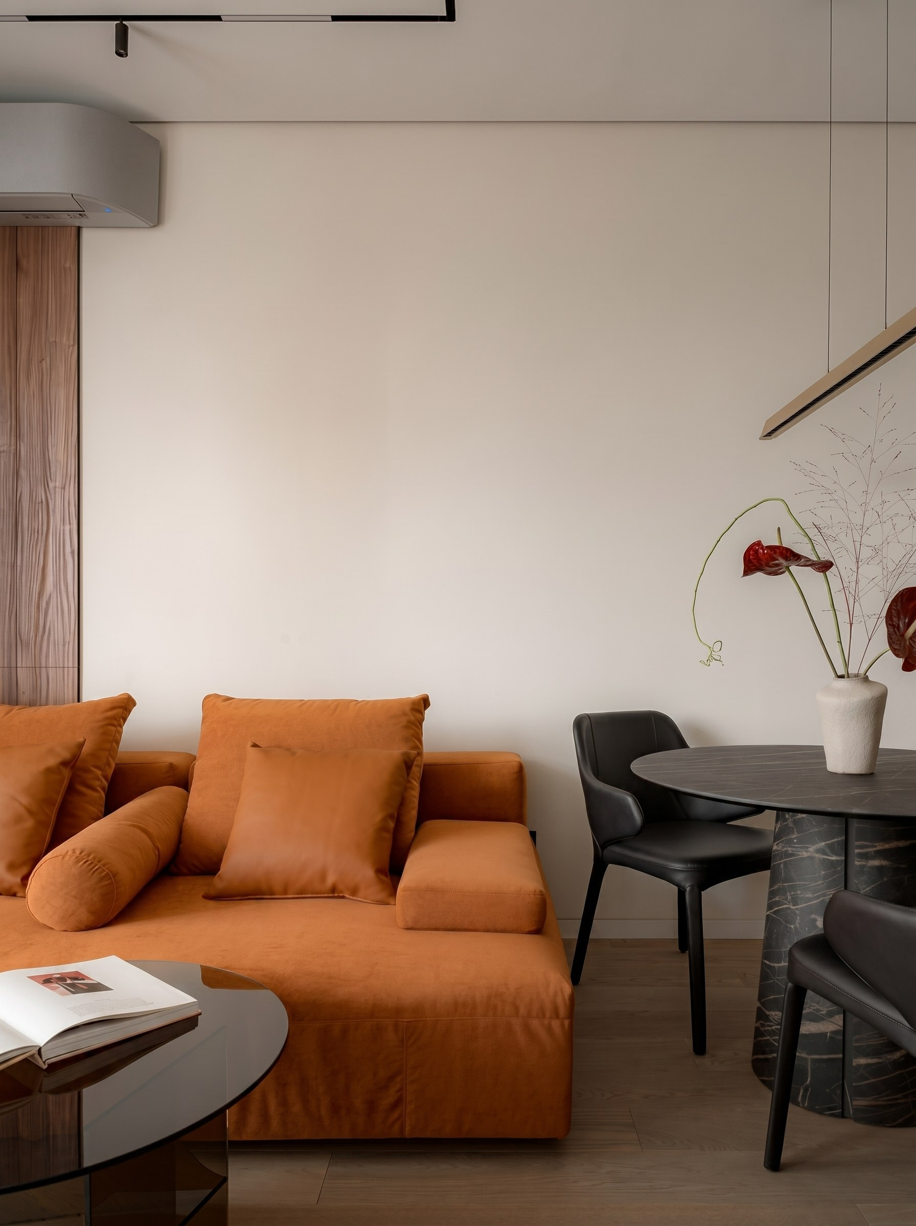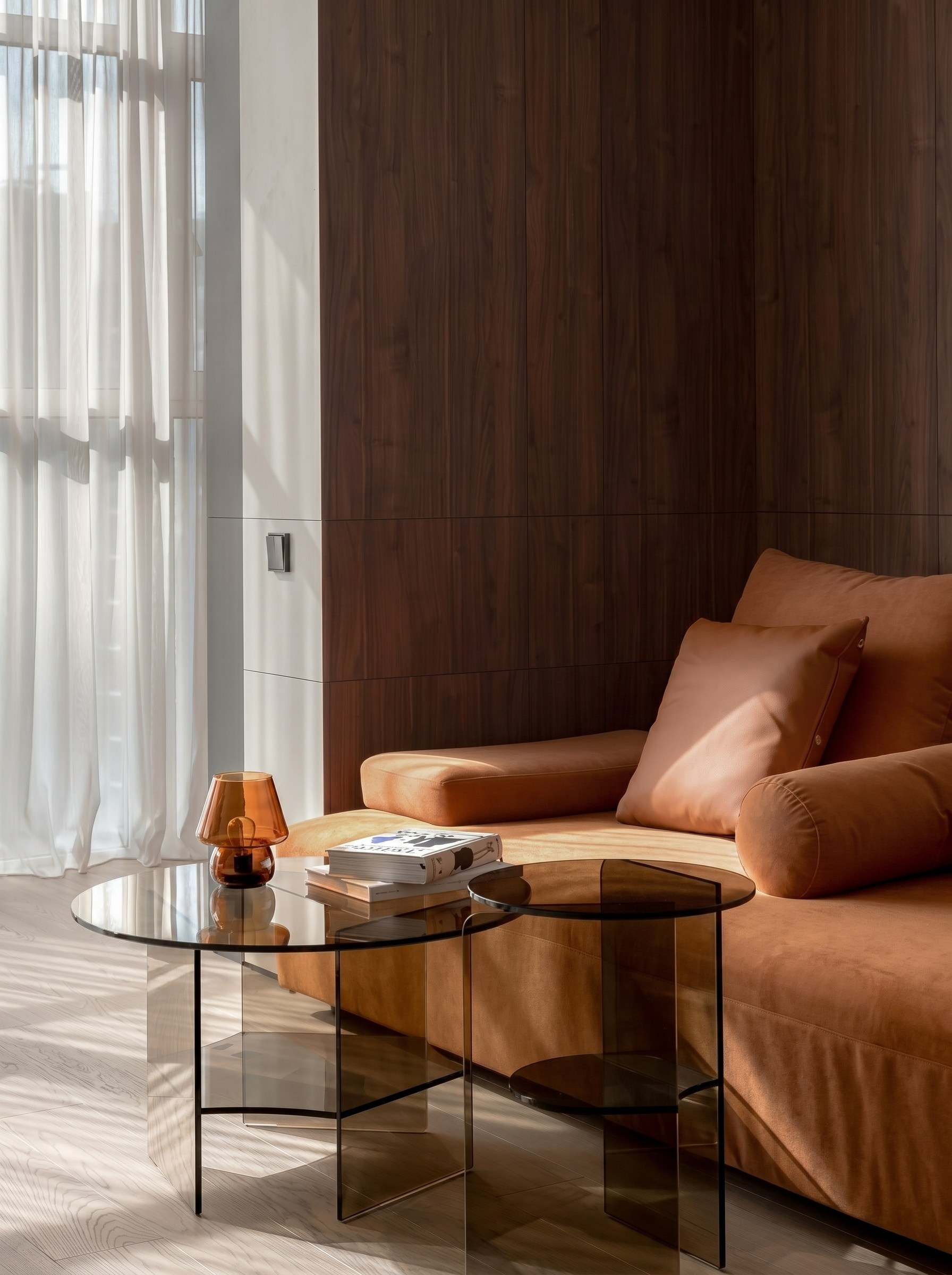В зоне гостиной интерьер раскрывается через баланс мягкости и архитектурной строгости. Диван в сложном карамельно-терракотовом оттенке формирует эмоциональный центр пространства и делает интерьер запоминающимся. Прозрачные дымчатые столики не утяжеляют композицию и сохраняют ощущение воздуха, а крупная древесная плоскость за диваном усиливает глубину и цельность общей зоны.