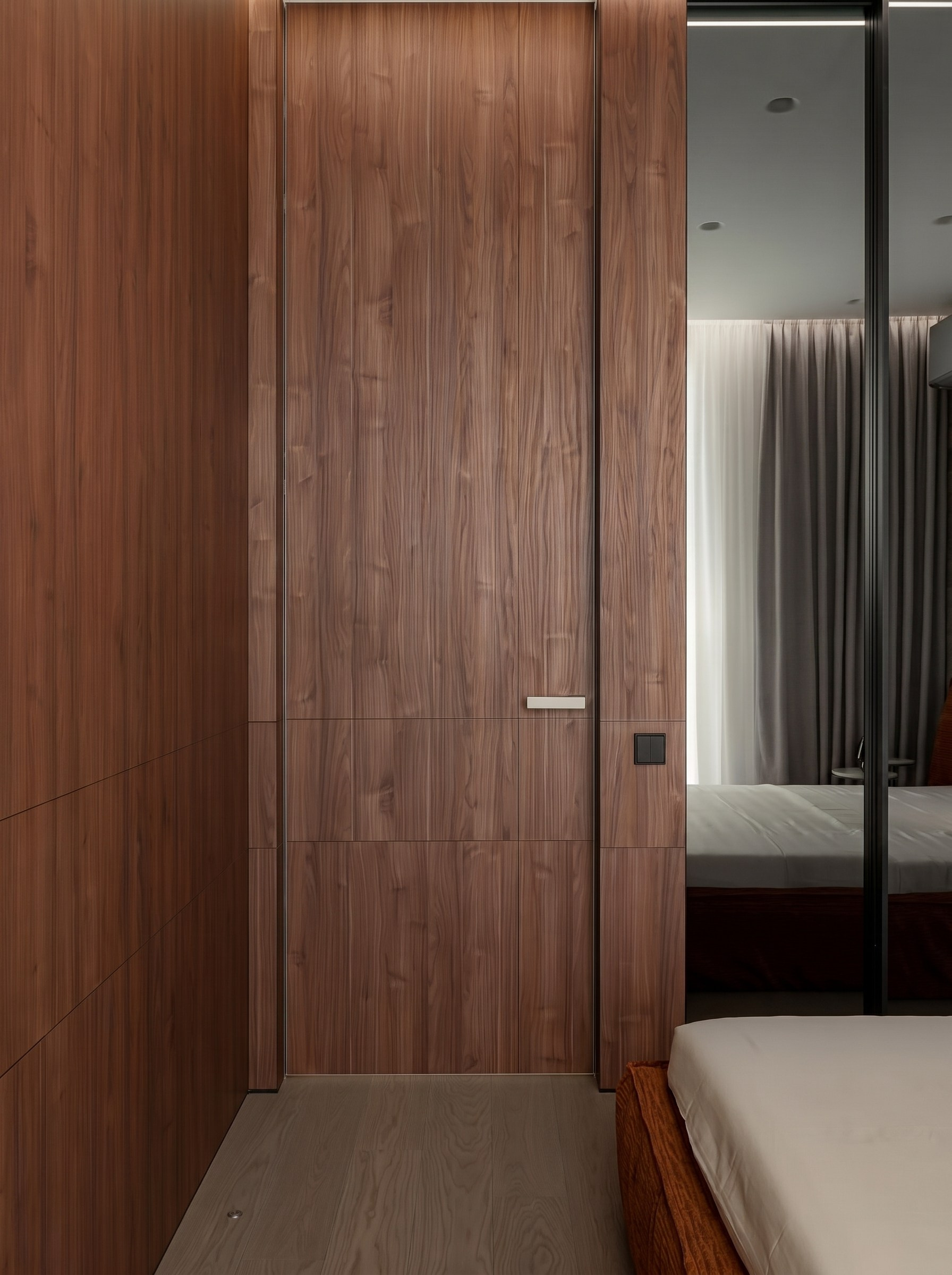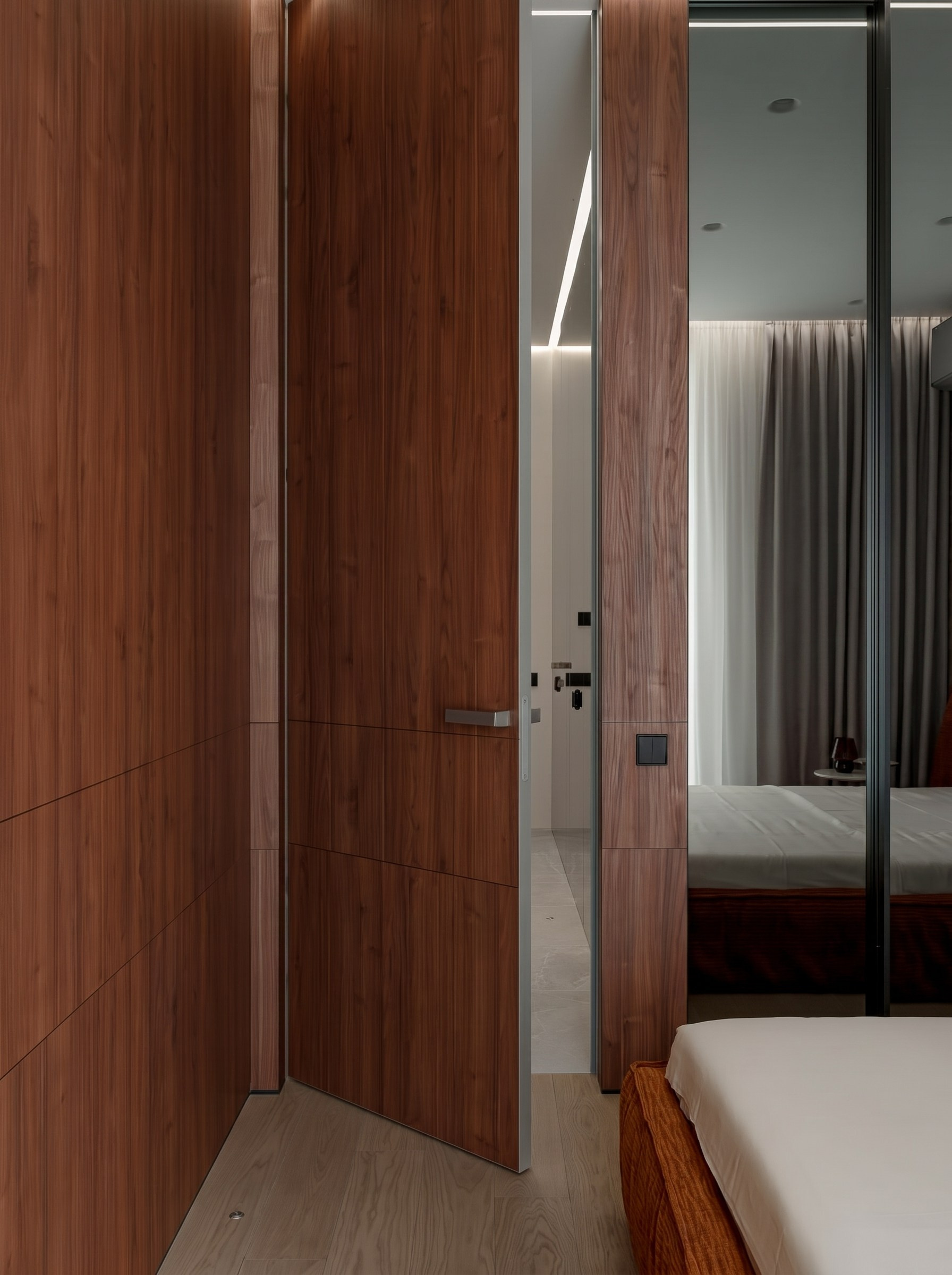 Центральный элемент интерьера — кровать с выразительным мягким изголовьем в сложном тёплом оттенке. Она добавляет спальне пластичность, визуальную плотность и ощущение уюта. Древесные панели, встроенные стеллажи с подсветкой, зеркальные фасады и спокойный текстиль создают цельную, продуманную атмосферу.