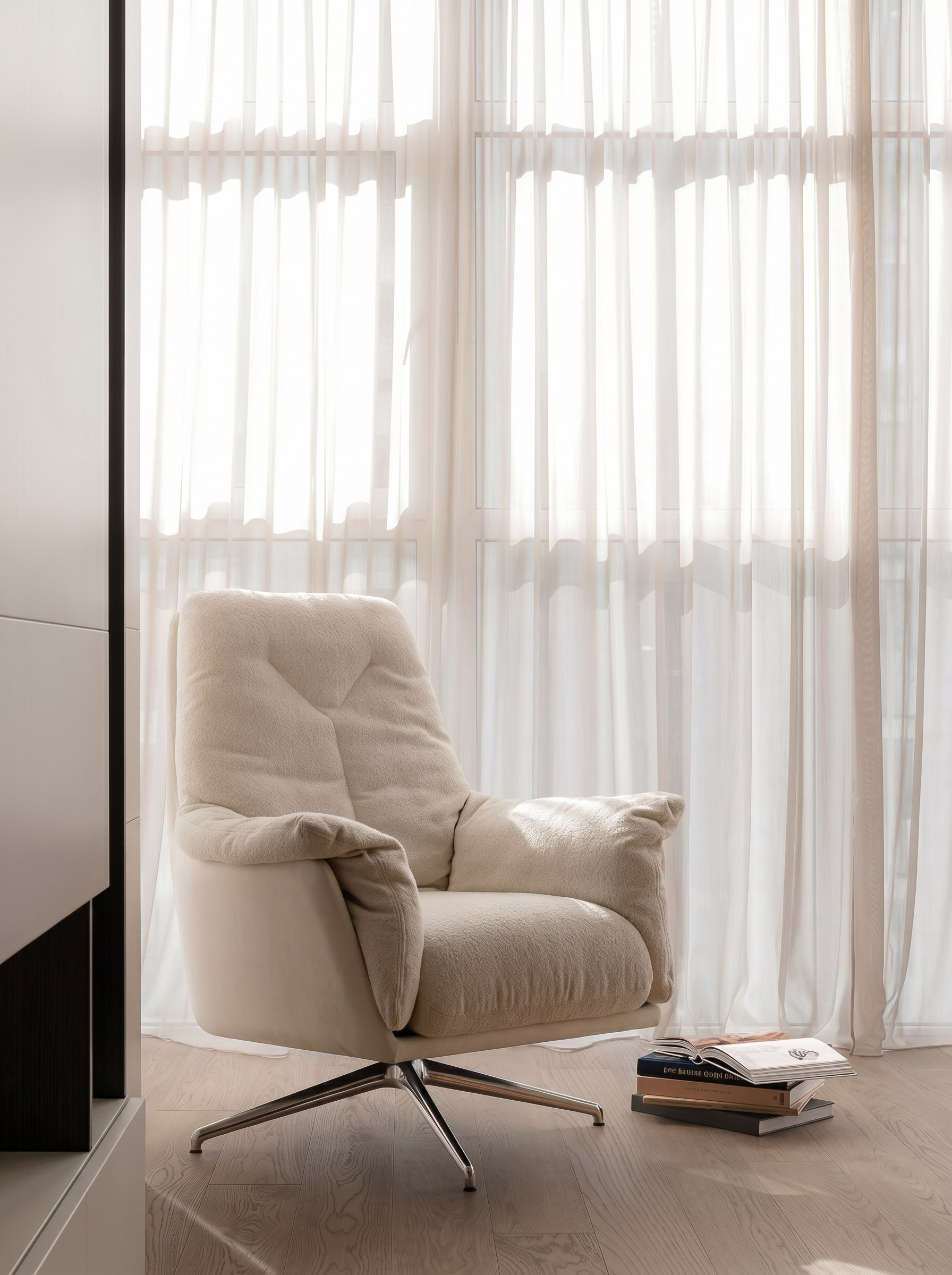 Свет выстроен многоуровнево. Днём пространство наполнено мягким естественным освещением, которое проходит через большие окна и лёгкий текстиль. Вечером интерьер раскрывается через встроенные световые линии, подсветку мебели, ниш и локальные акцентные источники. Именно такая работа со светом делает квартиру визуально дороже и помогает каждой зоне звучать по-своему.