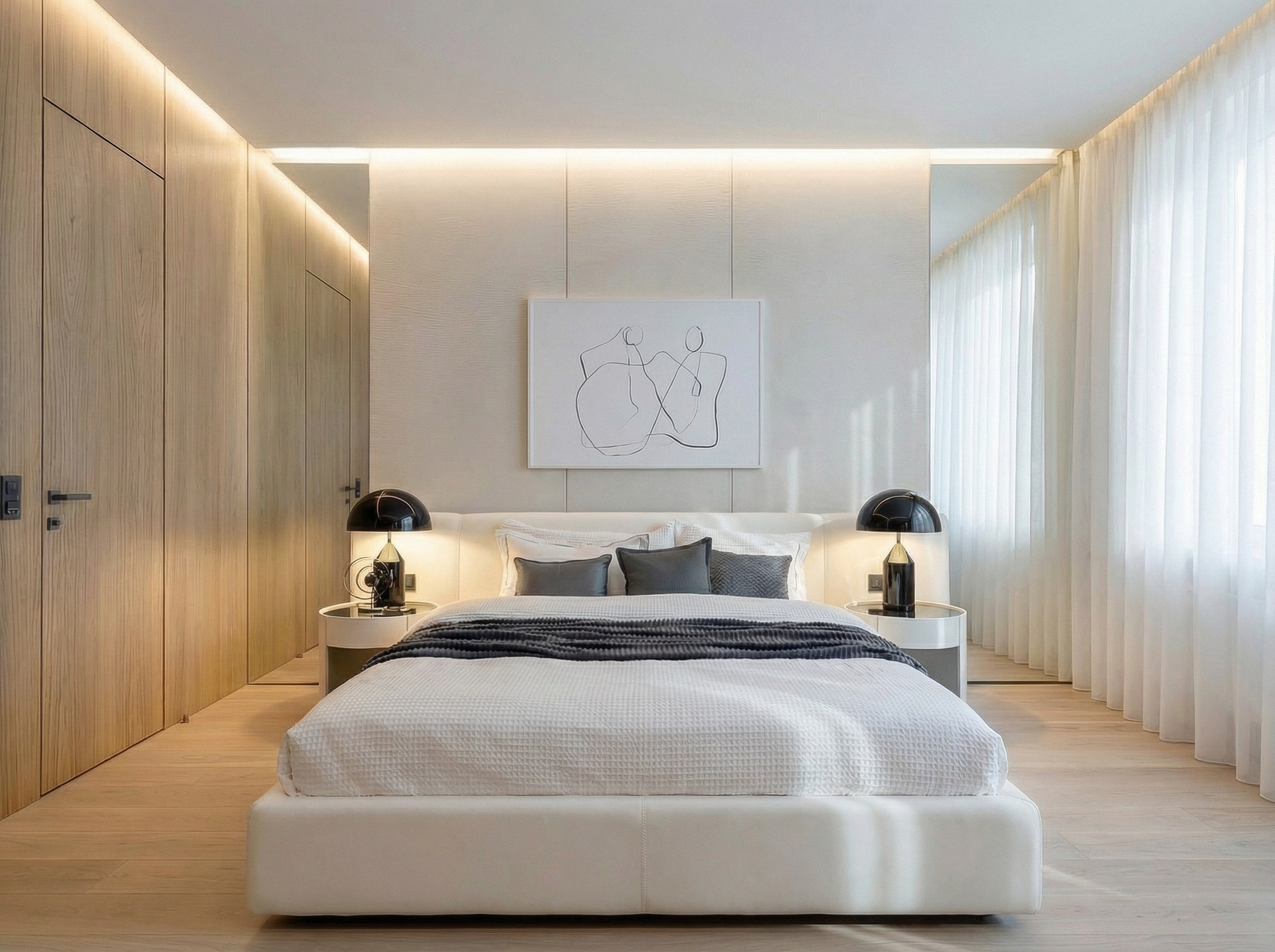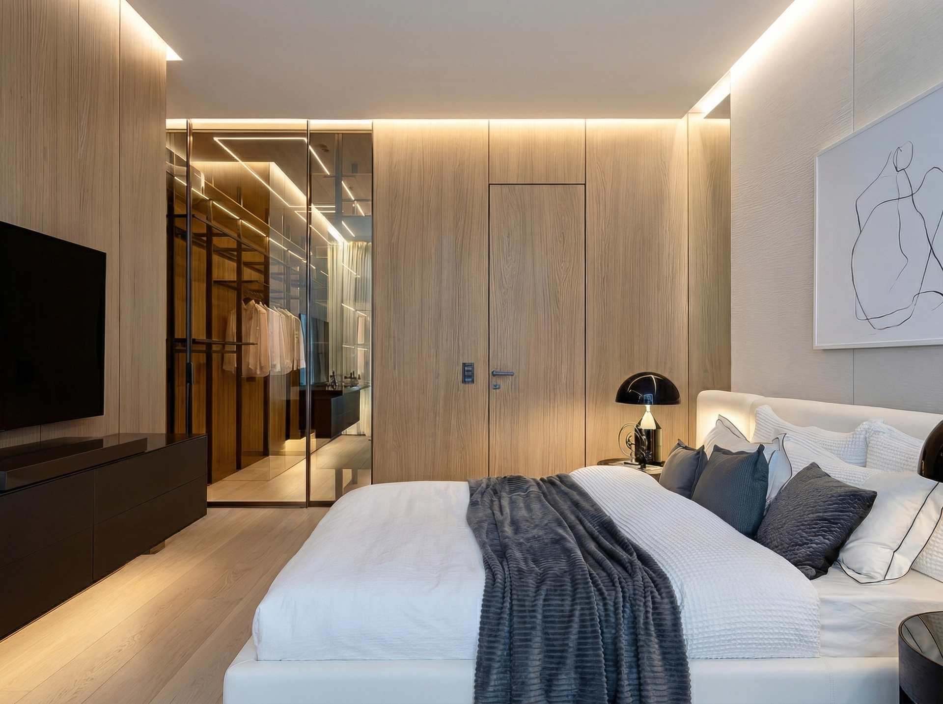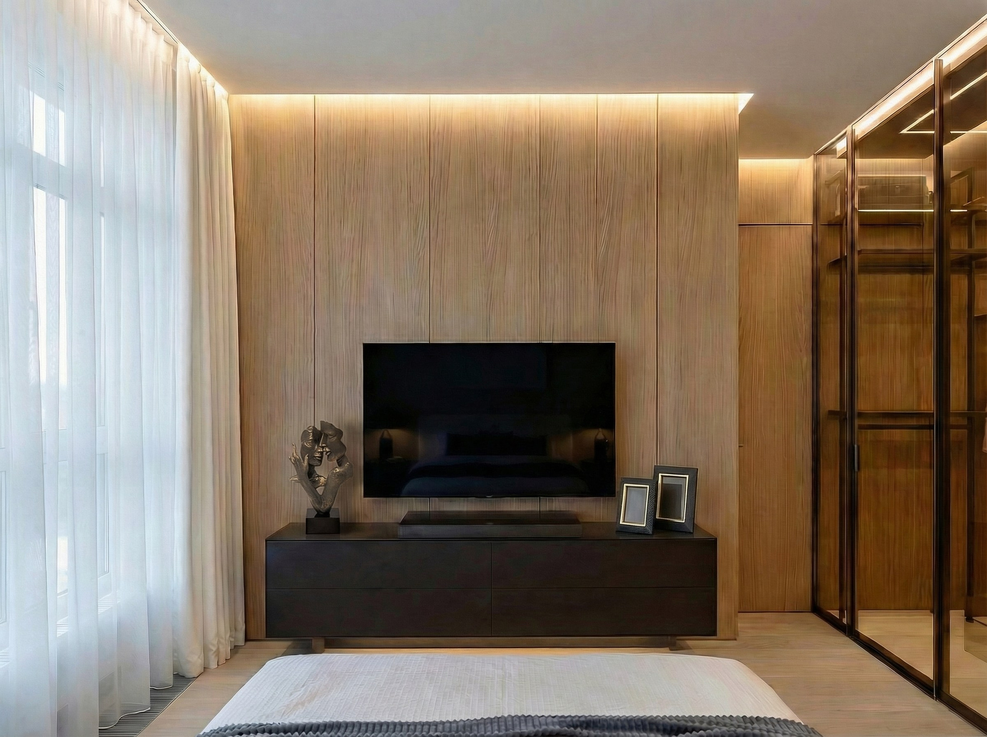 Приватная зона мастер-спальни спроектирована как камерное пространство для глубокой релаксации и тактильного восстановления. В основе решения лежит работа с безупречными пропорциями и мягкой световой режиссурой, исключающей визуальную нагрузку. Архитектурный ритм, заданный шпонированными панелями и спокойной монохромной палитрой, создает ощущение защищенности и тишины, позволяя «замедлиться» в ритме мегаполиса.