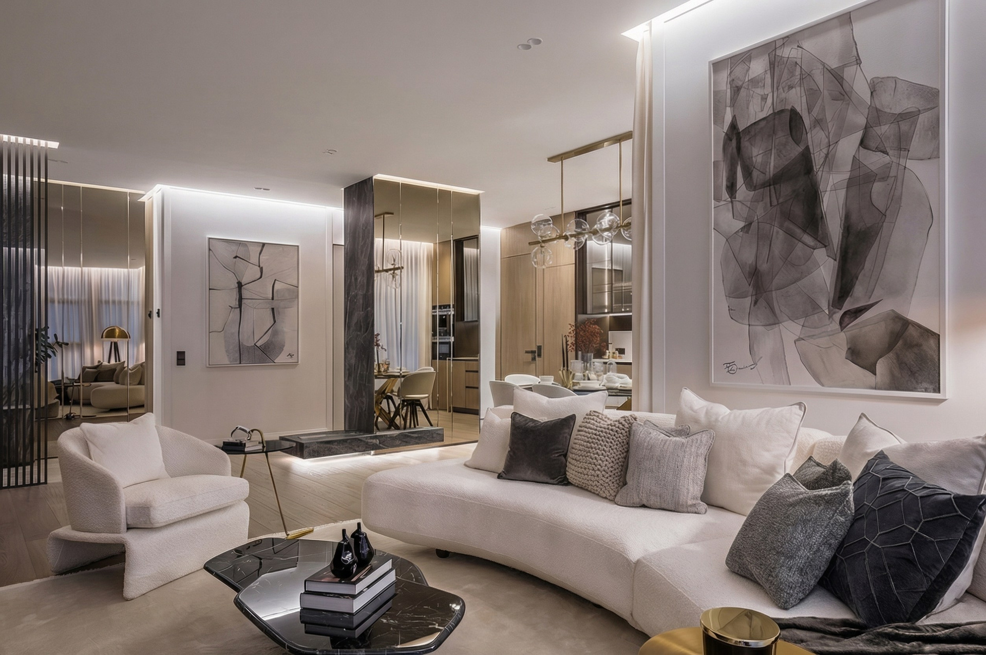 Общественное пространство решено как единая, световая и респектабельная мизансцена для жизни и светского общения. Кухонный блок деликатно интегрирован в архитектуру интерьера, мимикрируя под монолитную плоскость и не вступая в визуальный конфликт с зоной релакса. Столовая группа с выразительной фактурой камня и акцентным светом задает пространству парадный, но лишенный формализма характер.