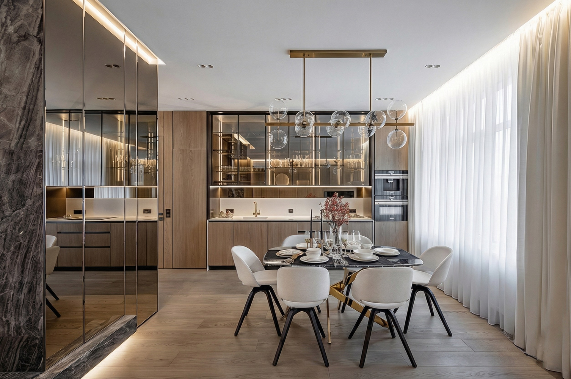 Архитектурная целостность зоны строится на синергии теплого дерева, тактильного текстиля, графичного стекла и натурального камня. Благодаря выверенным пропорциям и многослойным световым сценариям, кухня-гостиная воспринимается не просто функциональным объемом, а эмоционально наполненной и эстетически завершенной средой.