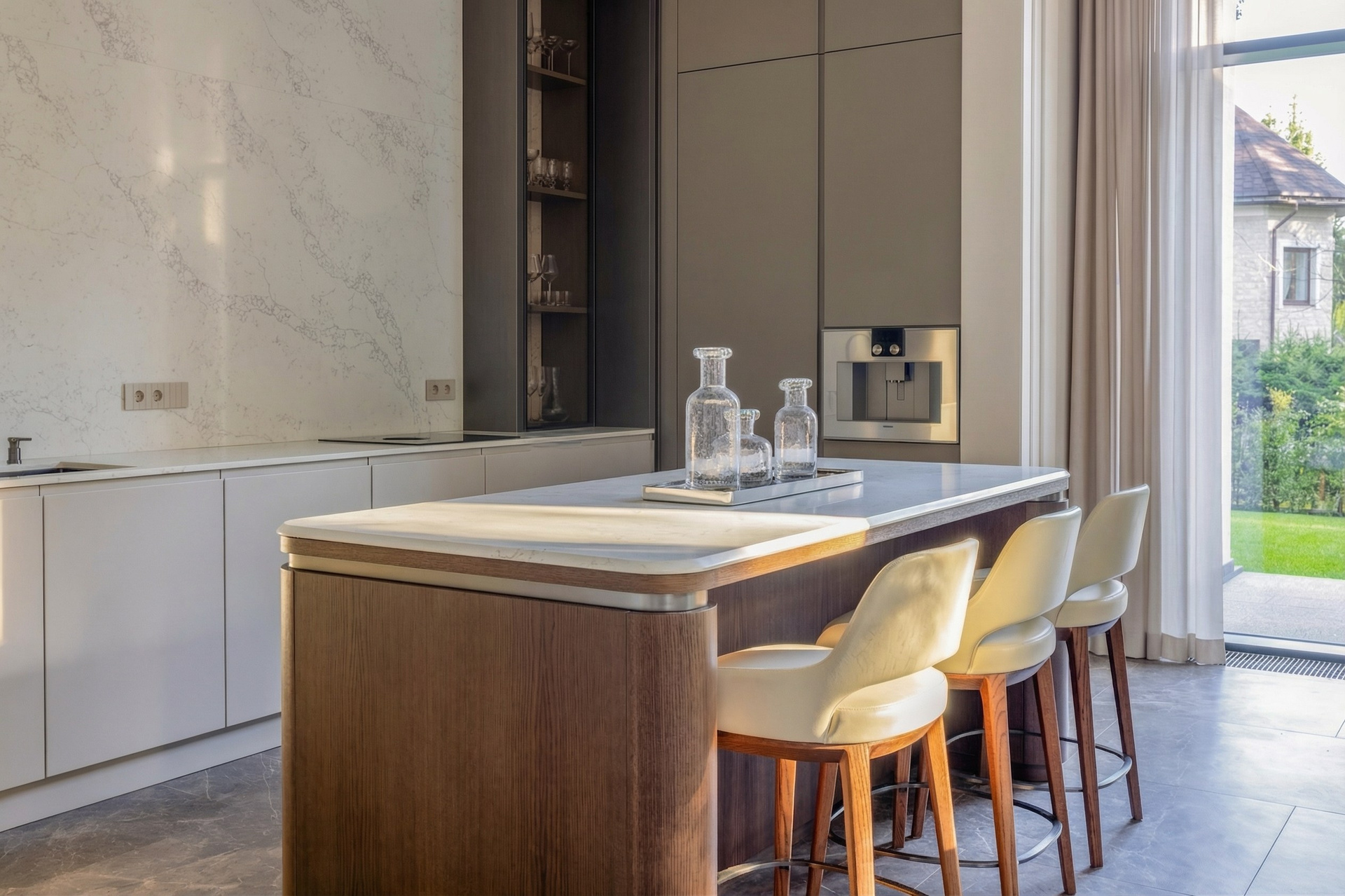 Такое решение особенно важно для частных домов высокого сегмента: кухня должна быть не только эффектной, но и грамотно организованной с точки зрения маршрутов, хранения, сервировки и ежедневного использования.