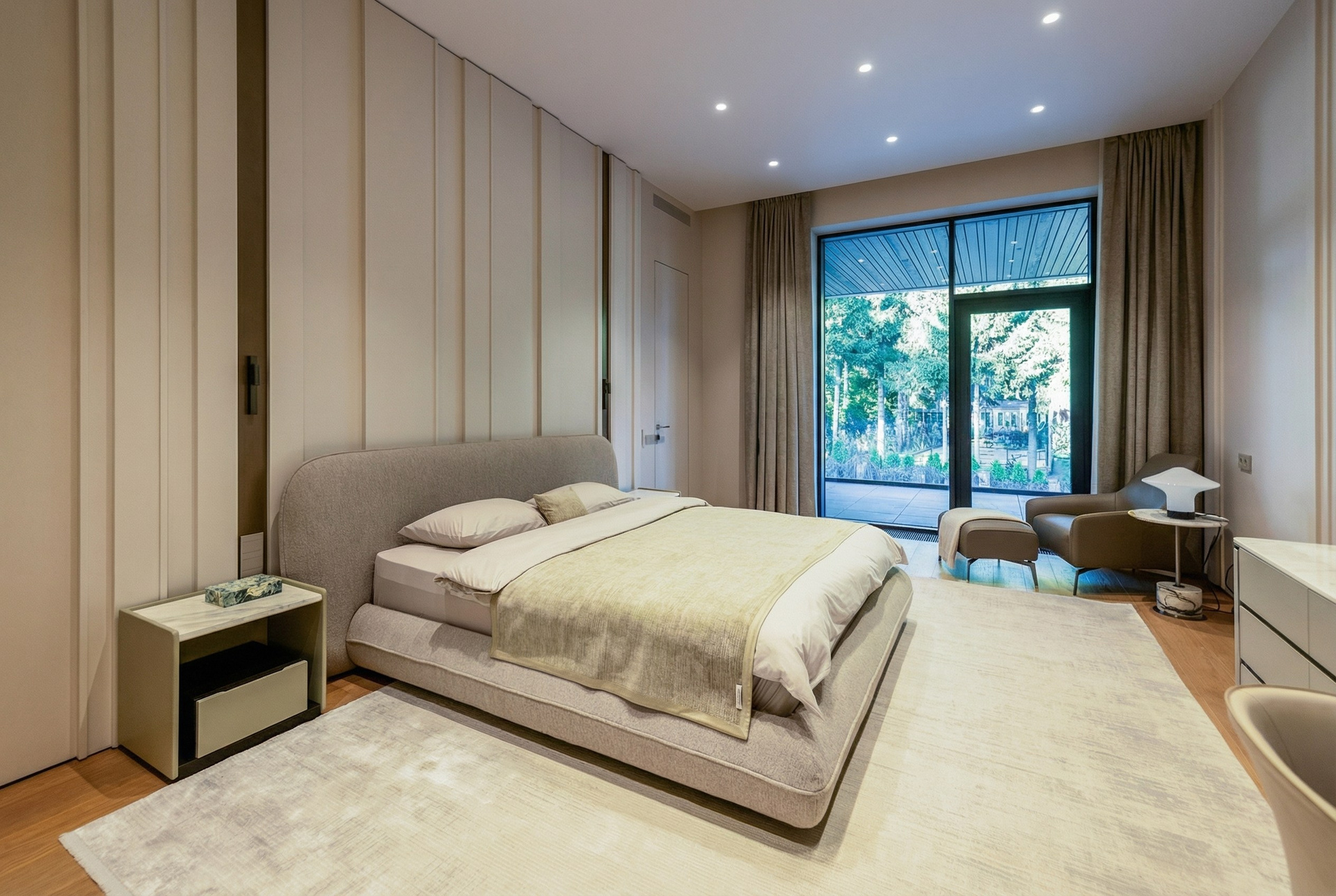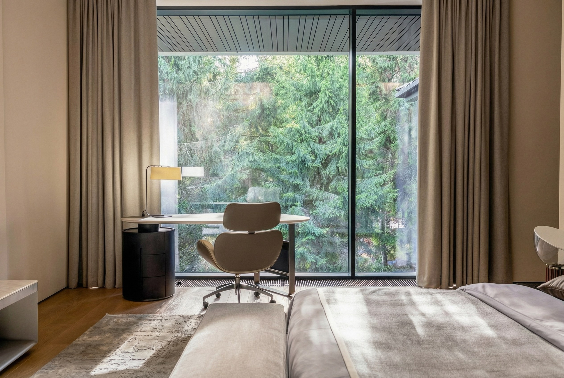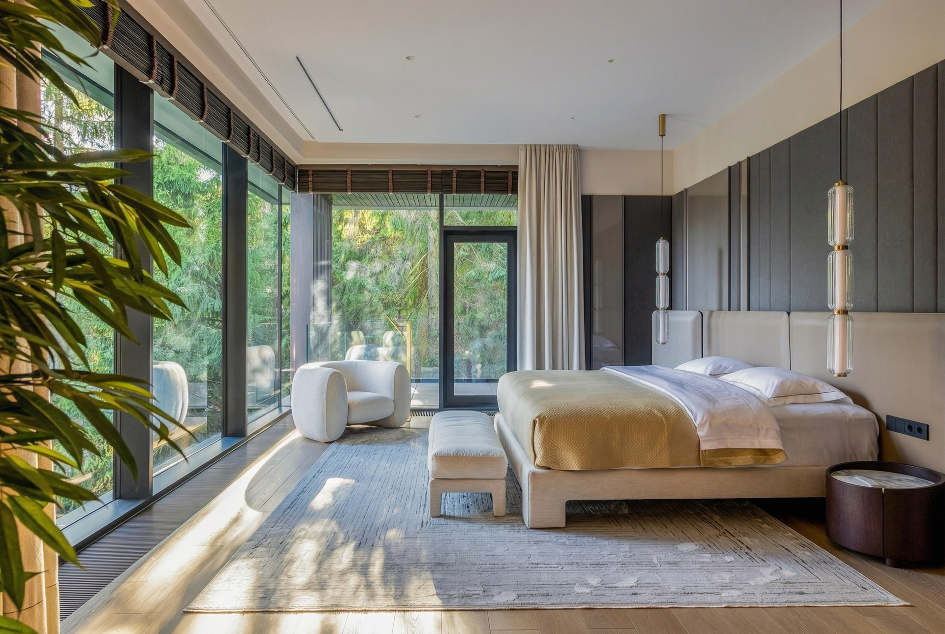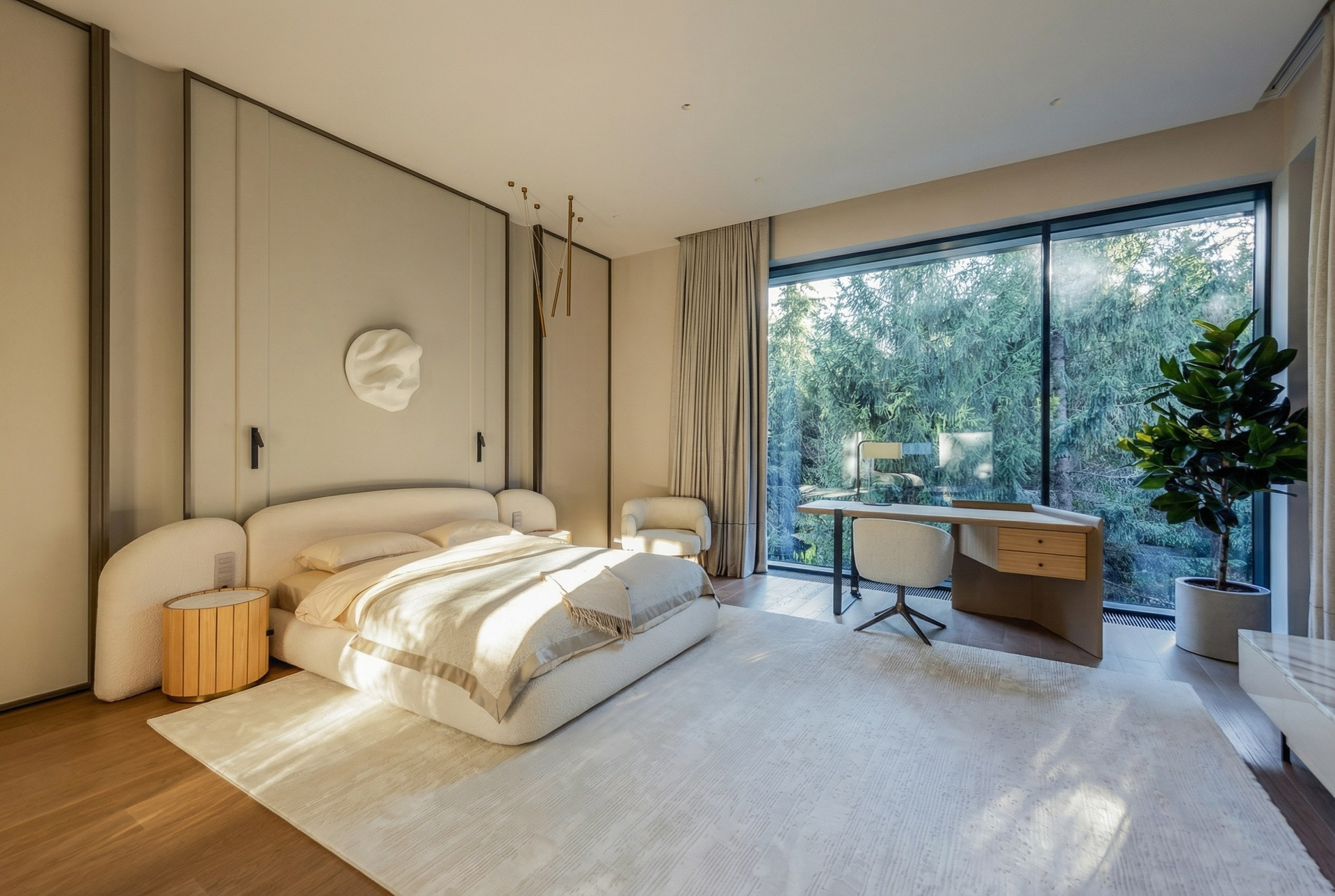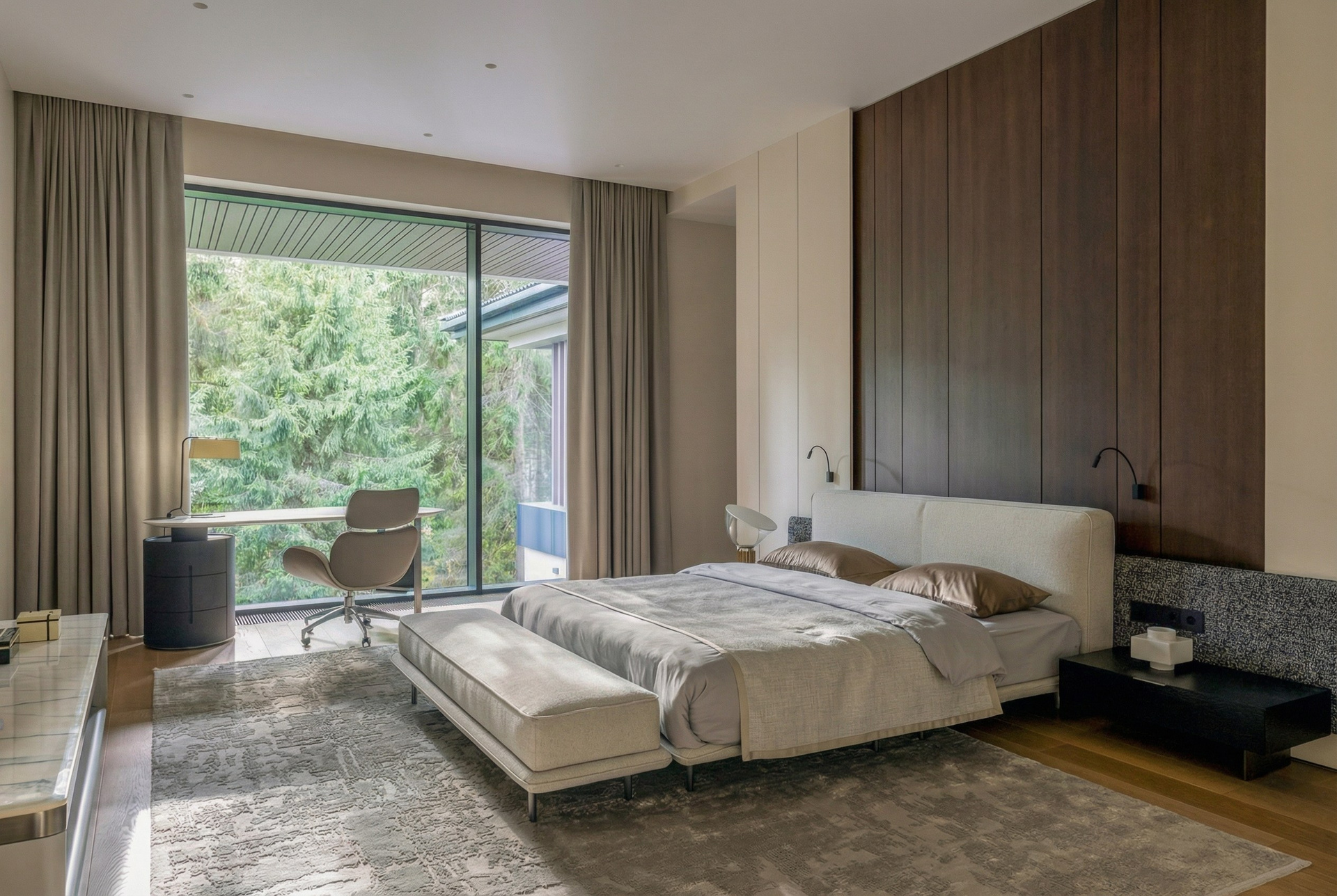 Интерьер мастер-спальни построен на мягкой пластике мебели, спокойной архитектуре стен, светлой палитре и постоянном присутствии леса за панорамными окнами. Это пространство работает через пропорции, свет, тактильность и ощущение внутренней тишины — без потребности в избыточных декоративных средствах.