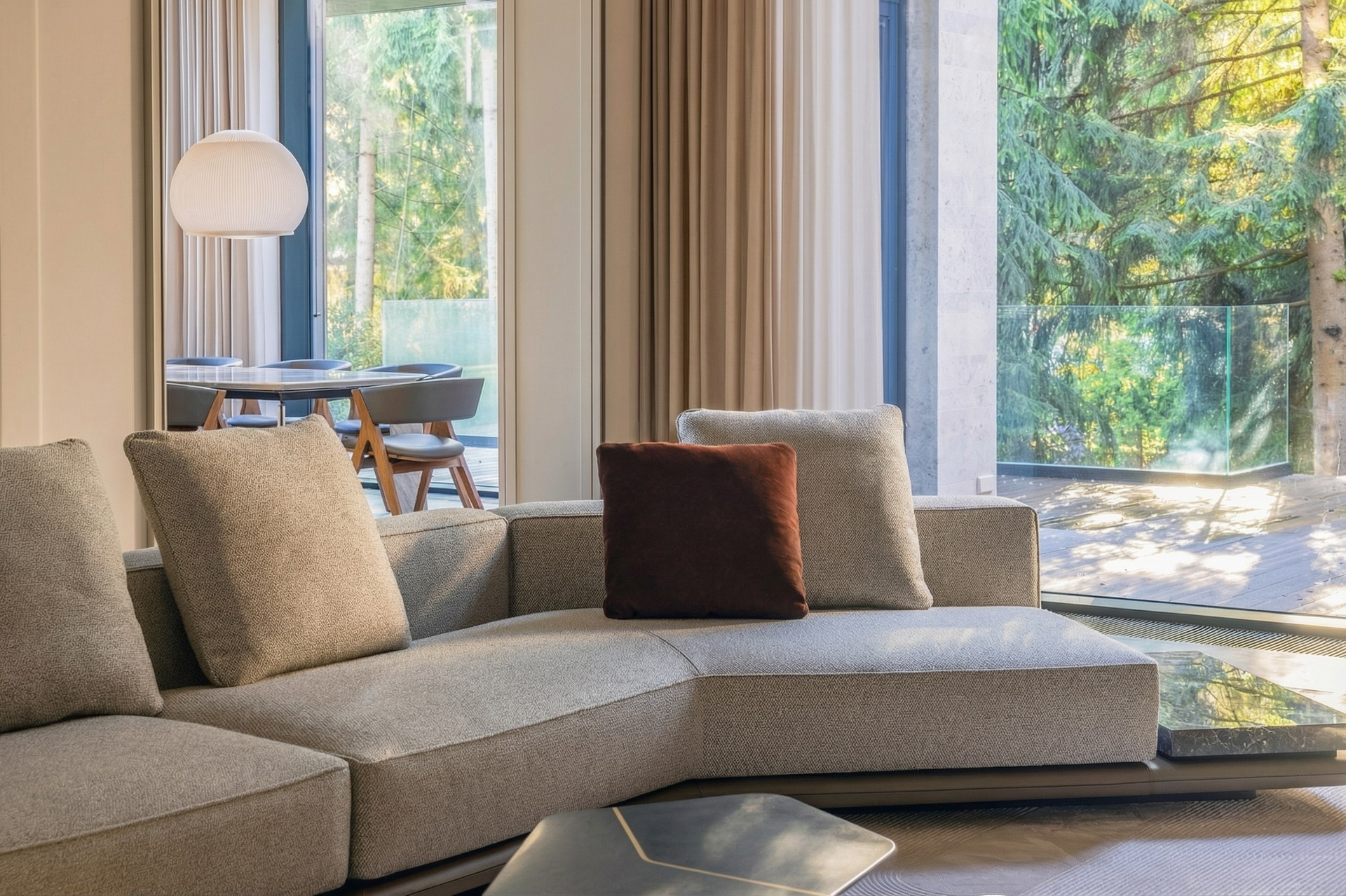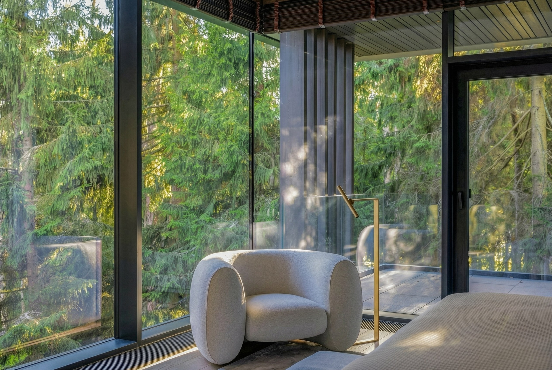 Один из ключевых принципов проекта — постоянный диалог с природным окружением. Панорамное остекление раскрывает лес как полноценную часть интерьера: виды становятся продолжением внутреннего пространства, усиливают глубину, приватность и ощущение тишины. Для резиденции такого уровня это принципиально важно: премиальность начинается не с количества предметов, а с точности пространственного решения, света и контекста.