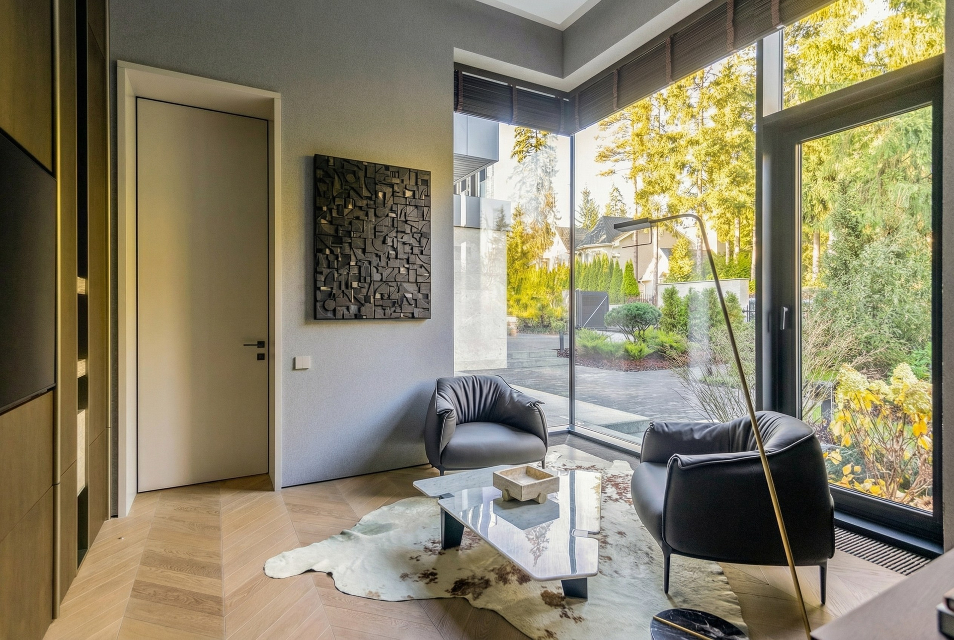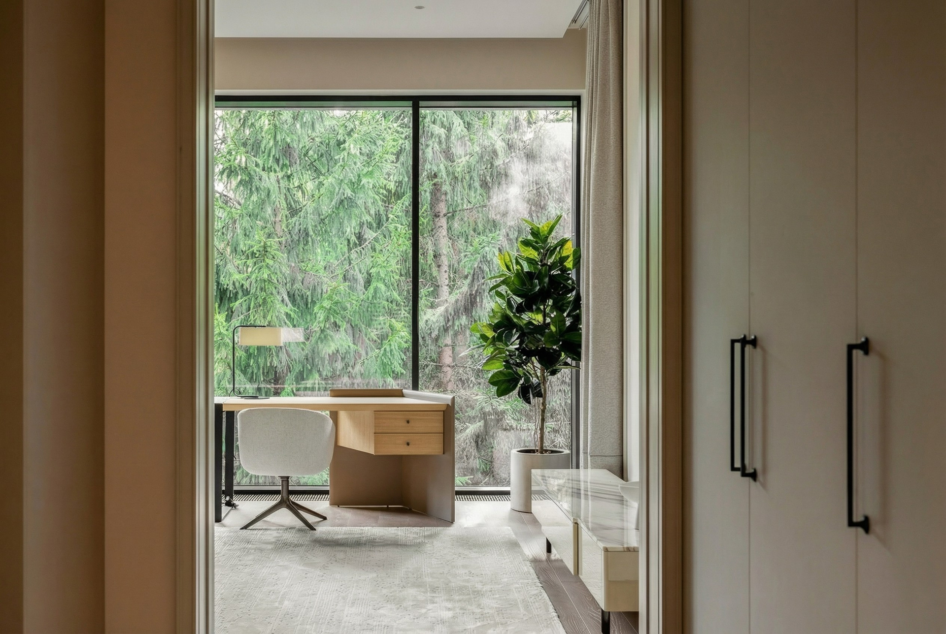 Кабинет задуман как более собранная и камерная часть первого этажа. По характеру он чуть строже, чем общественные зоны, но не выпадает из общей стилистики дома. Панорамное угловое остекление, спокойная палитра, природный вид, тёмные акценты и лаконичная предметная среда создают пространство, подходящее и для сосредоточенной работы, и для приватных встреч, и для спокойного отдыха.