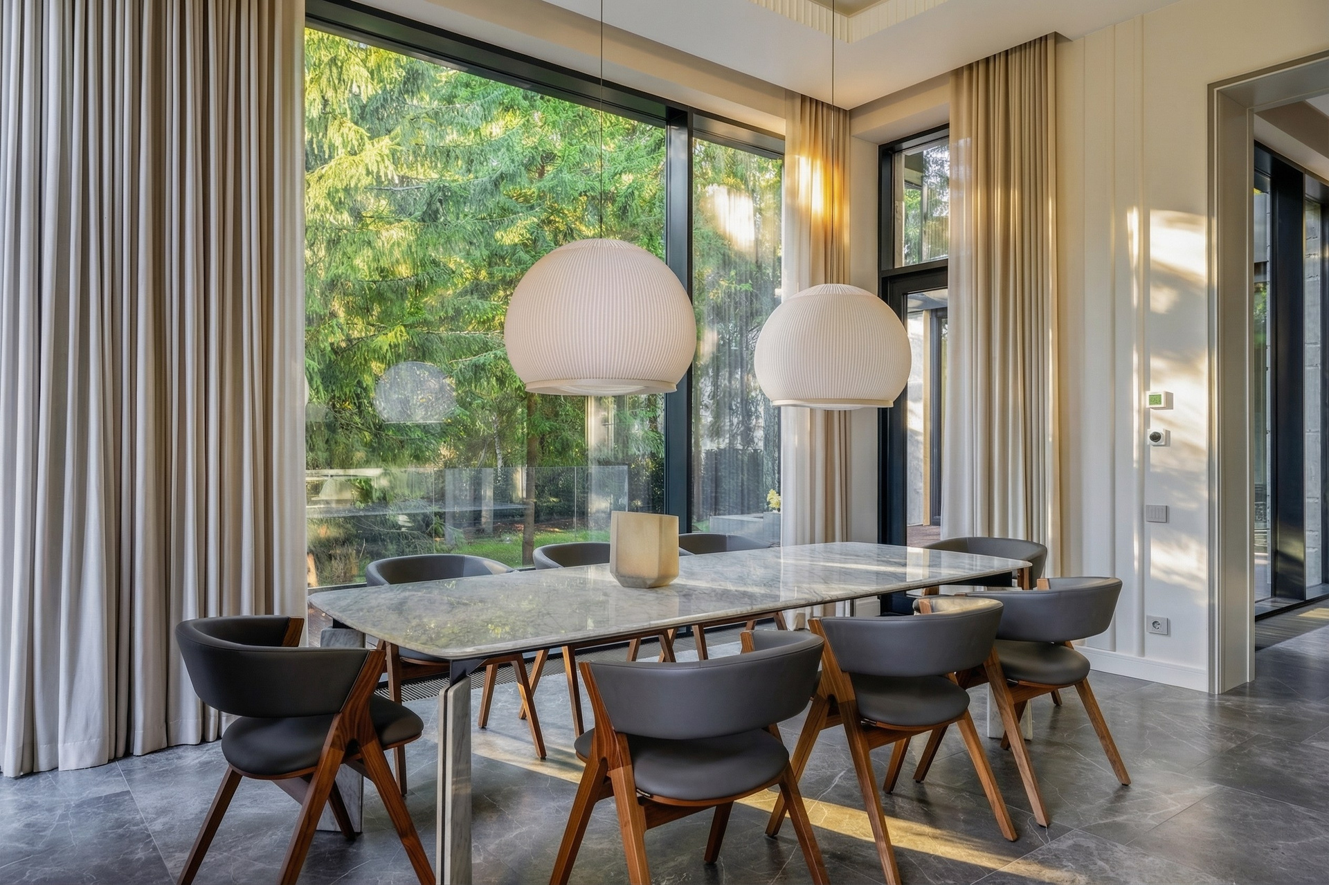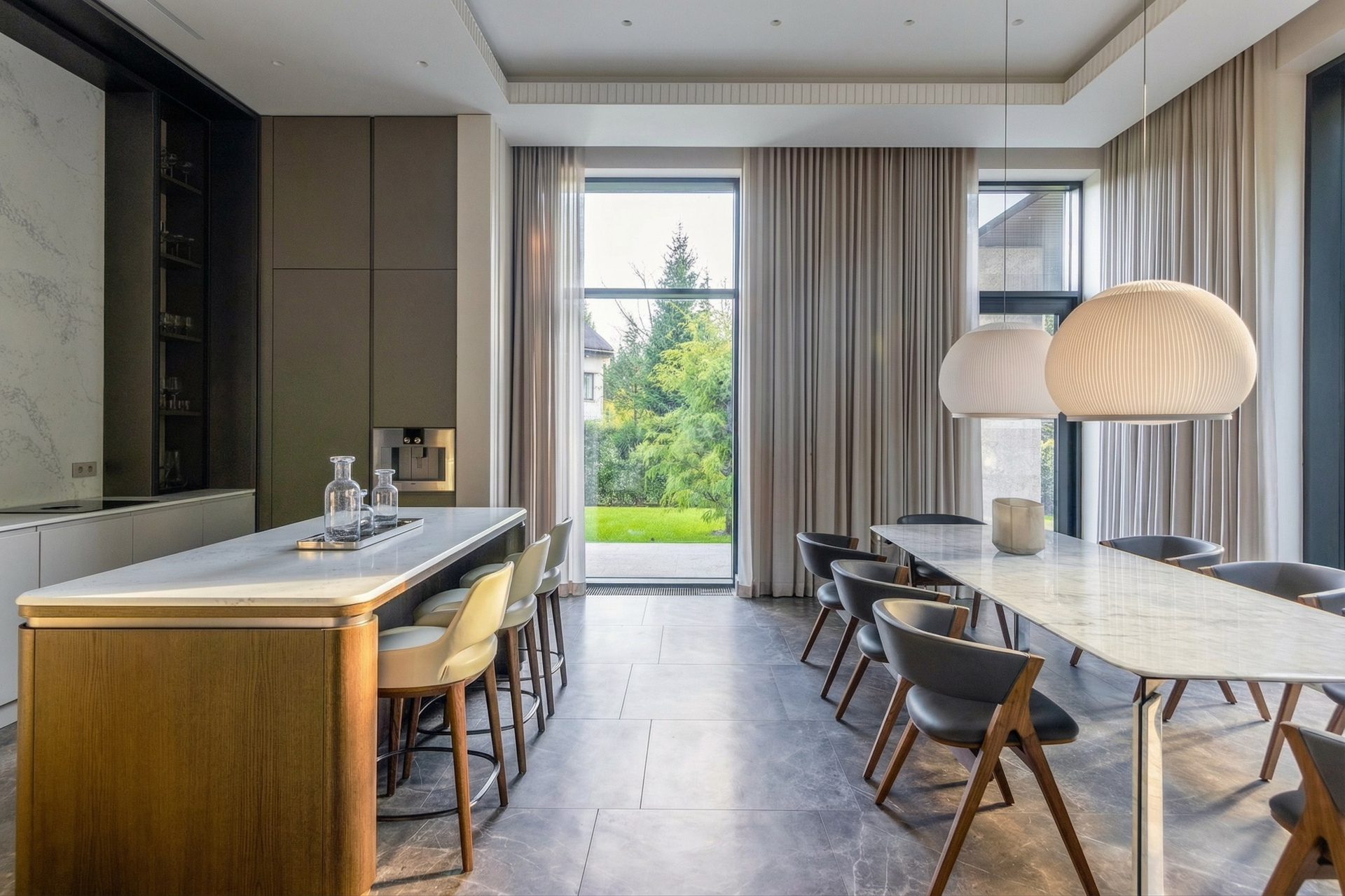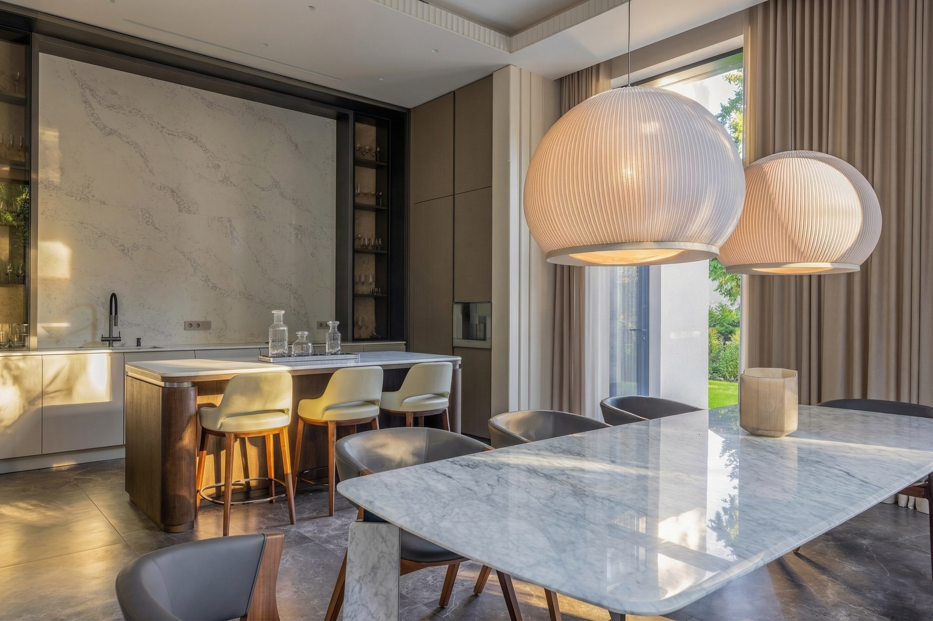 Обеденная зона расположена у панорамных окон и напрямую связана с ландшафтом. Большой стол, скульптурные подвесные светильники, остров, встроенная техника, крупноформатные поверхности и тёплые древесные плоскости формируют образ современной кухни премиального класса. Визуально пространство выглядит лёгким и собранным, но при этом остаётся полностью рабочим и удобным в эксплуатации.