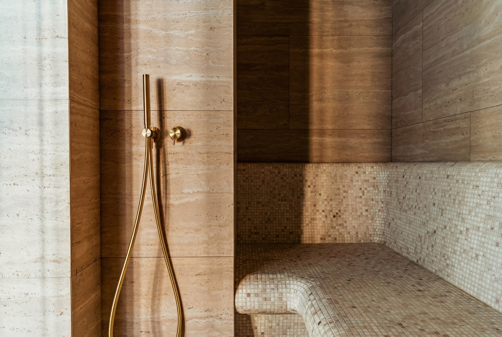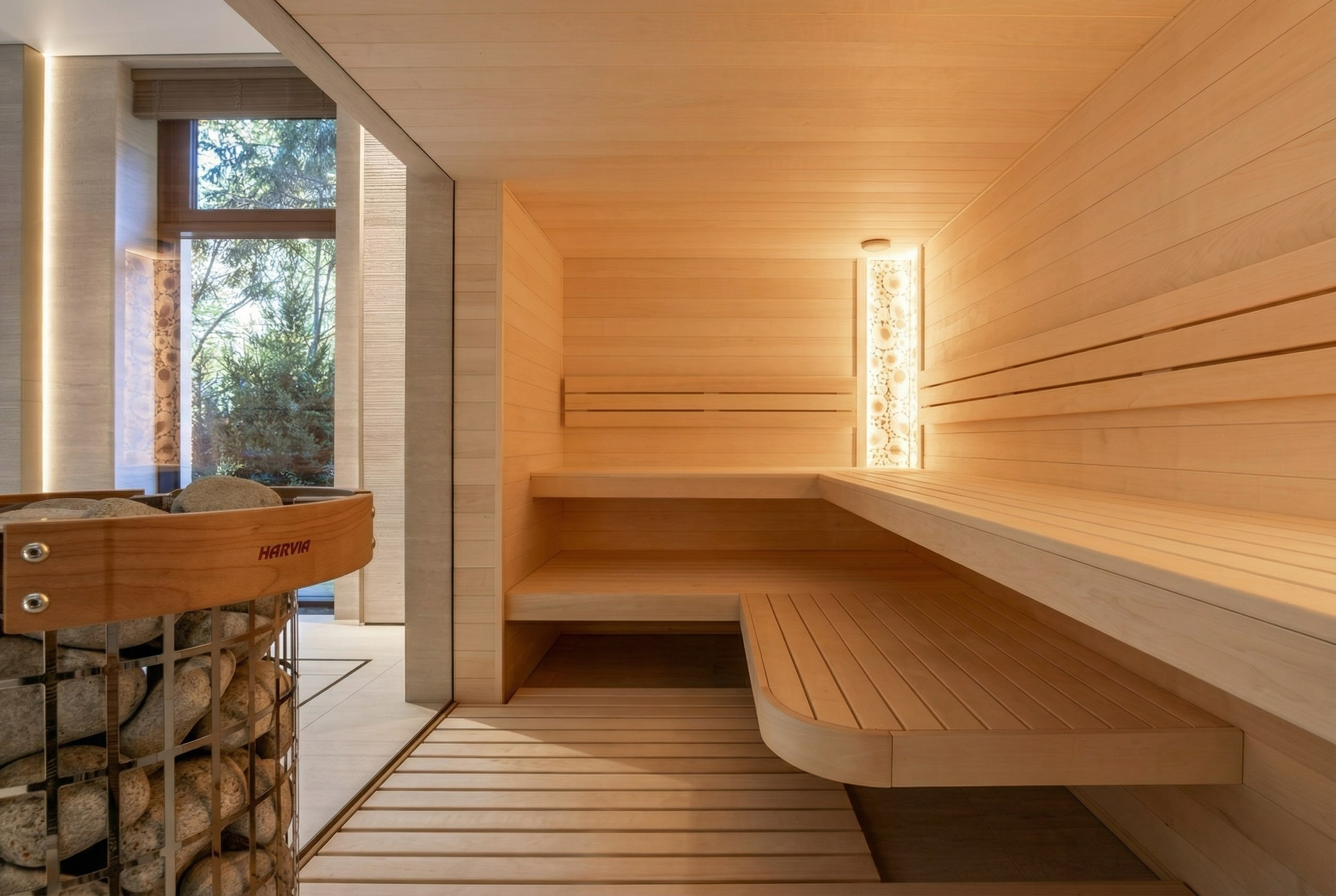 Сауна выполнена в тёплом дереве с деликатной подсветкой и чистой геометрией полков. Хаммам, напротив, решён через более плотную фактуру камня и мозаики, что создаёт обволакивающую, почти ритуальную атмосферу. В совокупности эти решения формируют сильный wellness-сценарий и существенно повышают качество жизни в доме.