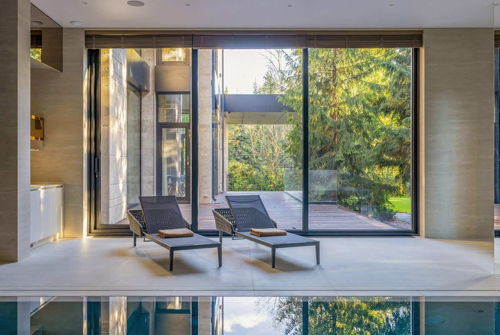 SPA-блок стал одной из ключевых ценностей проекта и потребовал особенно внимательной проработки. Пространство бассейна длиной 12 метров, сауна, хаммам, связь с террасой и виды на лес формируют полноценную wellness-среду внутри дома. Здесь важно было соединить архитектурную выразительность, расслабляющую атмосферу и техническую надёжность.