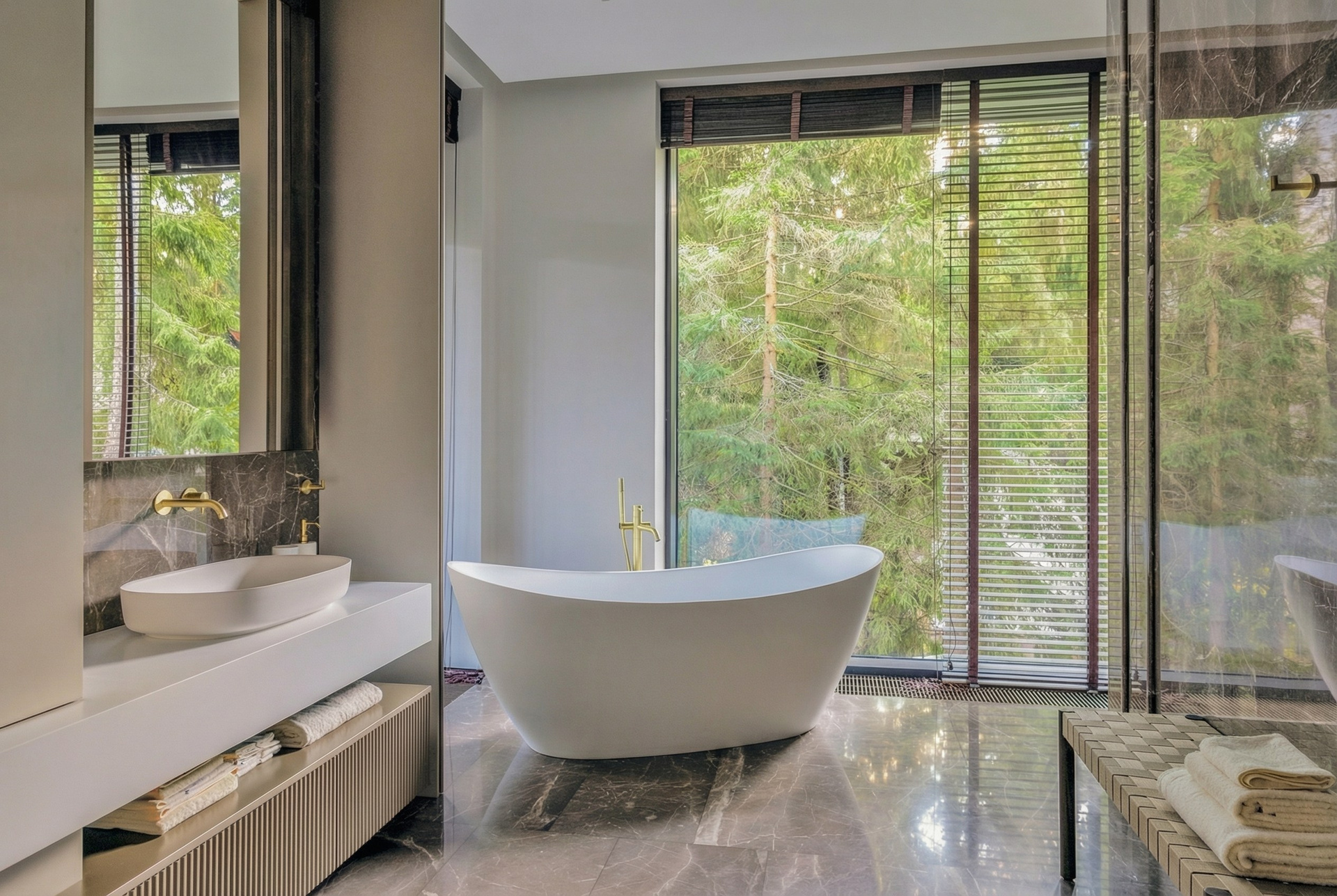 Отдельно стоящая ванна у панорамного окна стала одним из самых выразительных пространств проекта. Здесь особенно ясно видно, что премиальный интерьер строится не на избытке декора, а на точной композиции: вид, свет, материал и пропорции работают вместе и создают очень сильное эмоциональное впечатление.