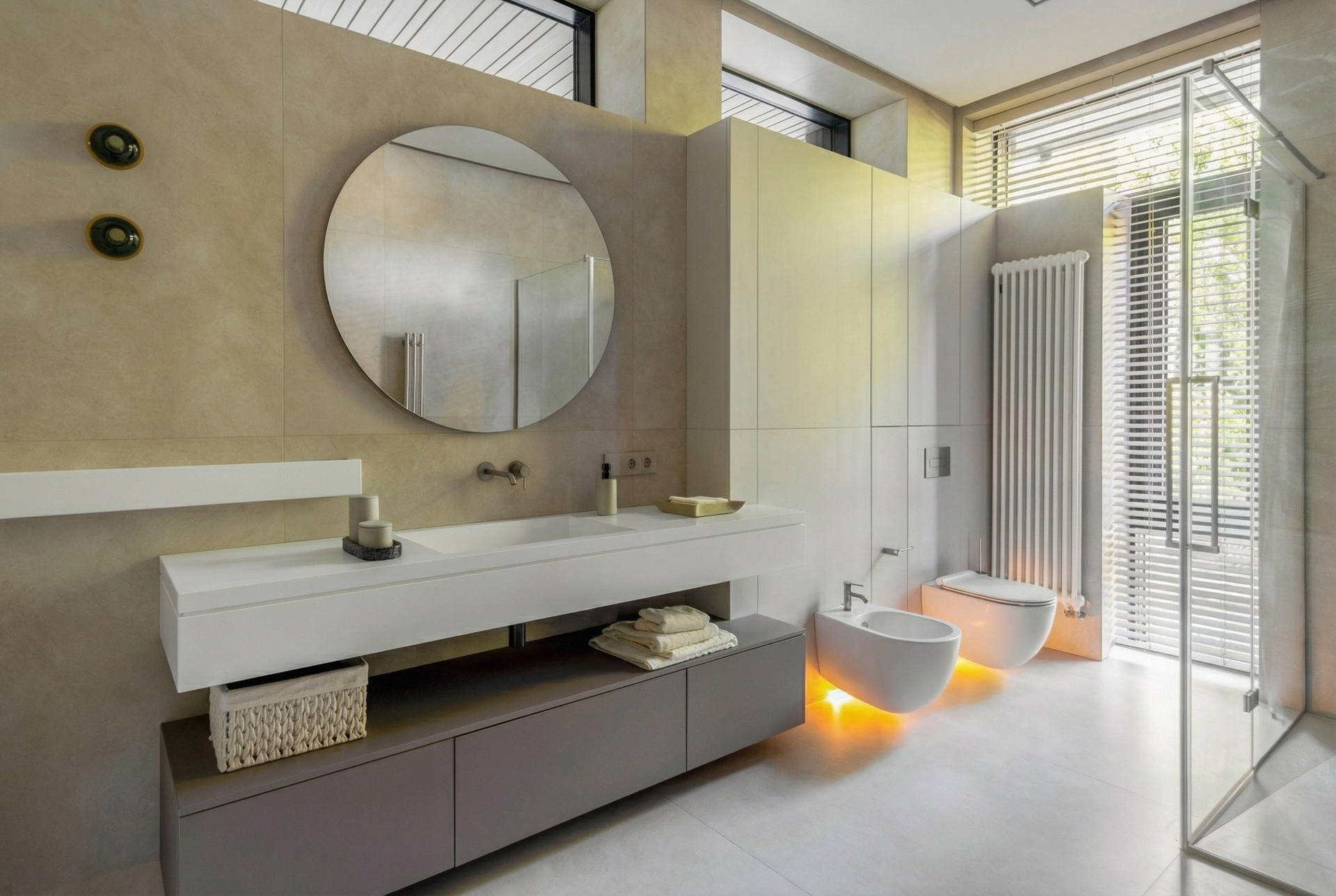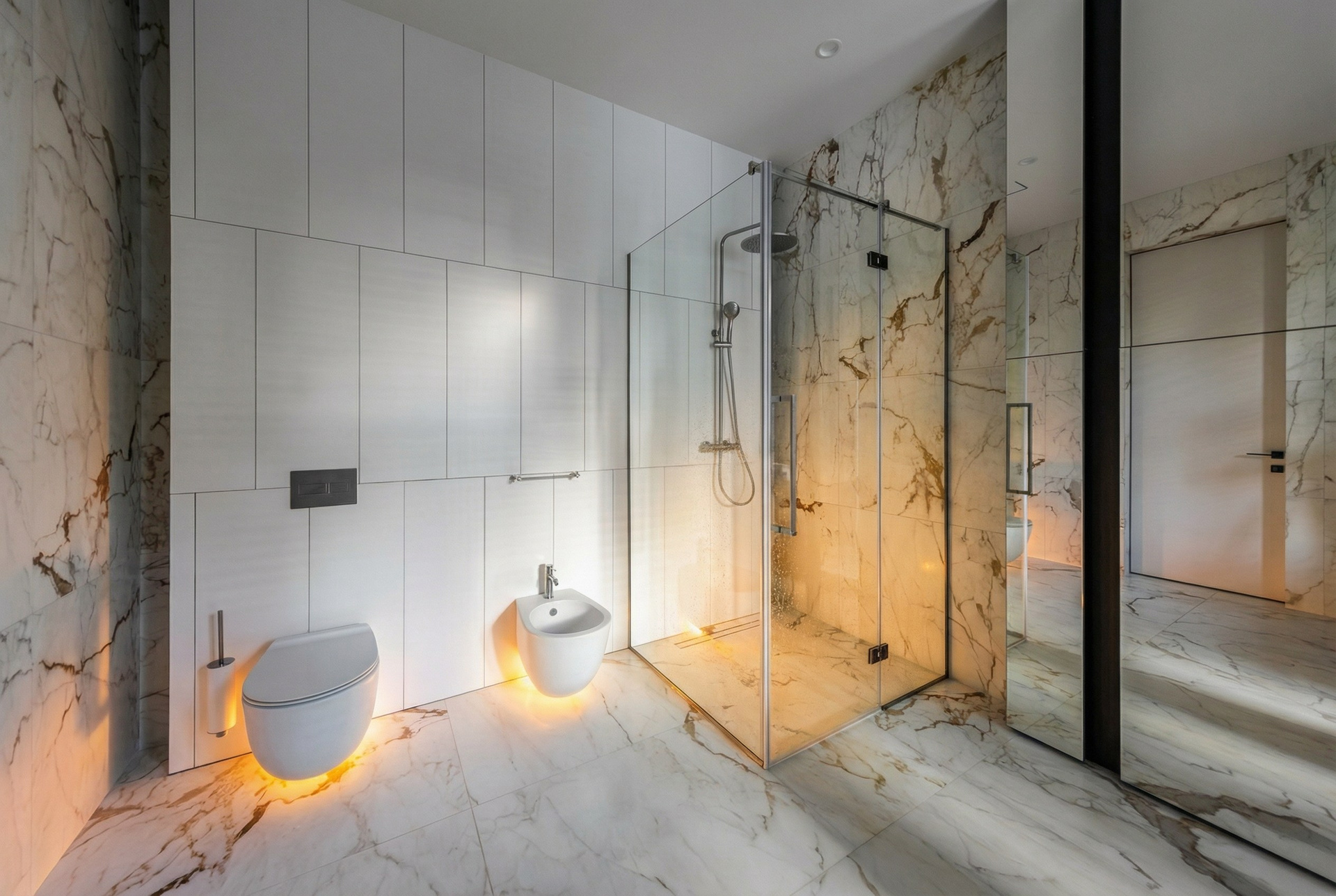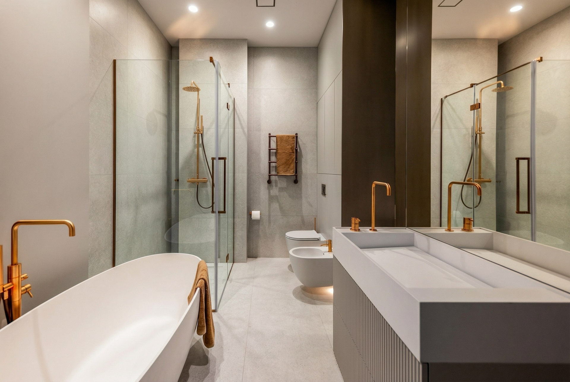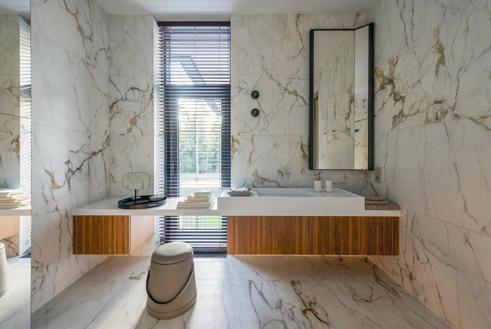 Санузлы выполнены в современной архитектурной эстетике с акцентом на крупный формат отделки, чистую геометрию, встроенную мебель и точную работу света. В одних пространствах доминирует светлый камень с активным природным рисунком, в других — более спокойные минеральные поверхности и тёплые металлические акценты. Такое решение позволило сохранить общий стиль дома, но при этом придать разным ванным свой характер.