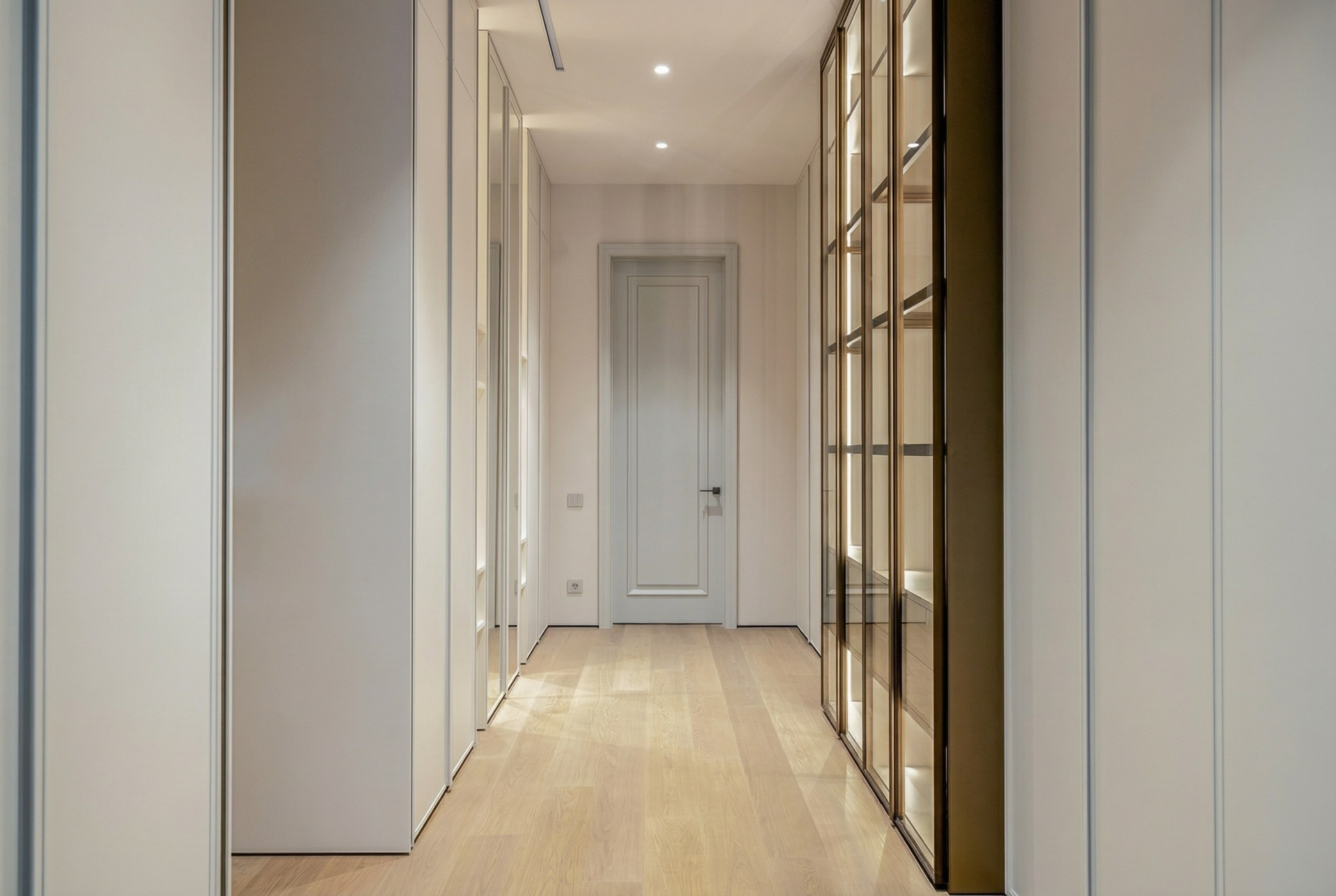 Переходные зоны, холлы и встроенные системы хранения решены с тем же вниманием, что и основные помещения. Это важный показатель качества проекта: именно такие пространства чаще всего выдают реальный уровень проработки. Здесь они не второстепенны, а встроены в общую логику интерьера, поддерживают его ритм и помогают дому восприниматься цельно.