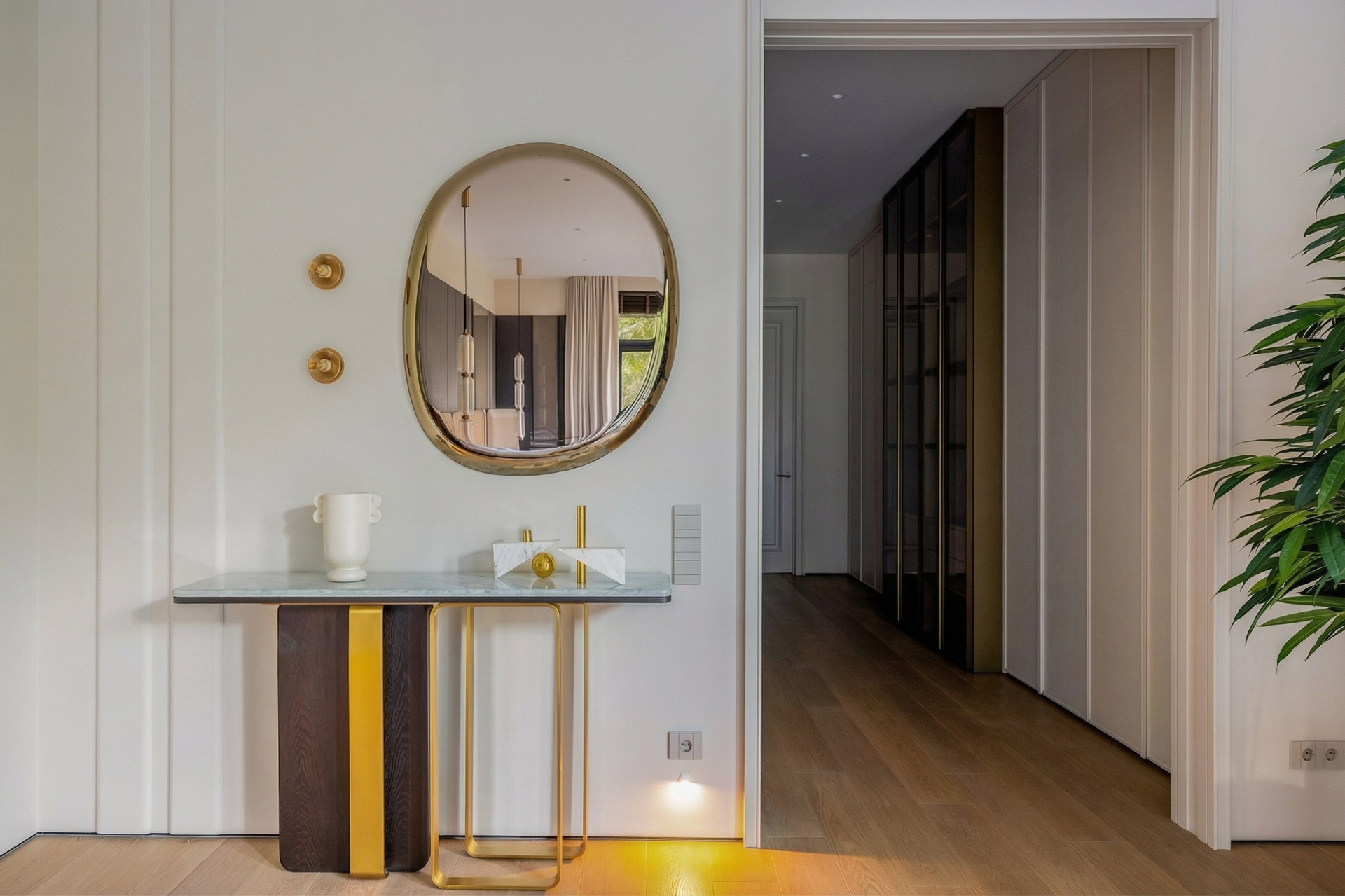 Такой подход позволил не адаптировать интерьер под готовые предметы, а, наоборот, собрать предметную и архитектурную среду под конкретную логику пространства. Для частной резиденции высокого класса это особенно важно: именно индивидуально спроектированные узлы, встроенные элементы и правильно подобранная комплектация формируют ощущение цельности, дисциплины и настоящего качества.