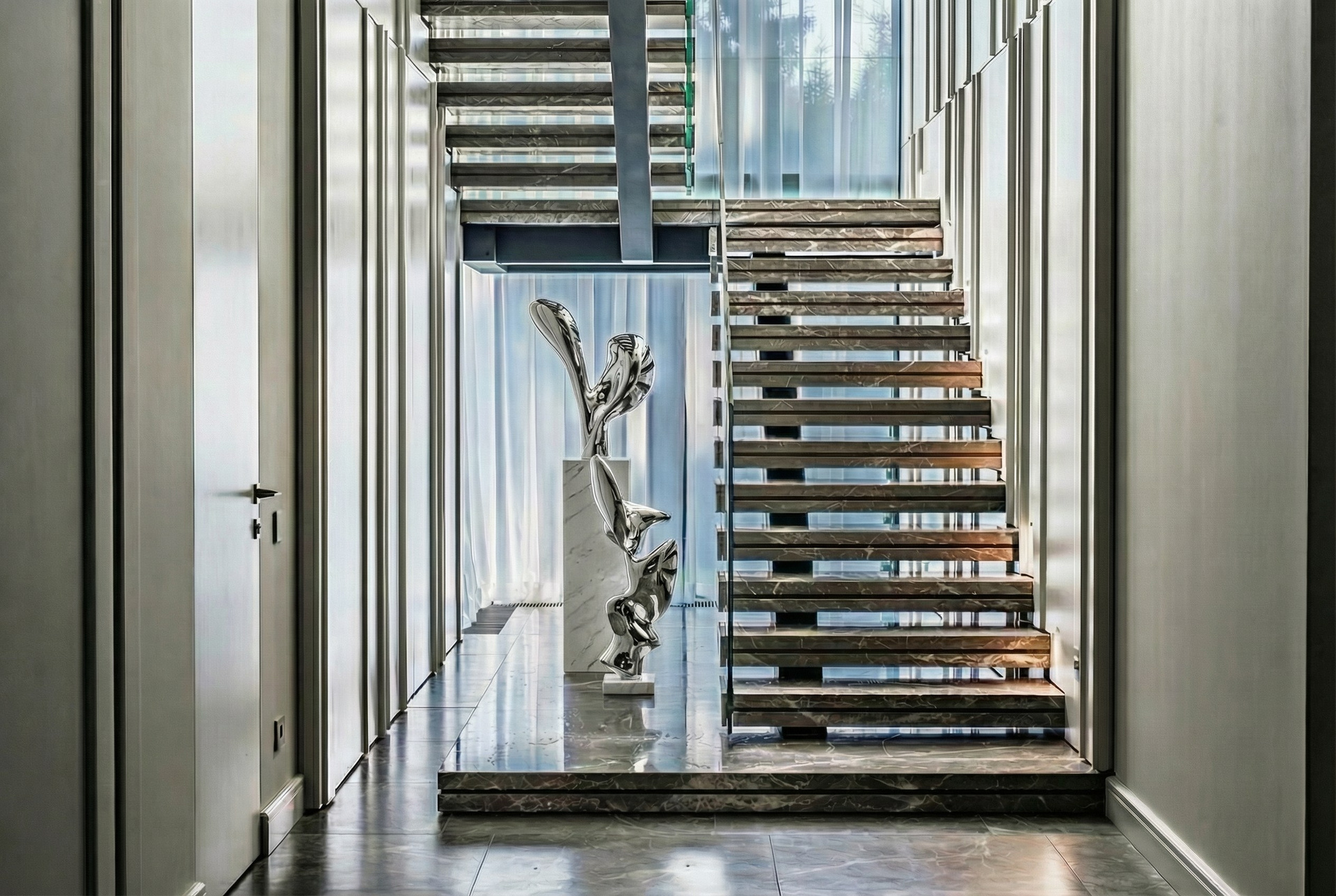 Лестничный холл в этом проекте — не просто коммуникационная зона, а самостоятельный архитектурный эпизод. Подвесная лестница, стеклянные ограждения, тёмный камень, скульптурный объект и тщательно выстроенный свет формируют сильный пространственный жест, который сразу задаёт уровень дома.