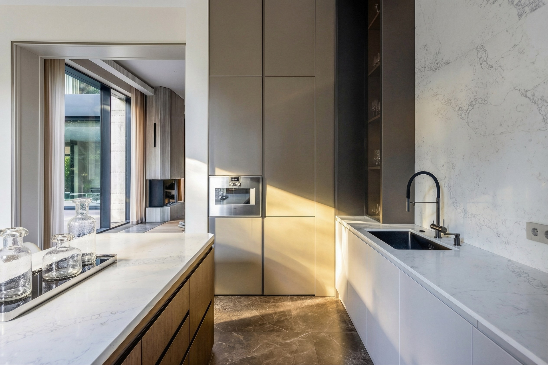 Кухонно-столовая часть решена как единый архитектурный блок, в котором эстетика и функция работают в равной степени. В проекте предусмотрены парадная и рабочая кухня, что позволило разделить представительский сценарий и повседневные процессы, сохранив чистоту пространства и высокий уровень комфорта.