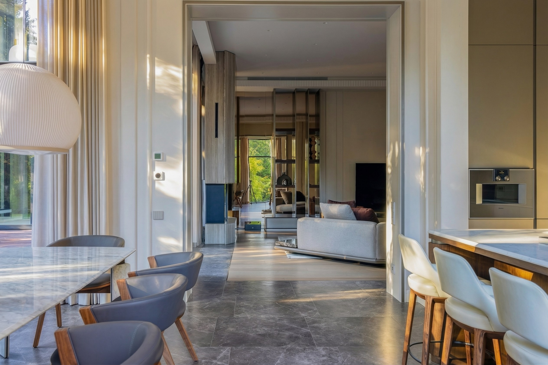 При разработке интерьера дома особое внимание уделялось зонированию, интеграции инженерных систем, связи внутреннего пространства с природным окружением и созданию устойчивой, визуально выверенной среды для жизни. Панорамное остекление, высокие потолки, индивидуально спроектированная столярка, архитектурные перегородки, премиальная комплектация и решения уровня Gaggenau, Foscarini, Minotti, Poltrona Frau, Rimadesio, Harvia и Kettal позволили сформировать интерьер частной резиденции высокого класса, в котором эстетика сочетается с реальным комфортом.