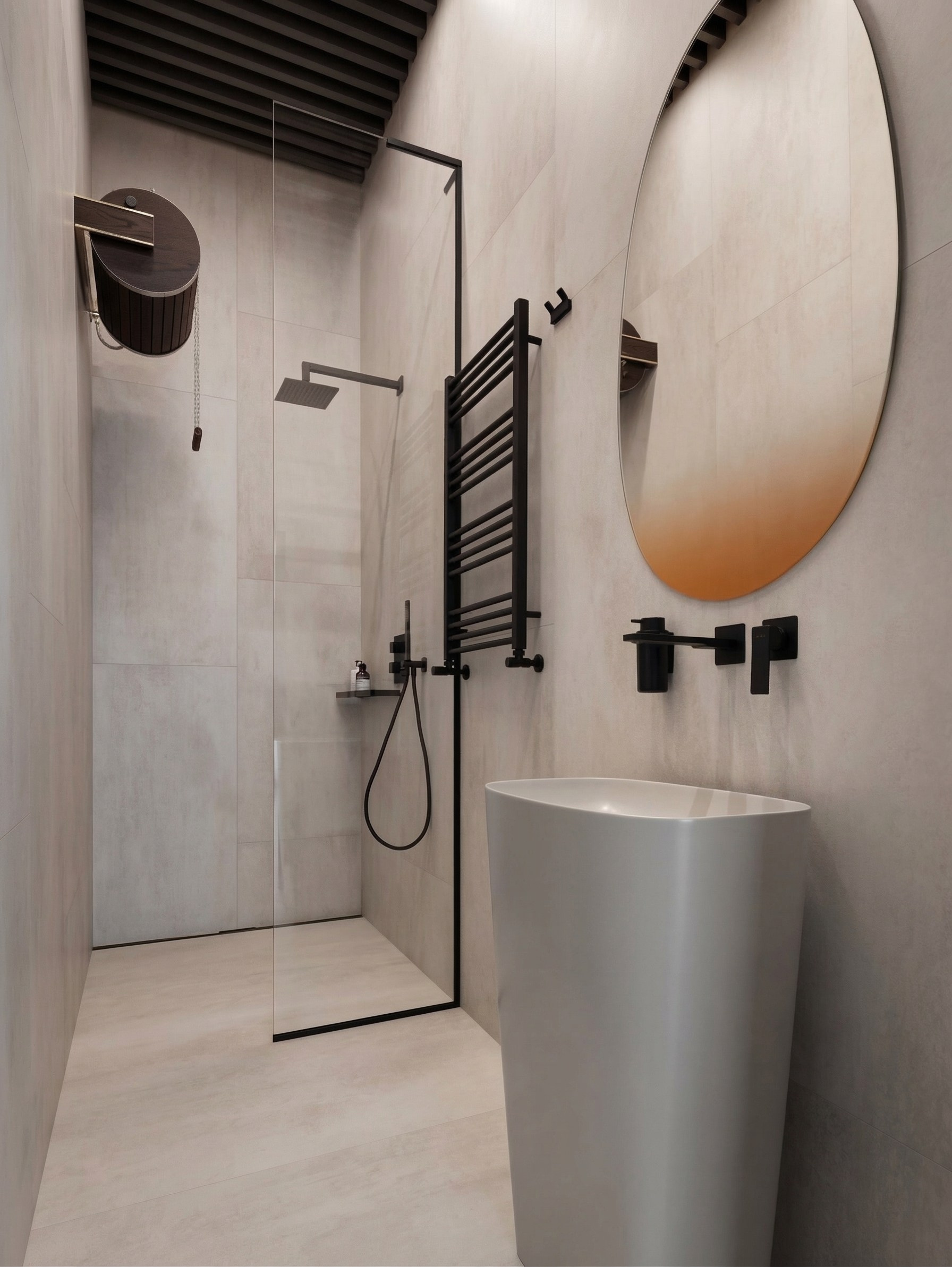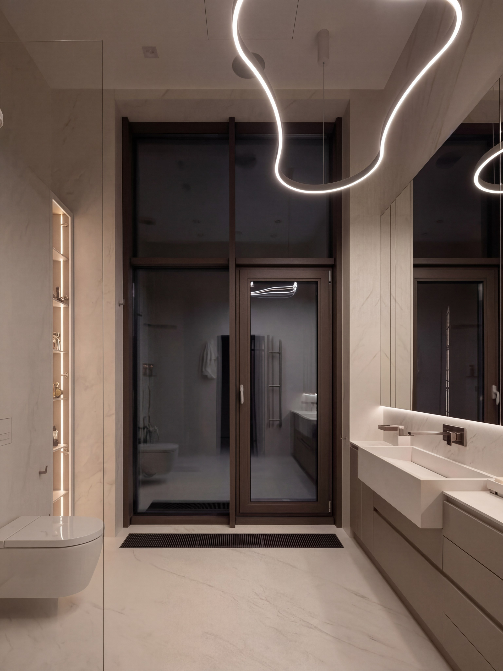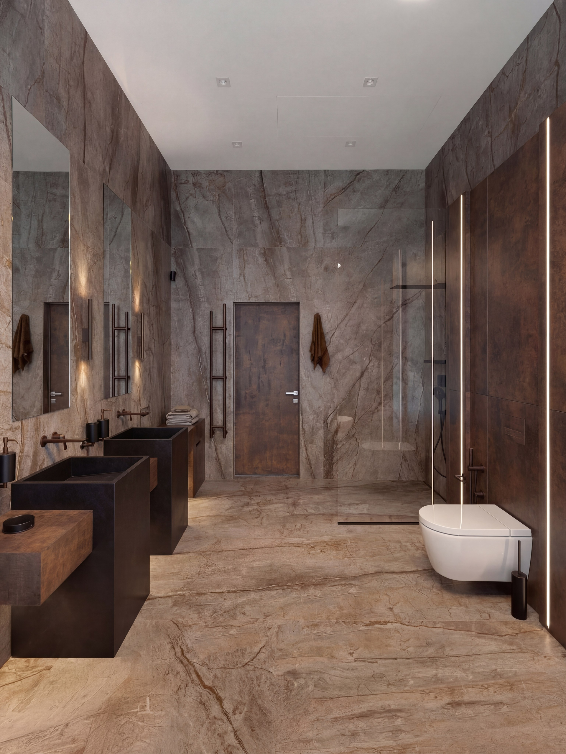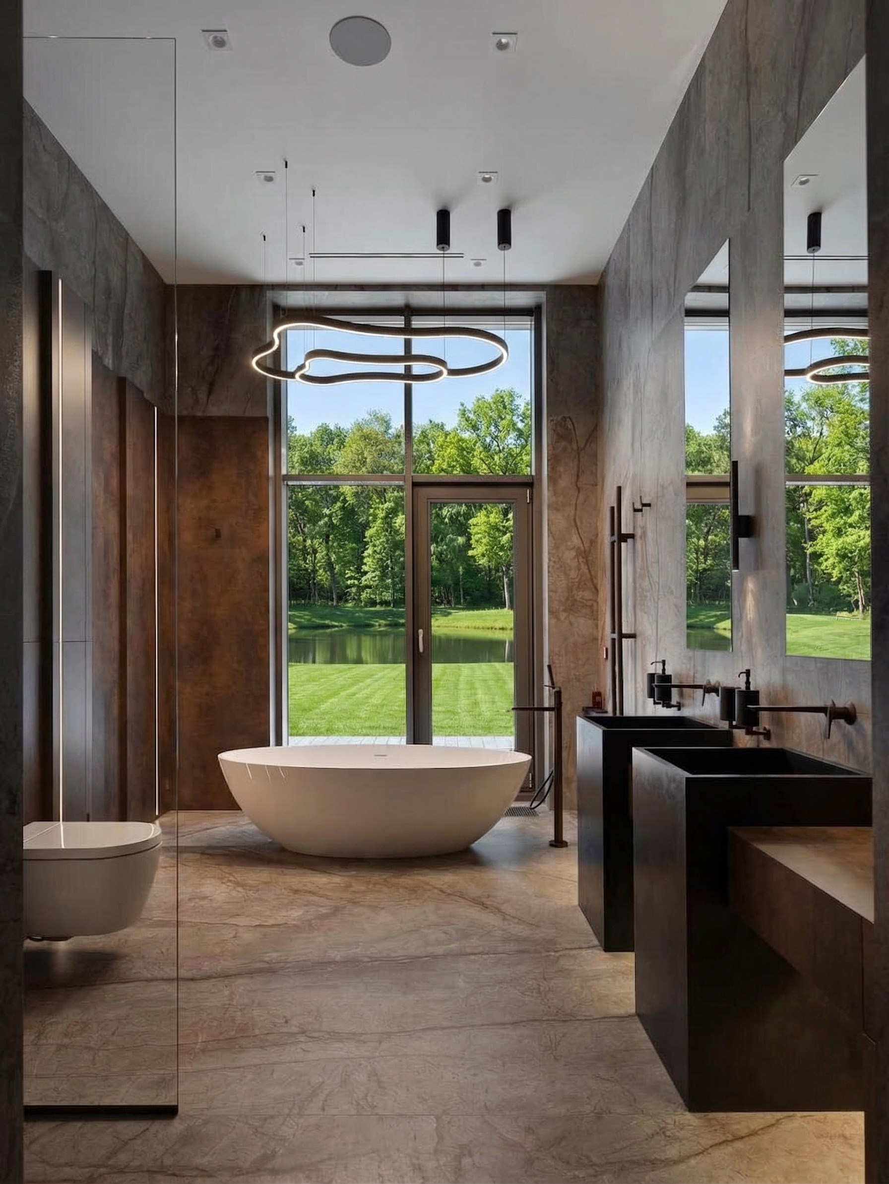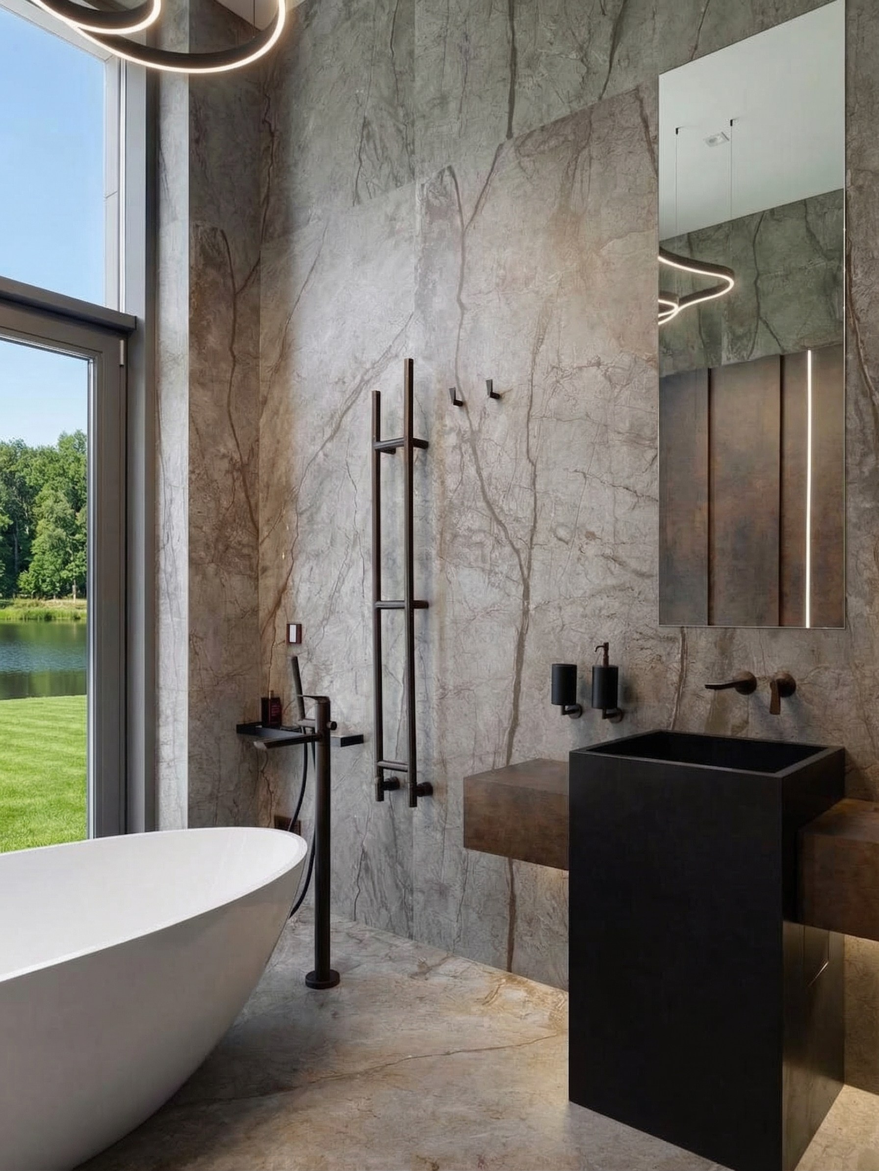 Главный акцент — тёмная мастер-ванная, решённая как полноценная частная SPA-зона. Крупноформатный камень, монолитные раковины, встроенная подсветка, выразительная сантехника и отдельно стоящая ванна у панорамного окна формируют интерьер, в котором важны не только функция, но и атмосфера. Пространство выстроено вокруг ощущения ритуала, тишины, глубины материала и медленного восприятия среды.