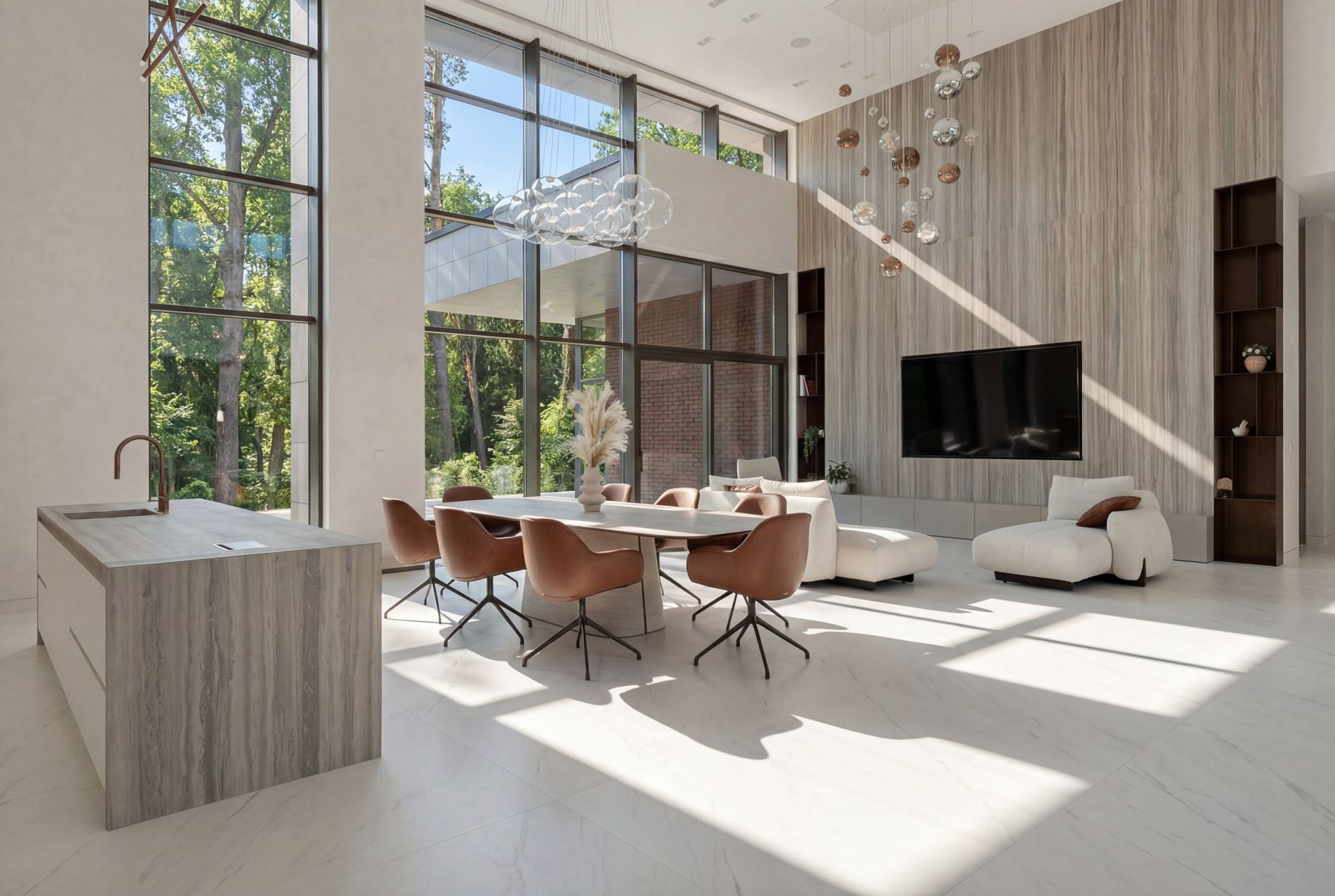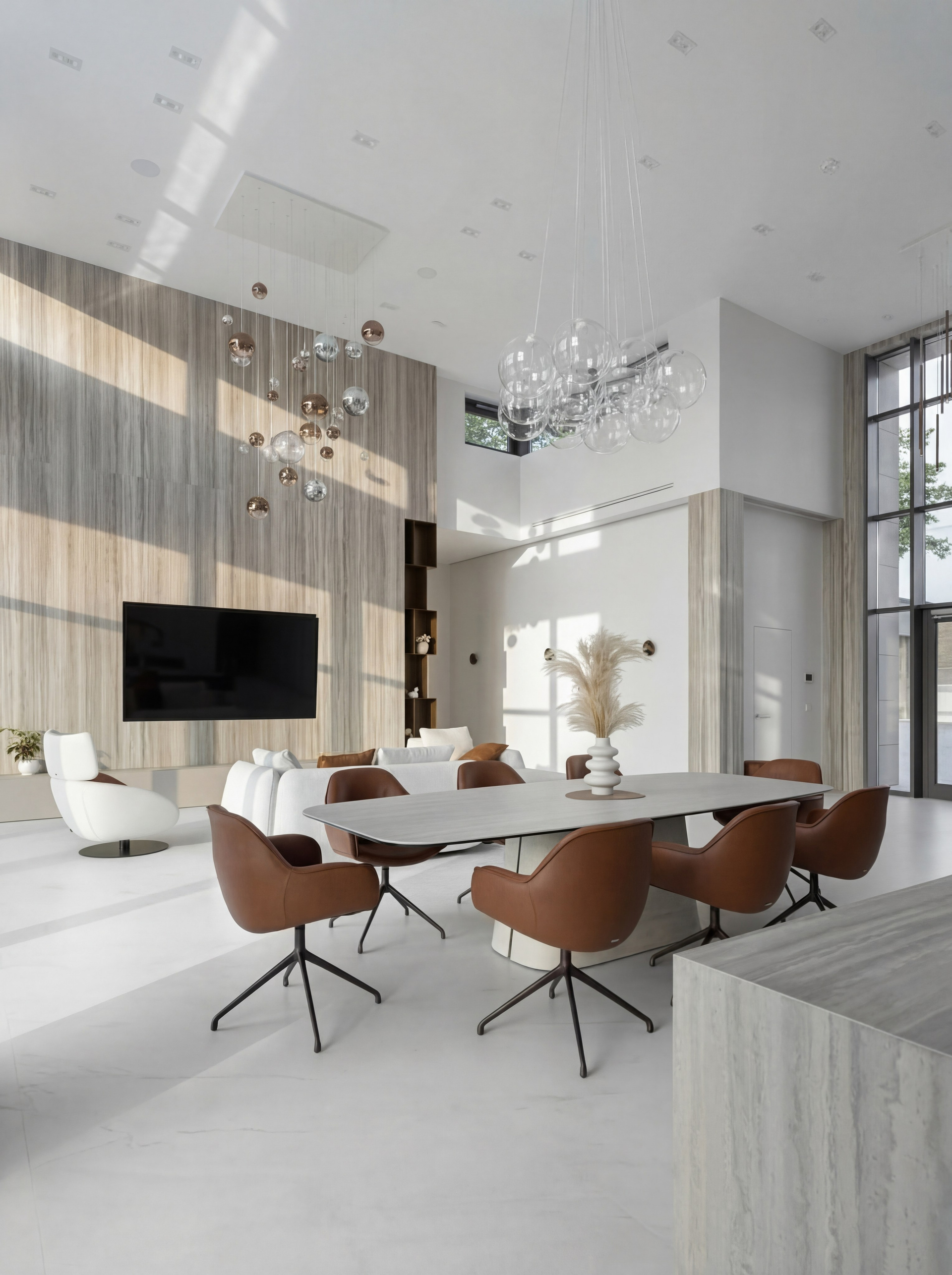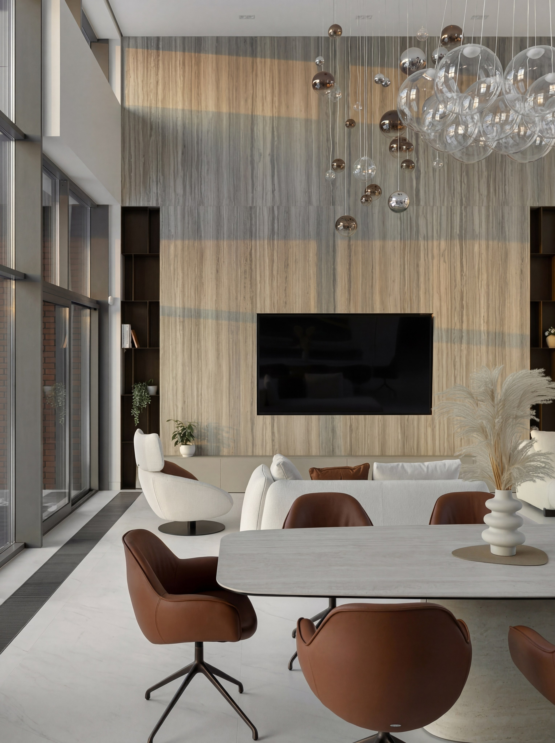 Низкие диваны и кресла задают правильную линию горизонта и не спорят с высотой пространства. Крупная ТВ-плоскость формирует визуальную опору, а подвесные светильники связывают верхний и нижний уровни объёма в единую композицию. Благодаря этому гостиная выглядит цельной и собранной даже при очень большом масштабе.