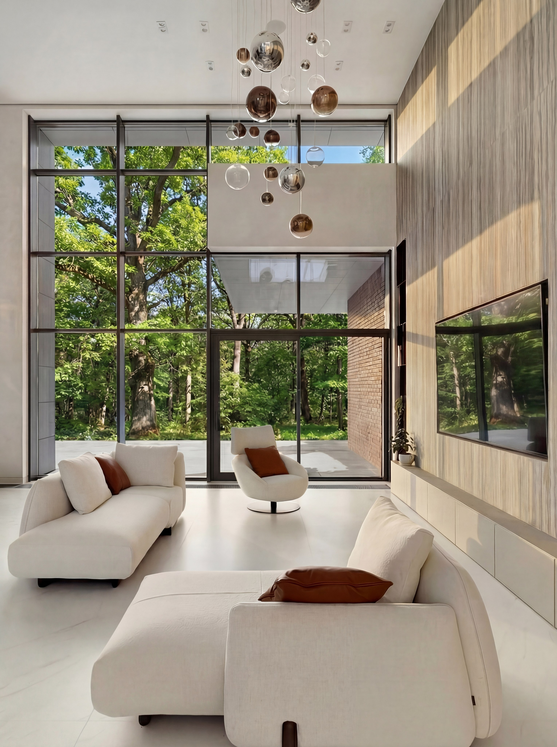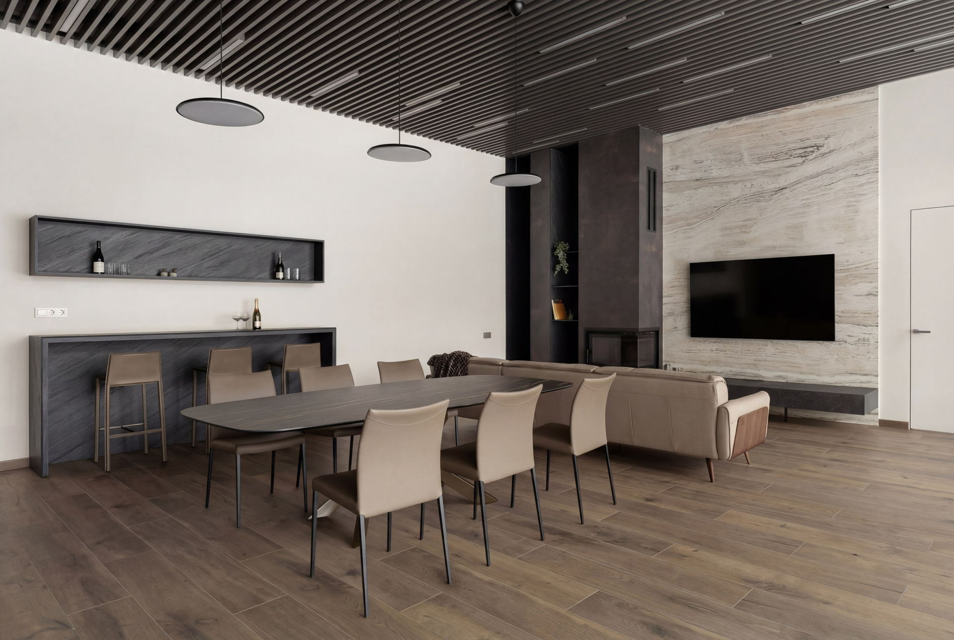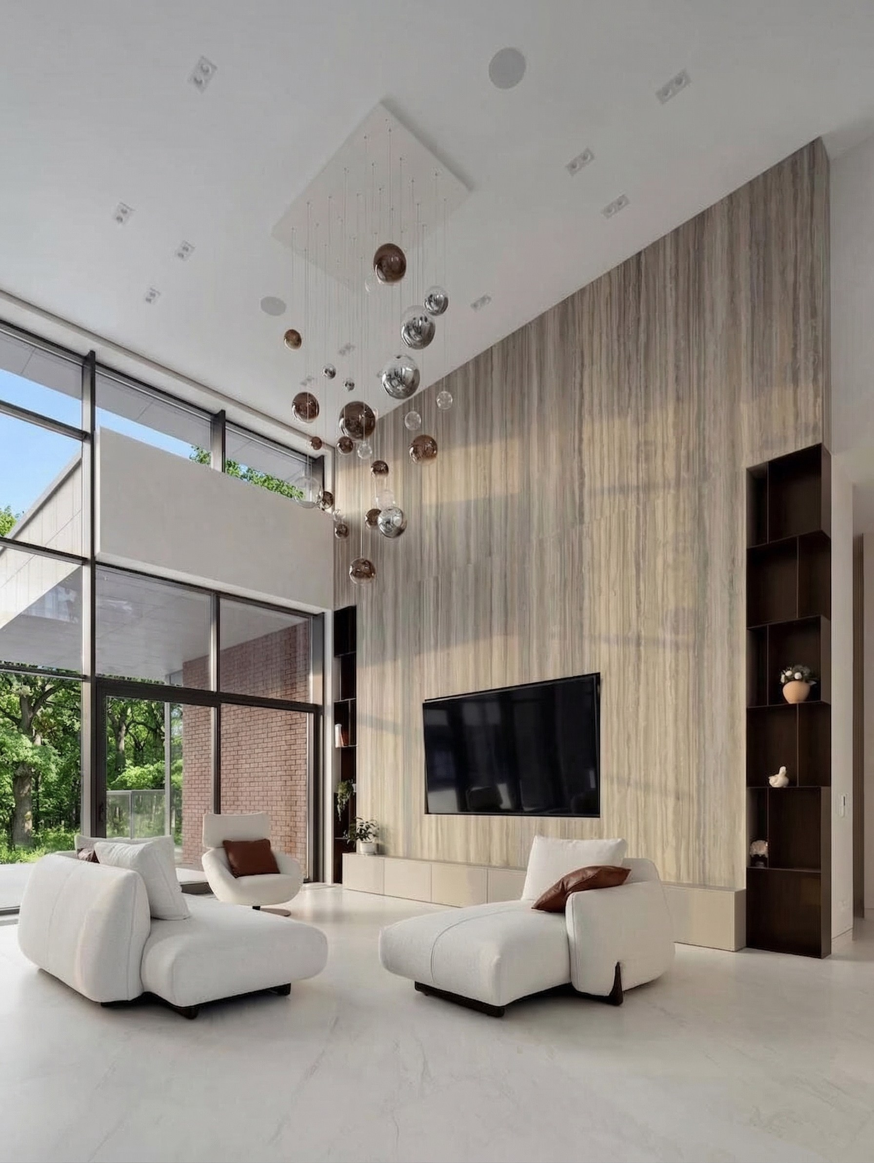 Низкие диваны и кресла задают правильную линию горизонта и не спорят с высотой пространства. Крупная ТВ-плоскость формирует визуальную опору, а подвесные светильники связывают верхний и нижний уровни объёма в единую композицию. Благодаря этому гостиная выглядит цельной и собранной даже при очень большом масштабе.