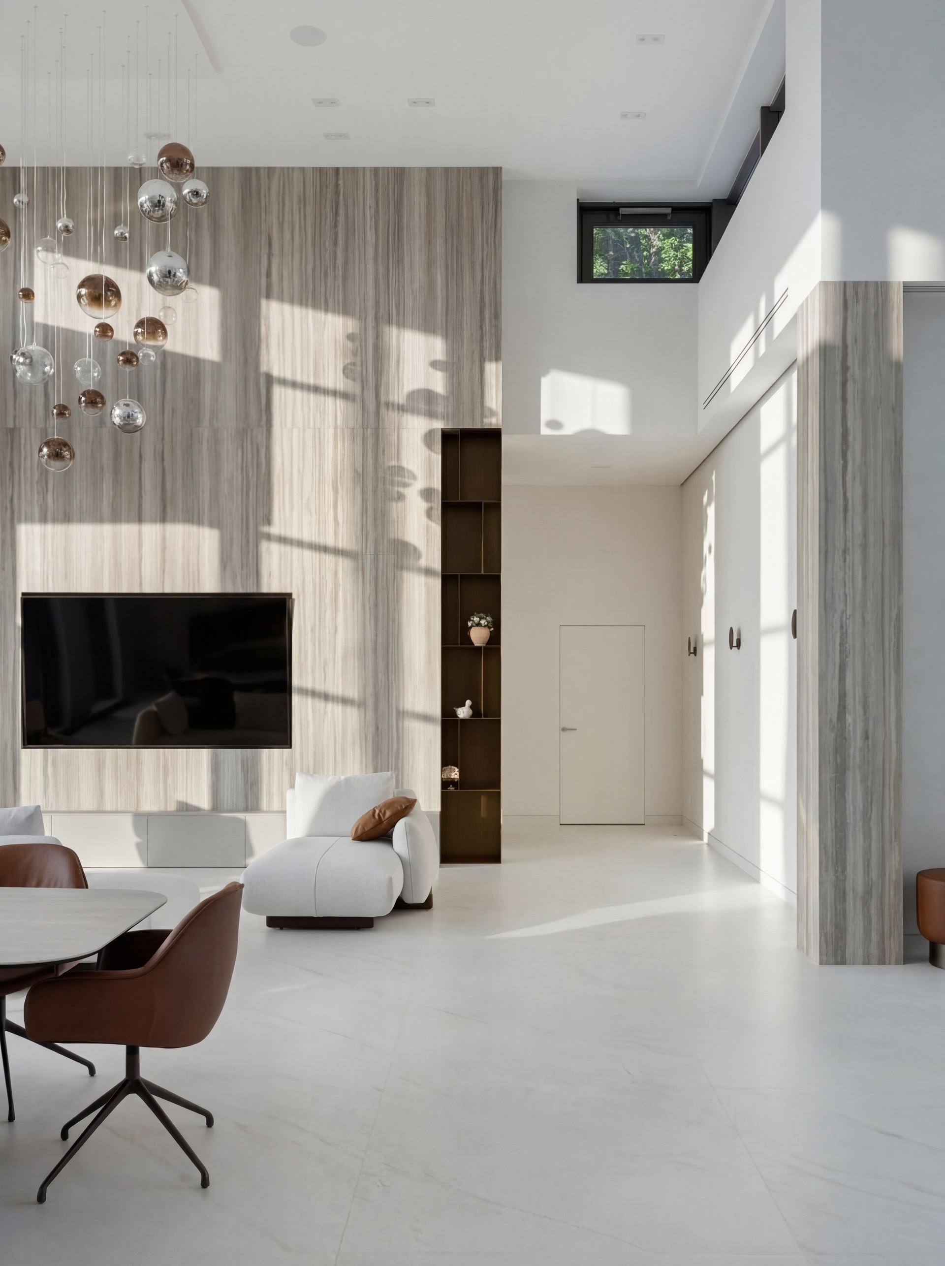 Работа с двусветом всегда требует особенно точной композиции. Сам по себе большой объём не делает пространство качественным: без правильной посадки мебели, ясной иерархии материалов и тёплых тактильных акцентов он быстро становится холодным и формальным. В этом проекте масштаб собран очень точно. Его удерживают низкие диваны, крупные монолитные плоскости, спокойная палитра и выразительные, но не перегружающие световые композиции.