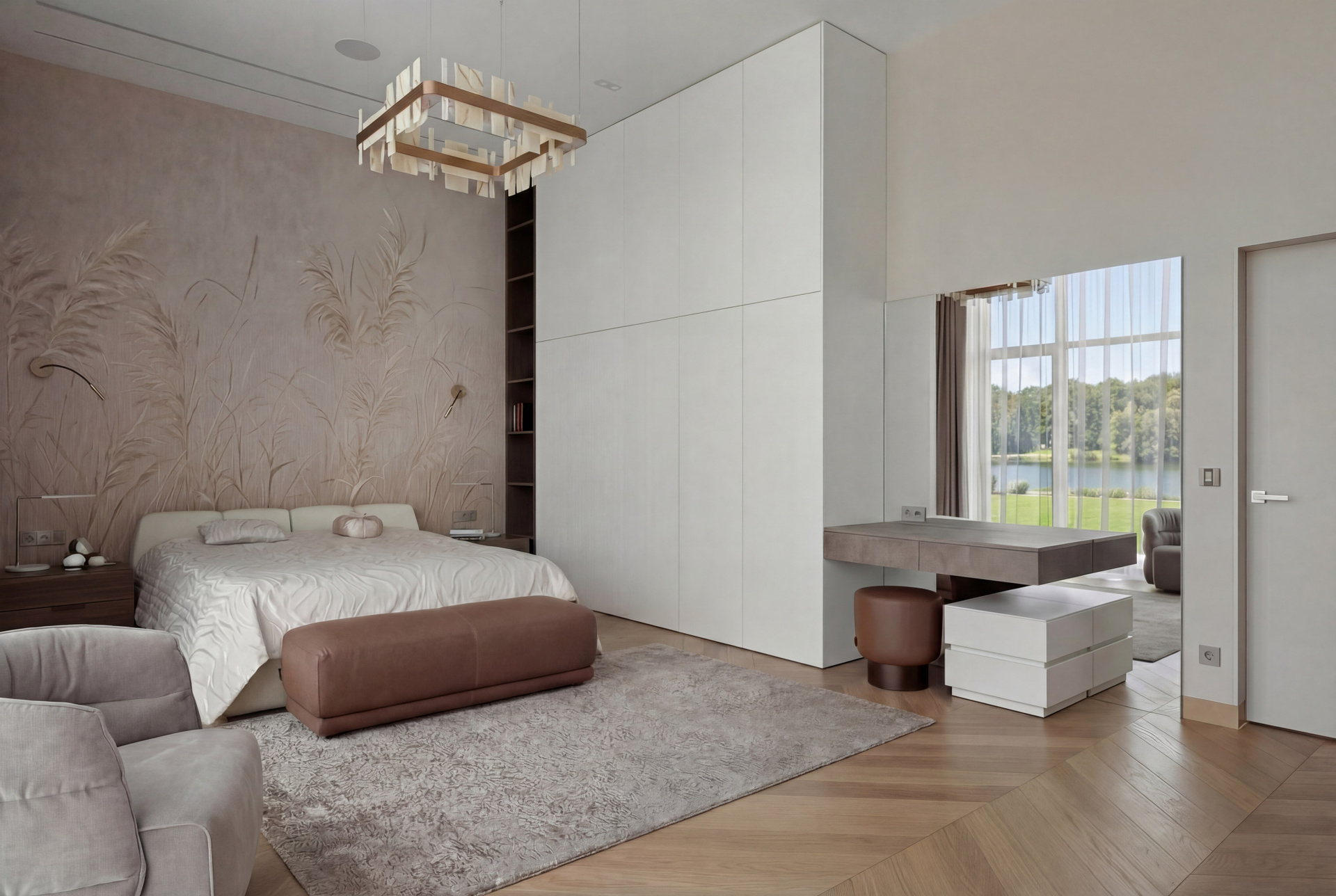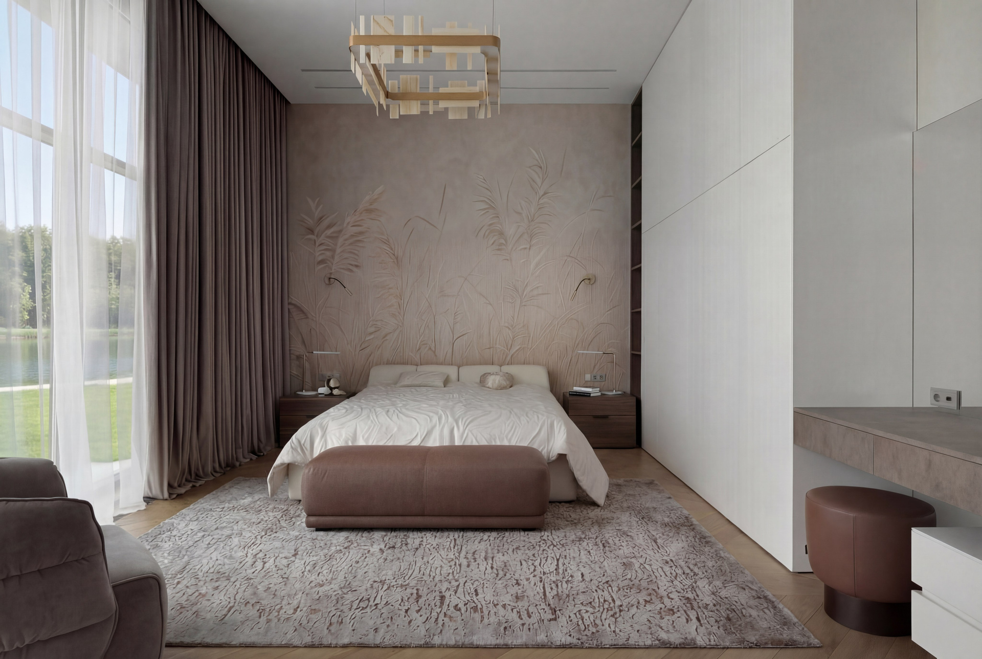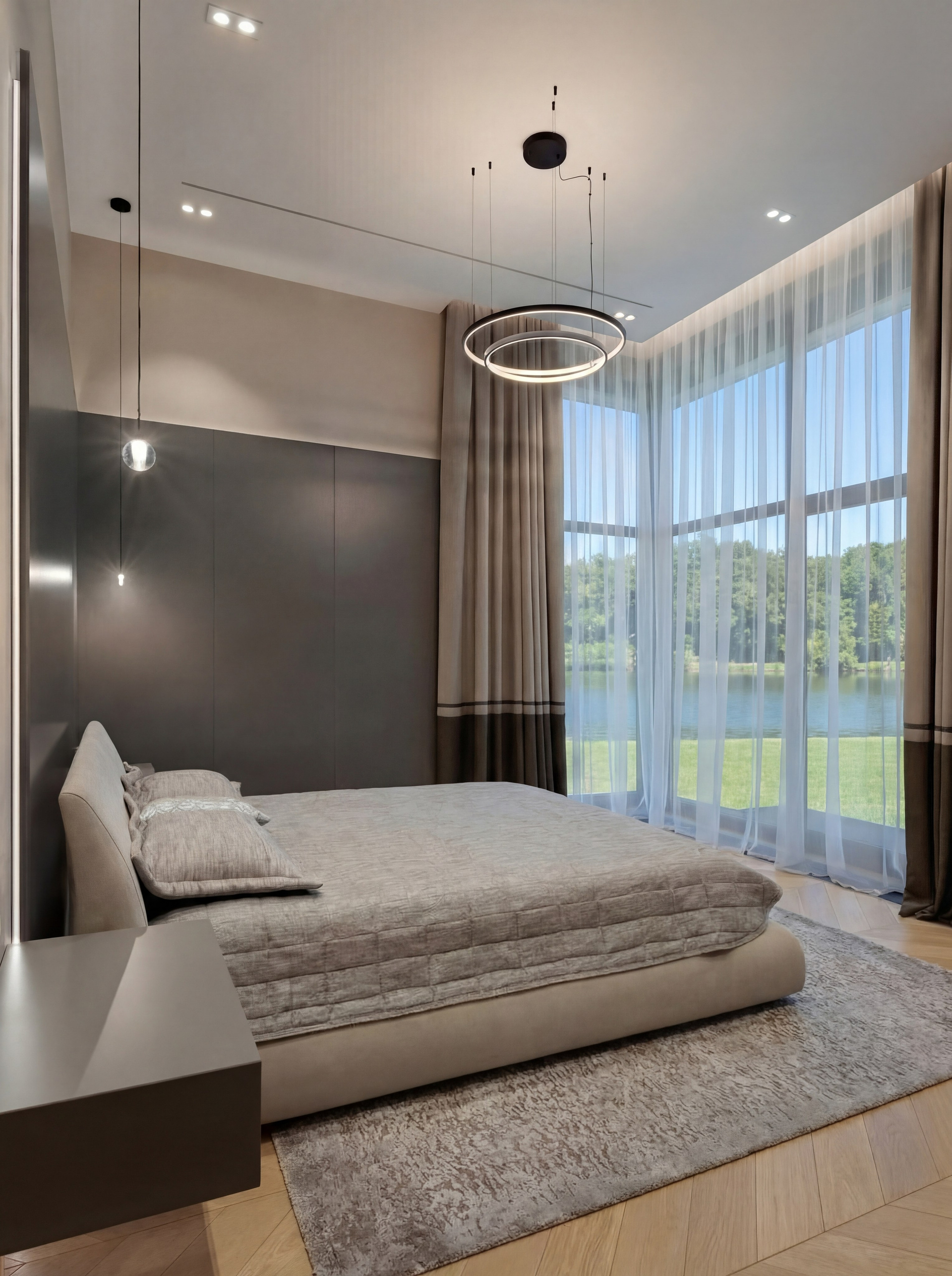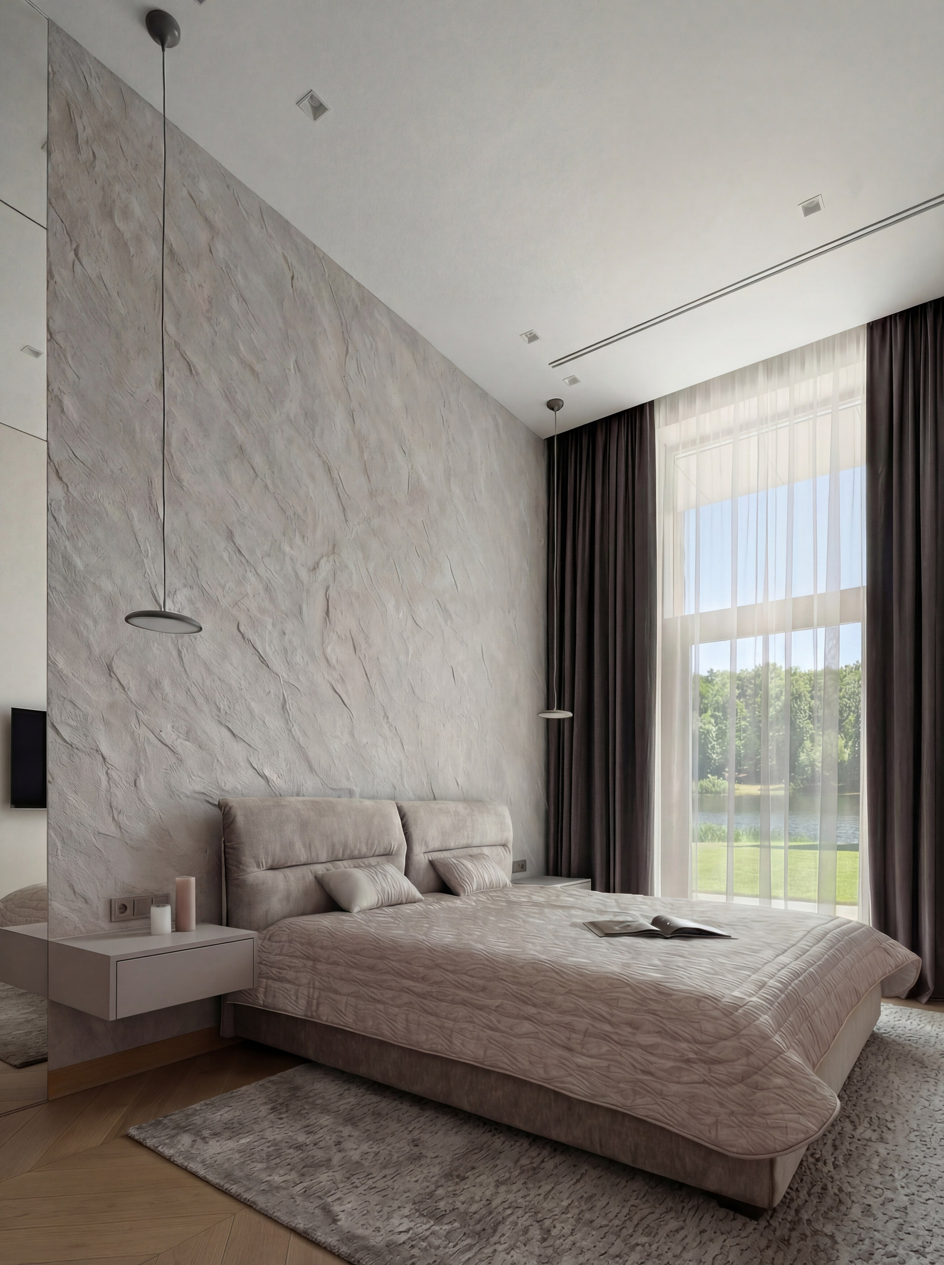 Первая спальня решена почти как пространство тишины. Фактурная стена за изголовьем, мягкая нейтральная гамма, тонкие подвесные светильники, спокойный рисунок пола и высокий проём с видом на воду формируют очень чистую и сдержанную среду. Здесь нет активной декоративности — интерьер держится на нюансах, пропорциях и качестве материалов. Именно поэтому он выглядит особенно дорого и убедительно.