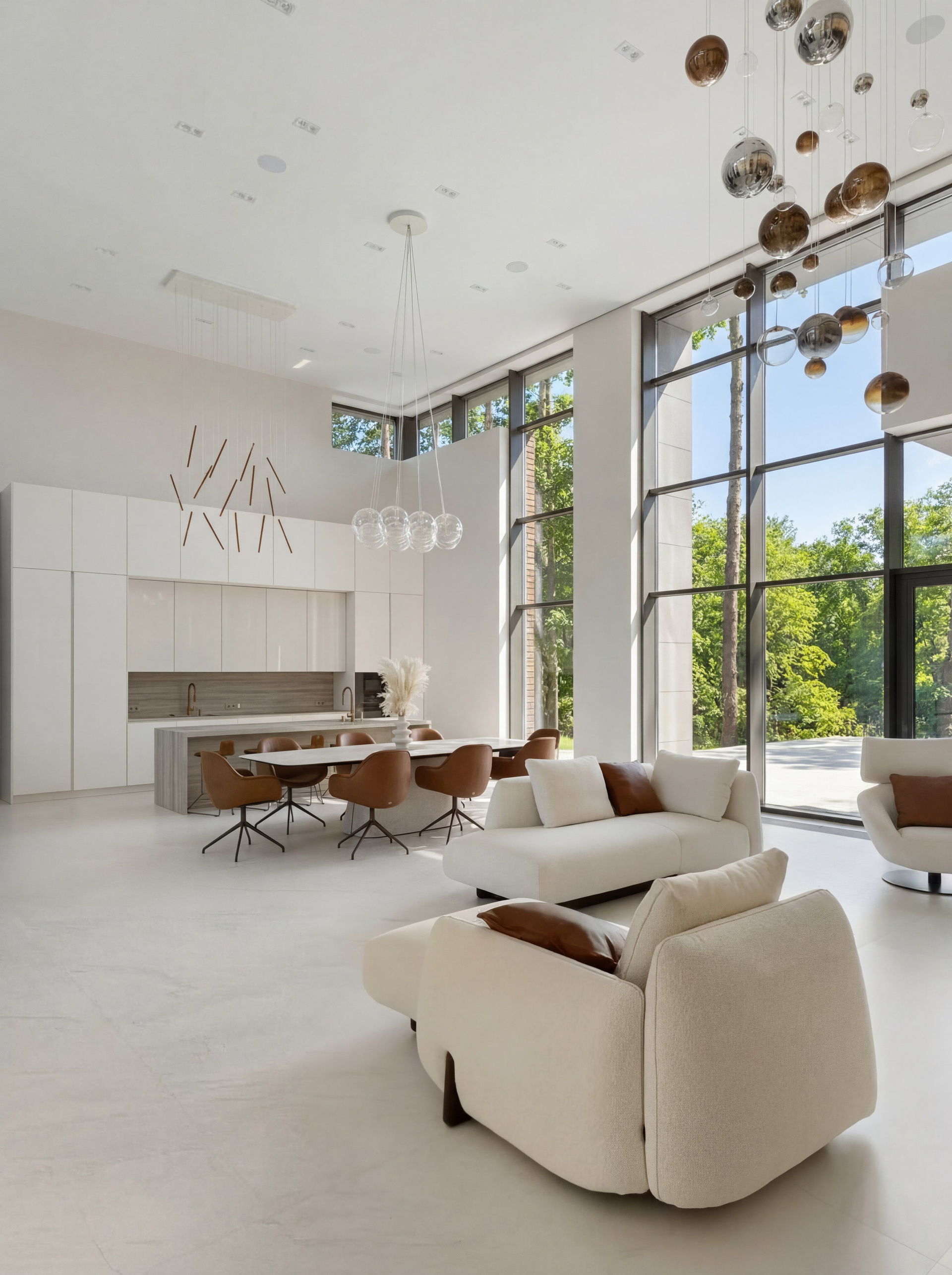 Главным пространством дома стала двусветная кухня-гостиная-столовая. Именно здесь наиболее ясно читается характер всего проекта: высокие вертикали, панорамное остекление, светлая оболочка интерьера, крупный формат отделки и низкий силуэт мебели, который позволяет удержать объём и не перекрыть ощущение воздуха.