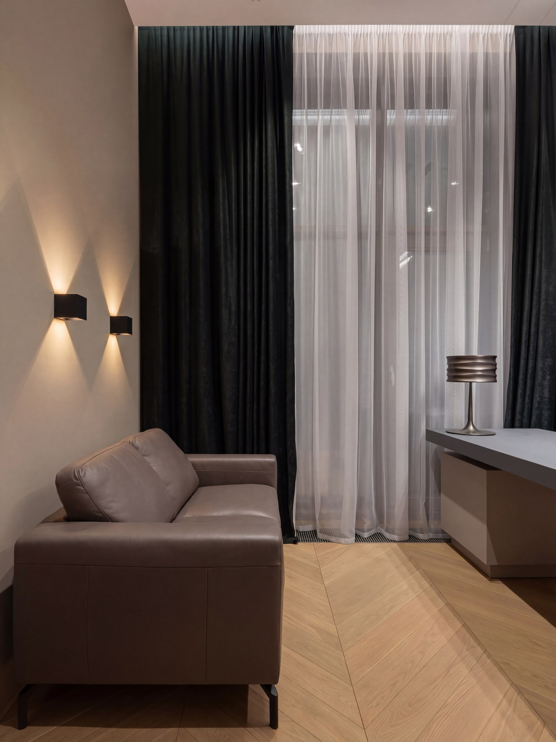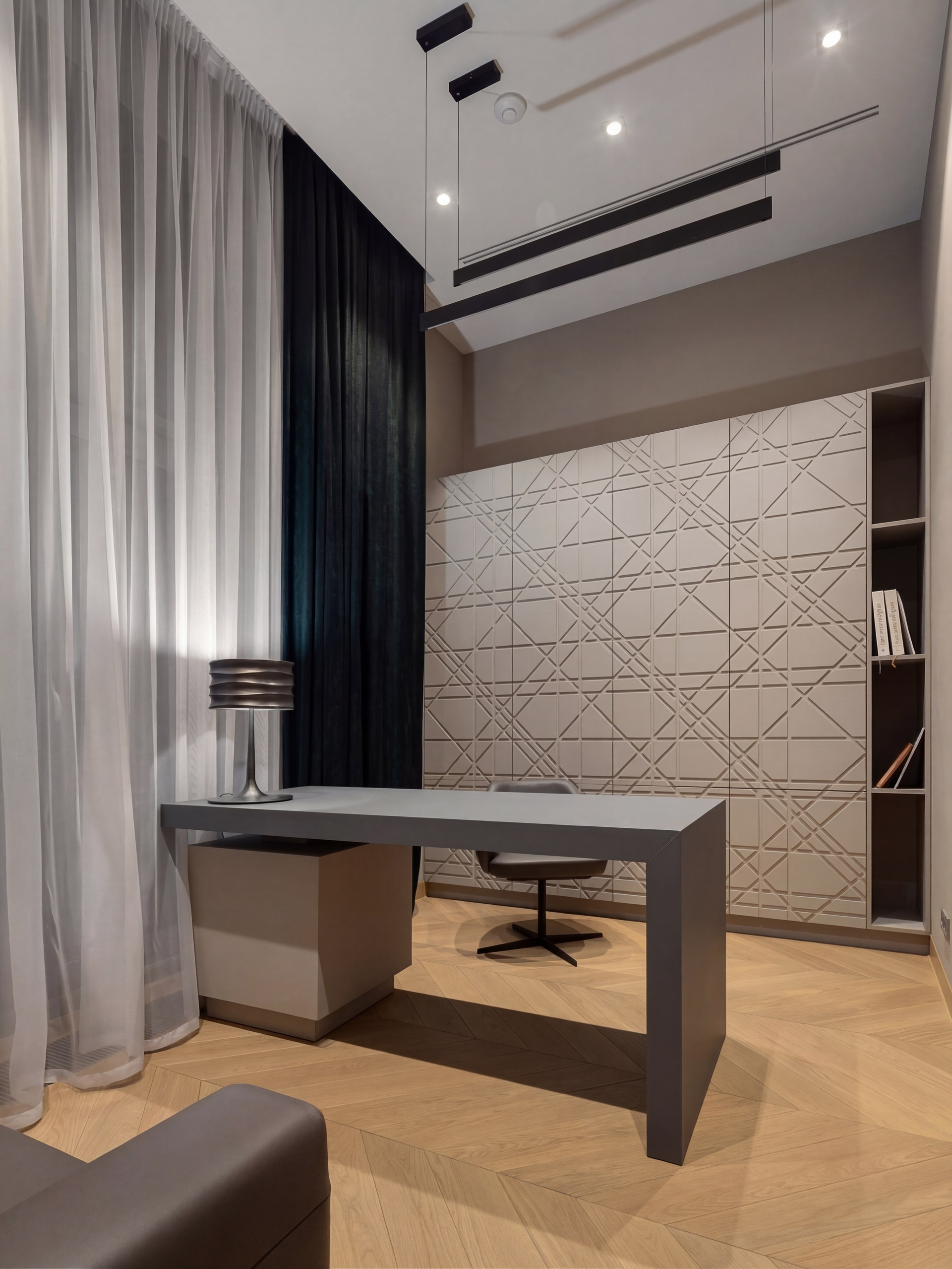 Крупный рабочий стол задаёт центр, графичная стеновая панель формирует архитектурный фон, а тёмный текстиль и мягкий направленный свет создают сосредоточенную рабочую атмосферу. Тёплый рисунок пола поддерживает общий язык интерьера и не даёт кабинету стать слишком холодным или офисным.