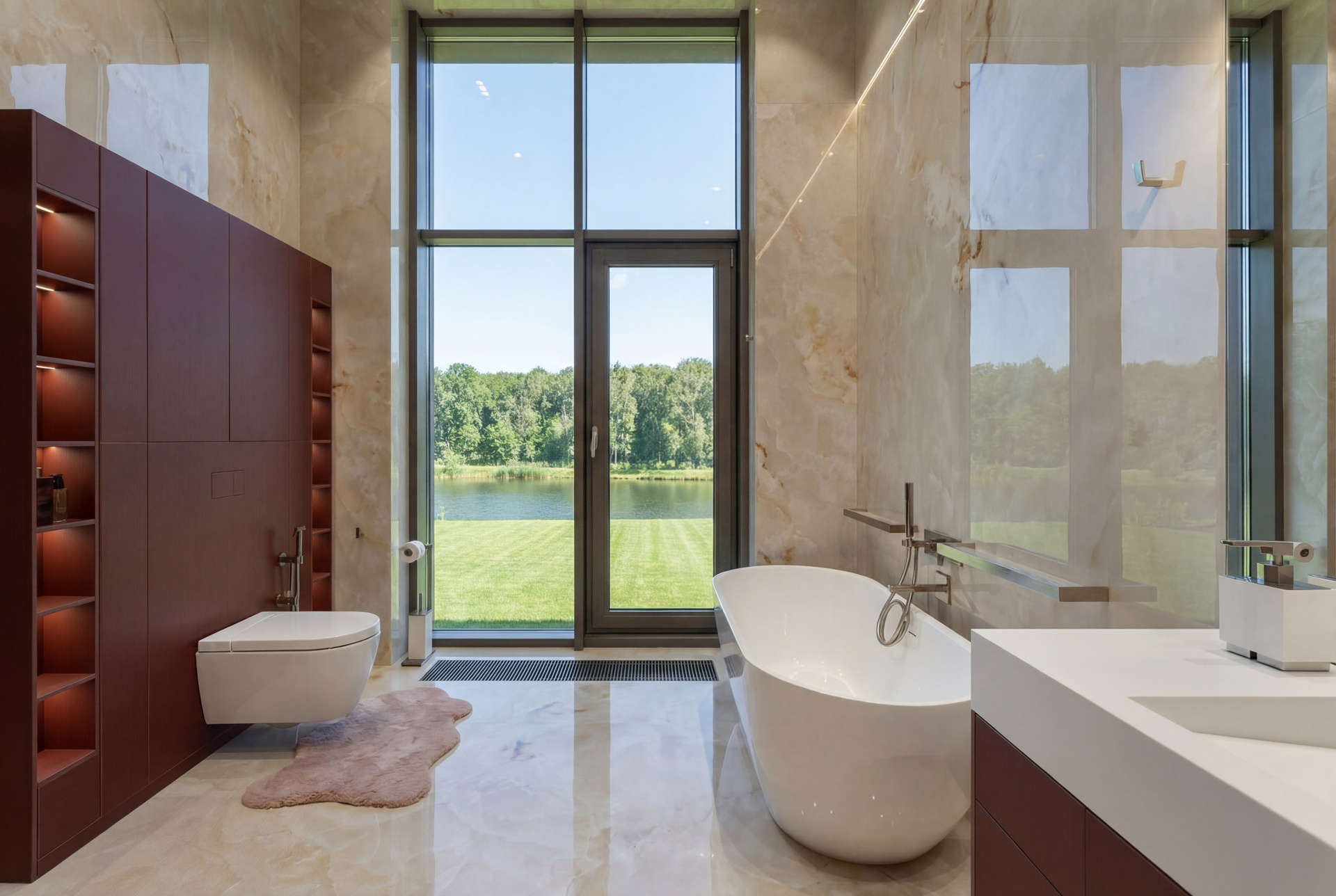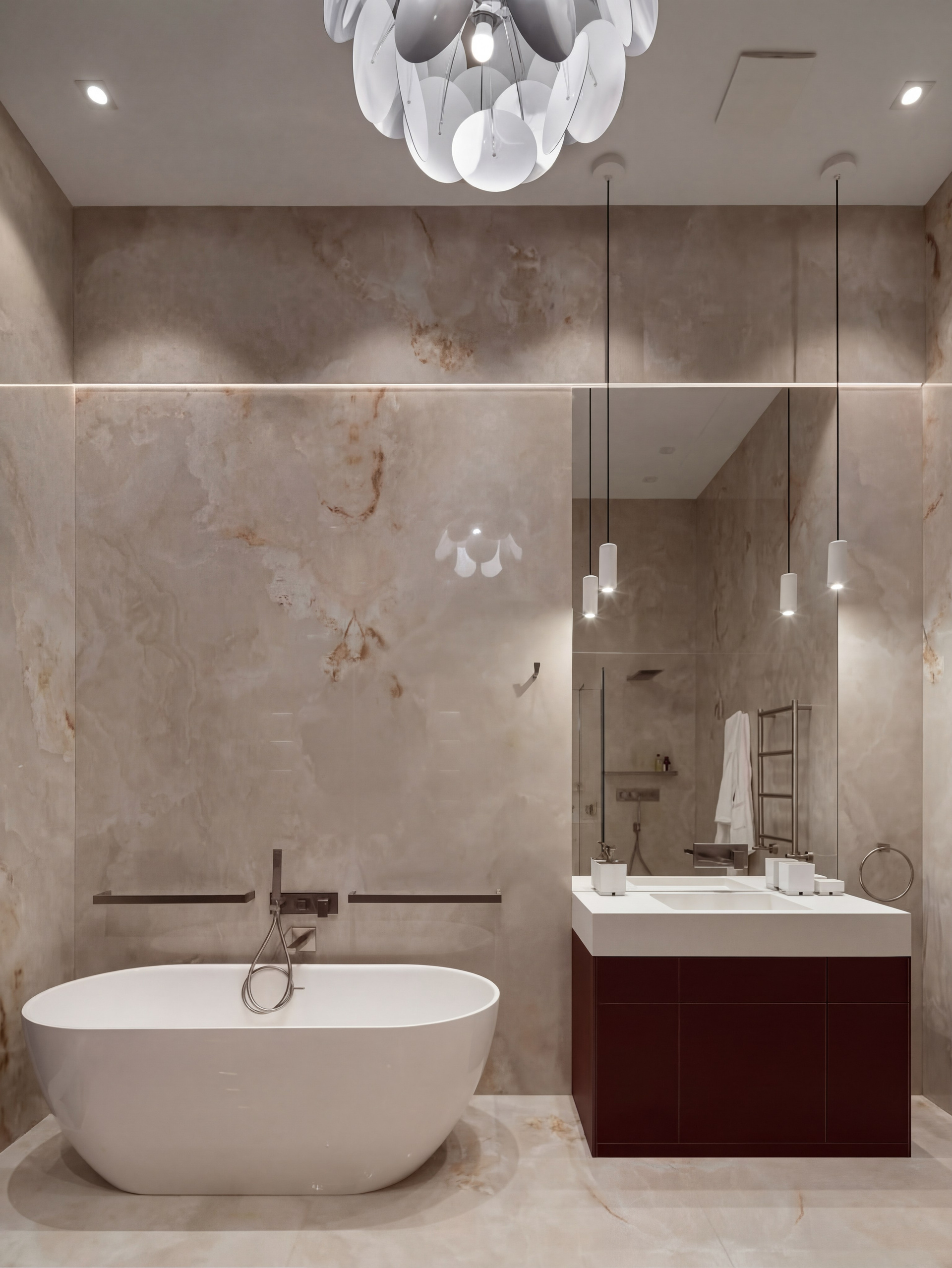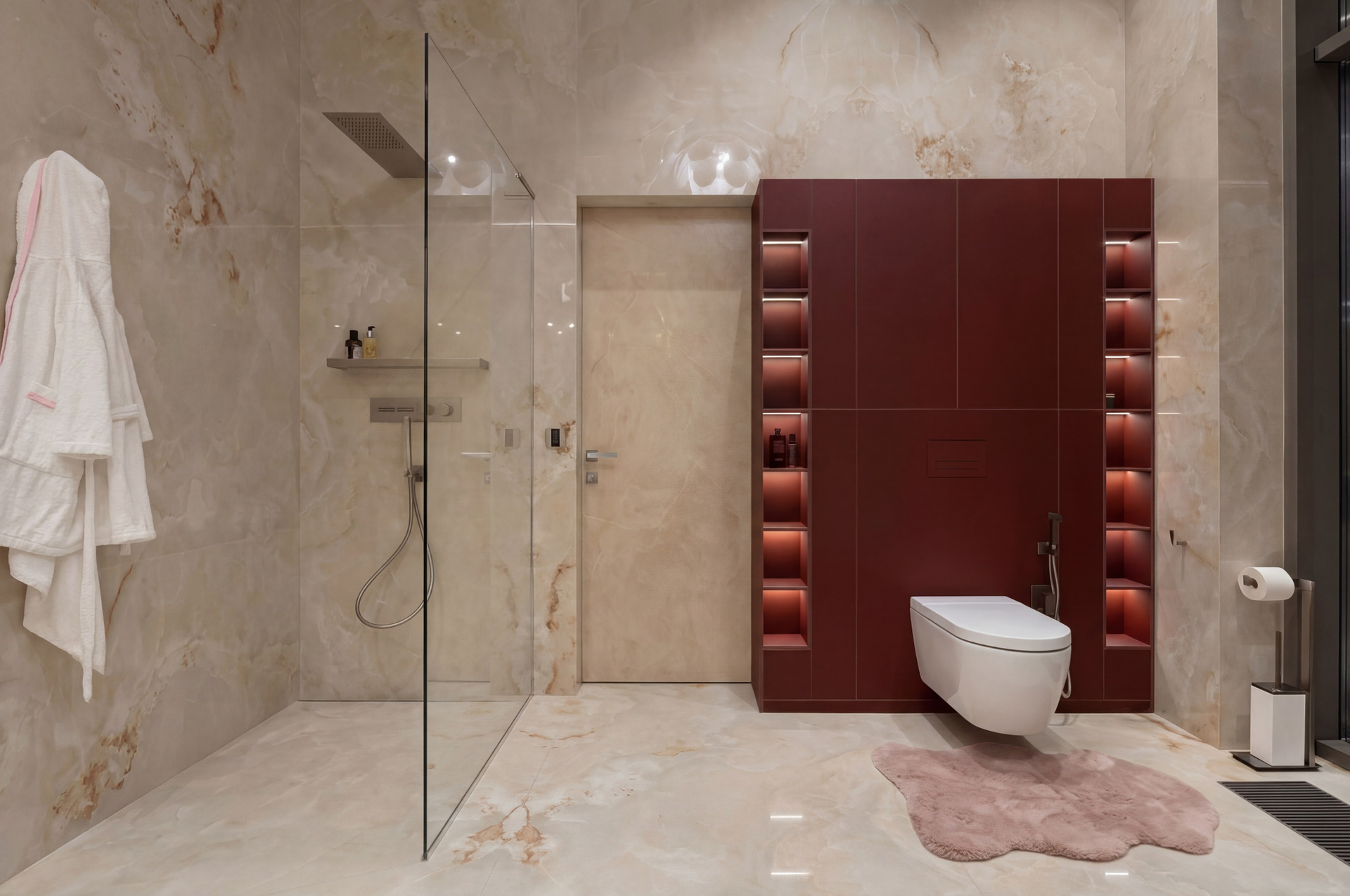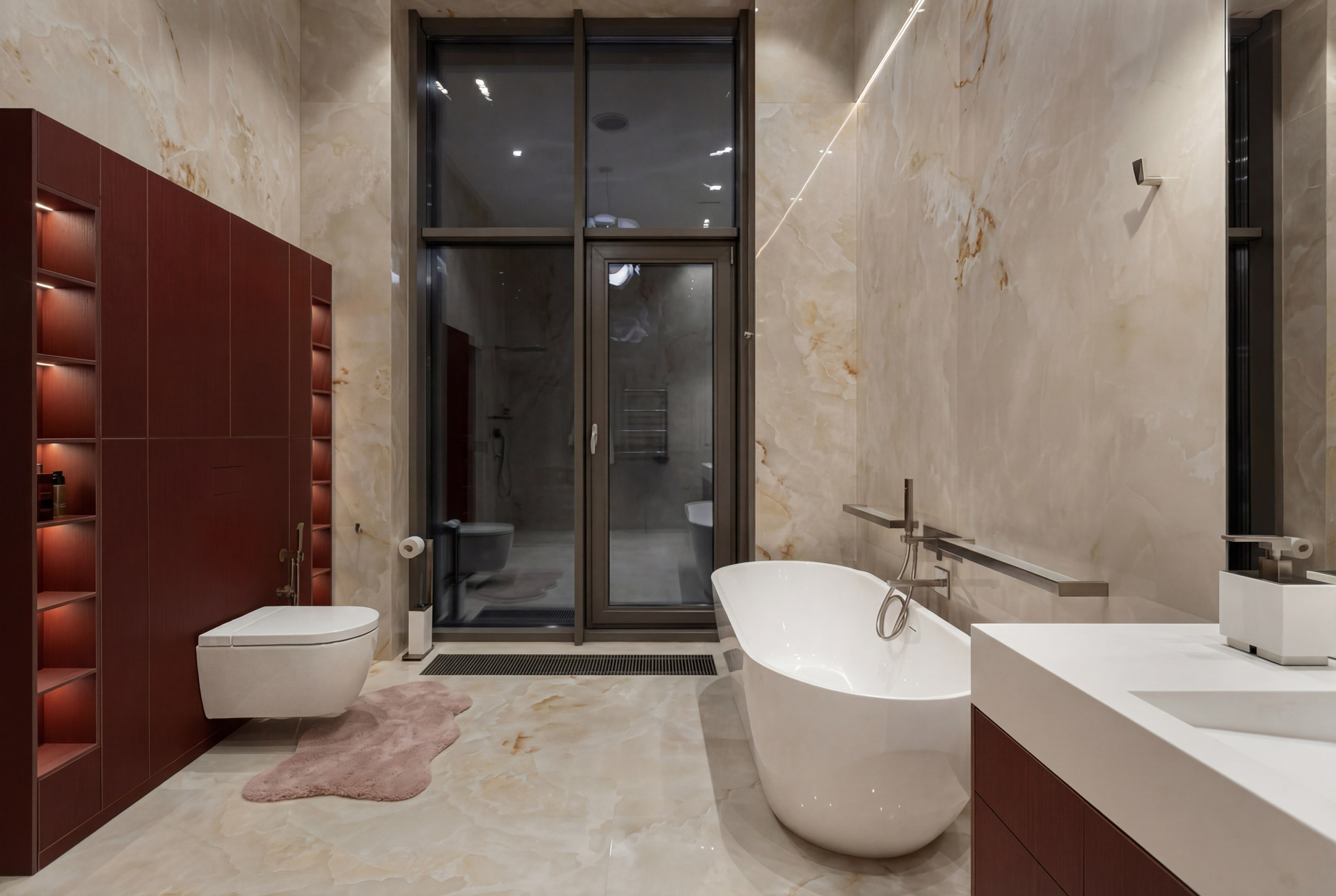Вторая крупная ванная раскрывает проект в другой интонации. Светлый глянцевый камень, высокая вертикаль окна, белая ванна и винно-терракотовый блок хранения формируют более декоративный и чувственный образ. Но и здесь интерьер сохраняет дисциплину: цветовой акцент встроен точно, а композиция держится на крупном формате и чистоте линий.