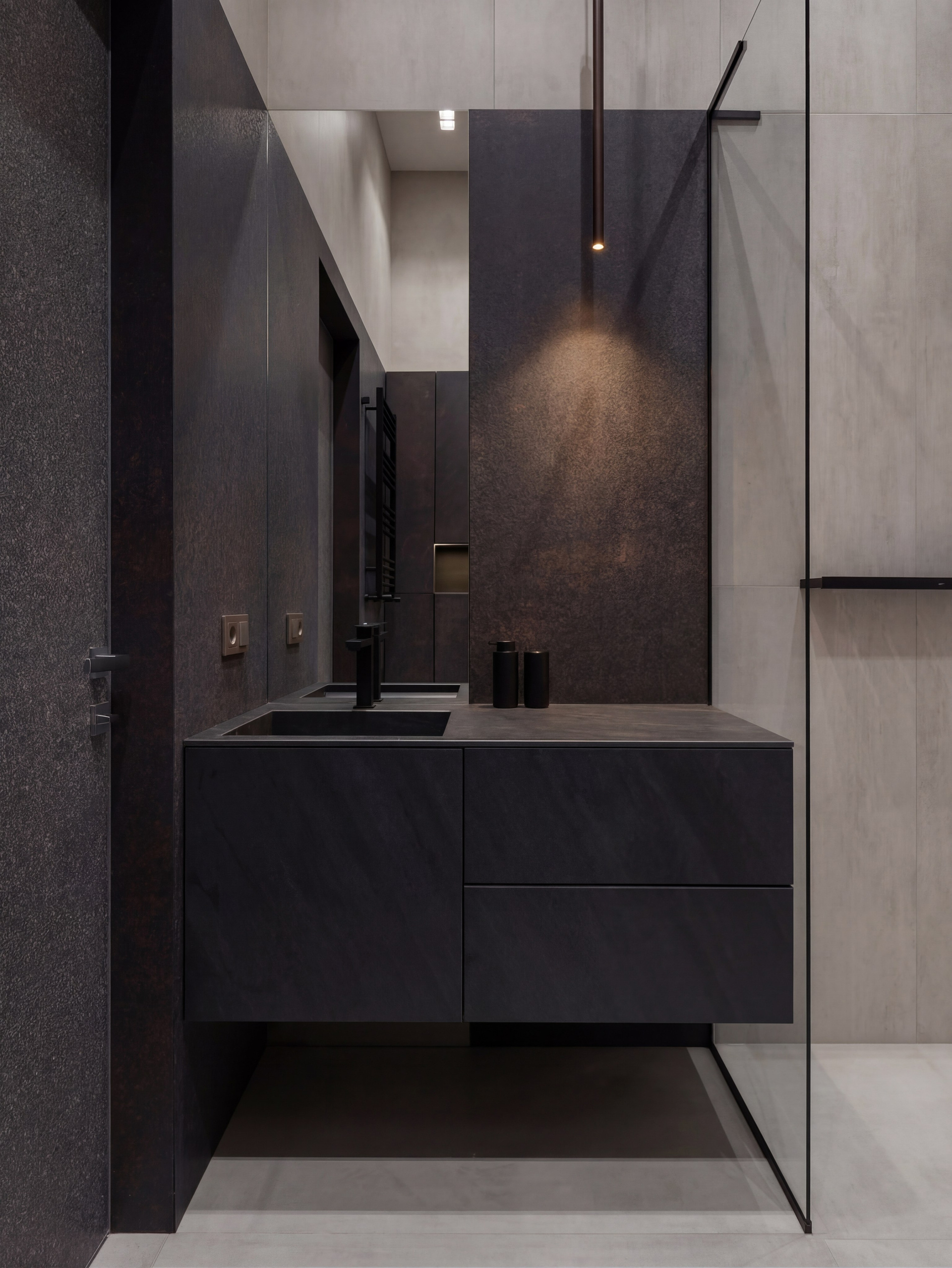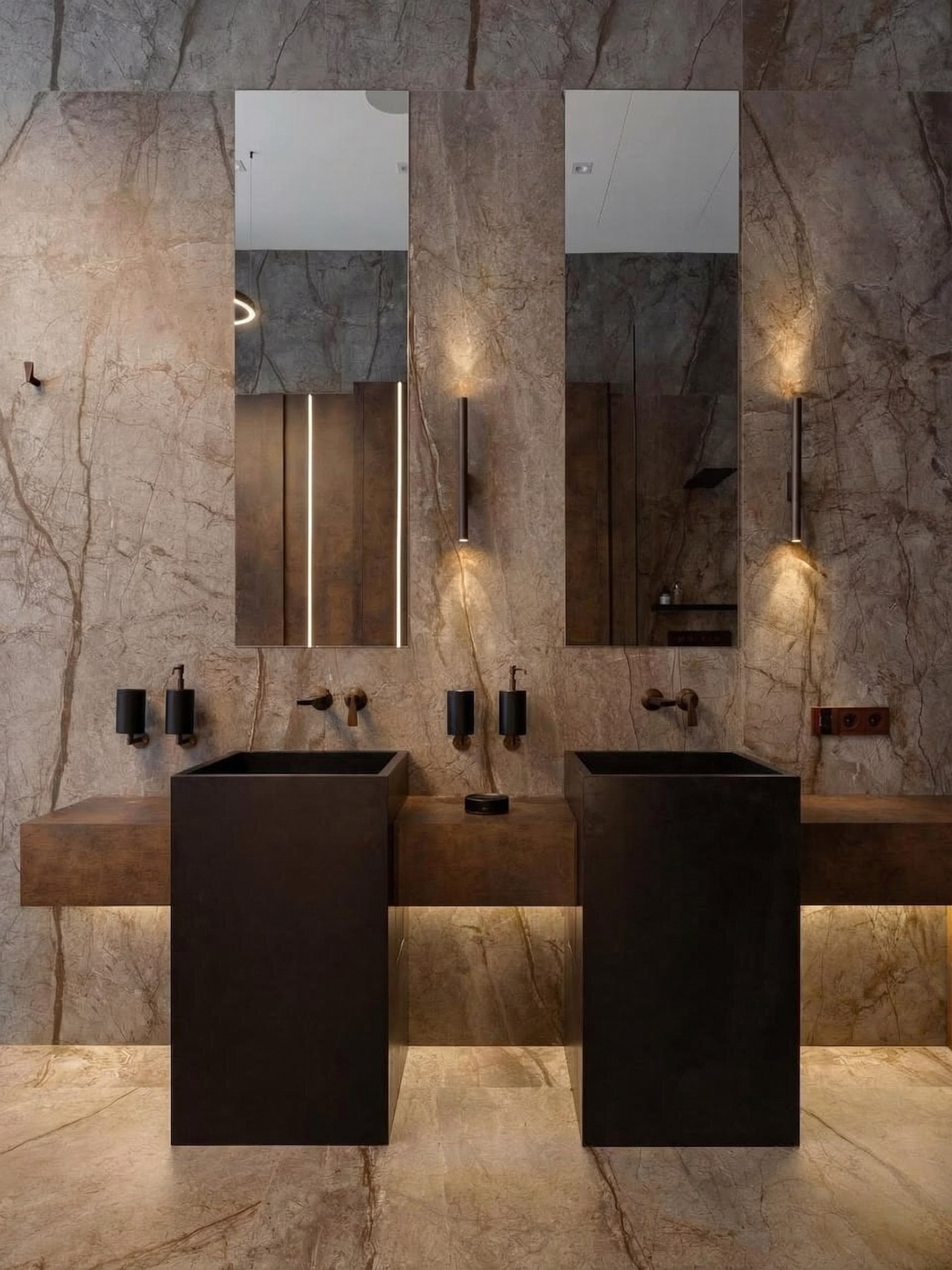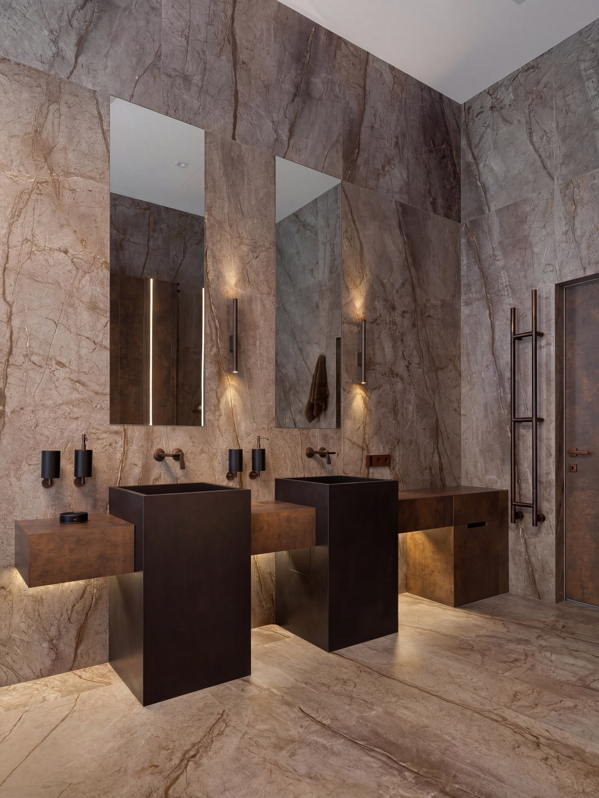 Здесь особенно заметна работа с вертикалью и светом. Зеркала, подсветка, крупные каменные поверхности и контраст тёмных элементов собраны так, чтобы интерьер воспринимался цельным, глубоким и внутренне очень спокойным. Тёмная палитра усиливает статус и тактильность, не делая пространство тяжёлым.
