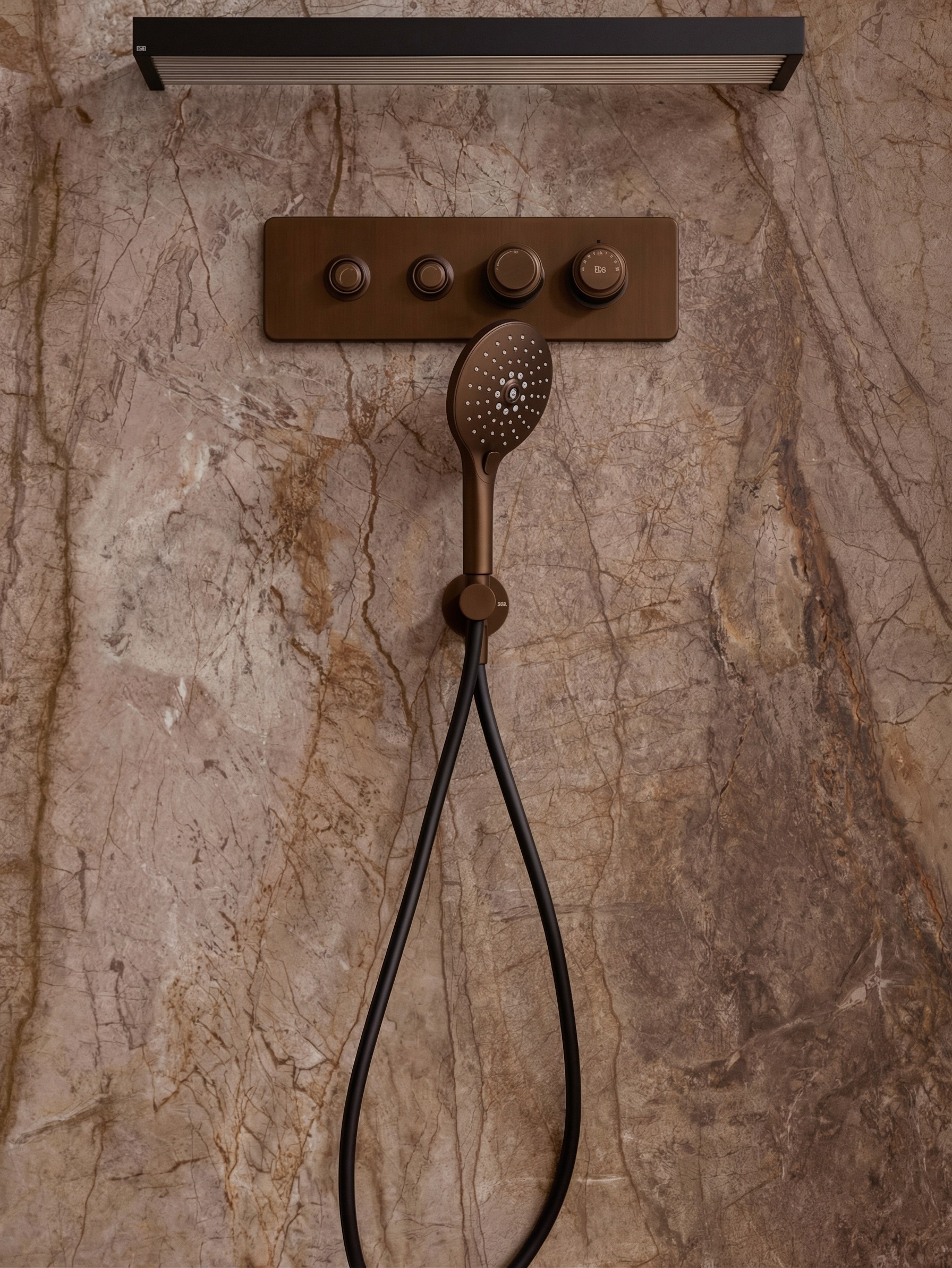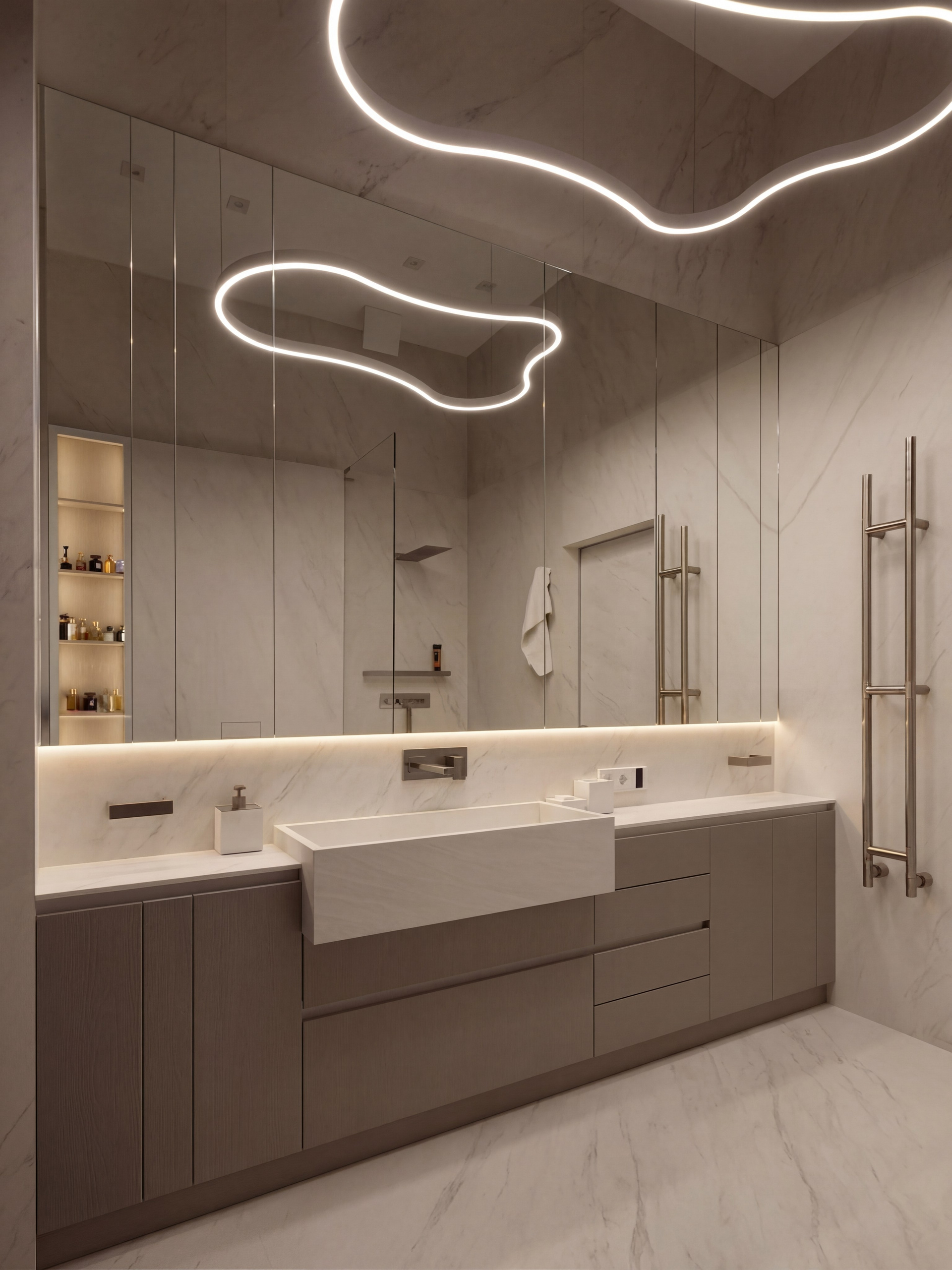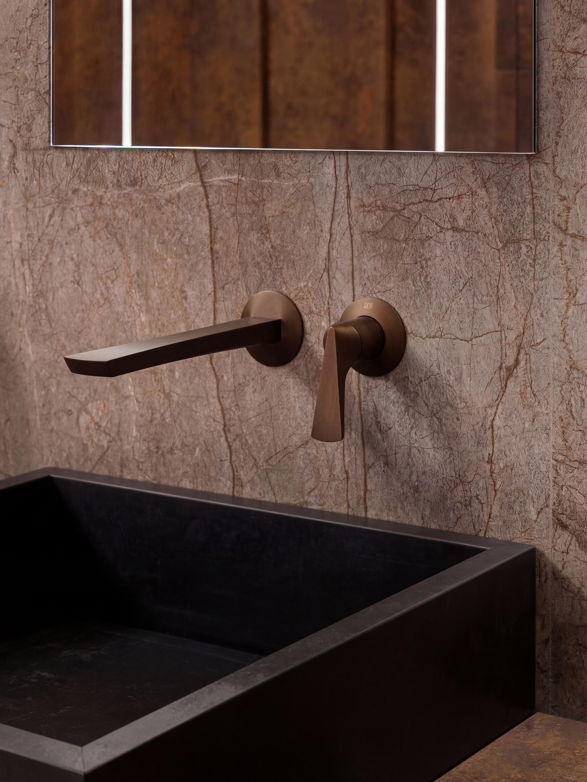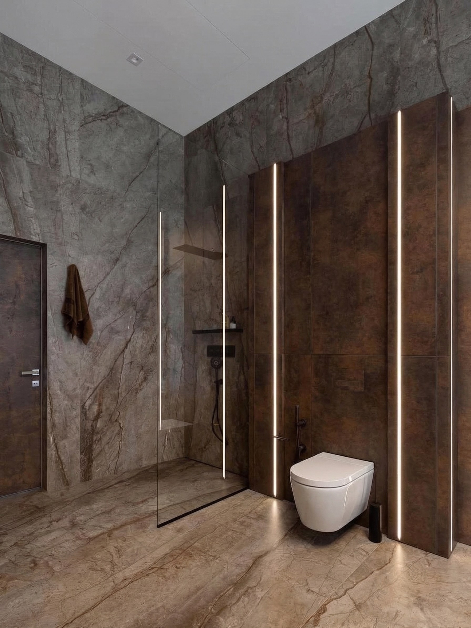 Здесь особенно заметна работа с вертикалью и светом. Зеркала, подсветка, крупные каменные поверхности и контраст тёмных элементов собраны так, чтобы интерьер воспринимался цельным, глубоким и внутренне очень спокойным. Тёмная палитра усиливает статус и тактильность, не делая пространство тяжёлым.