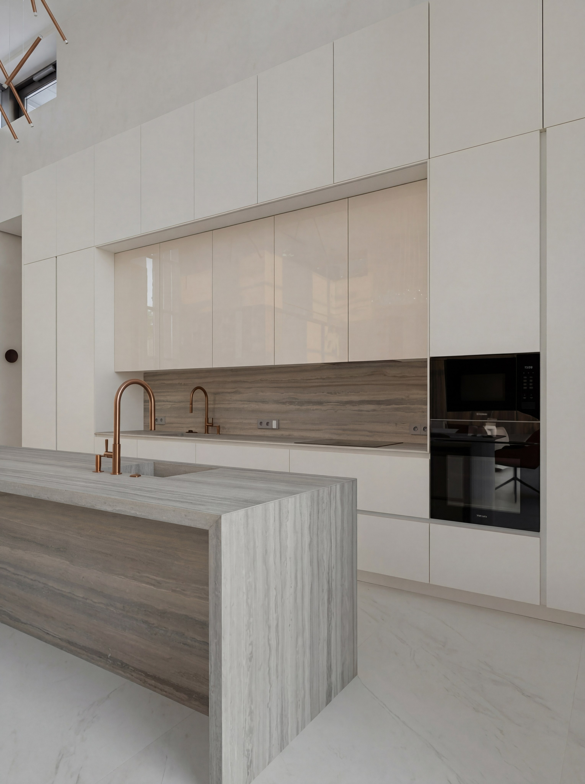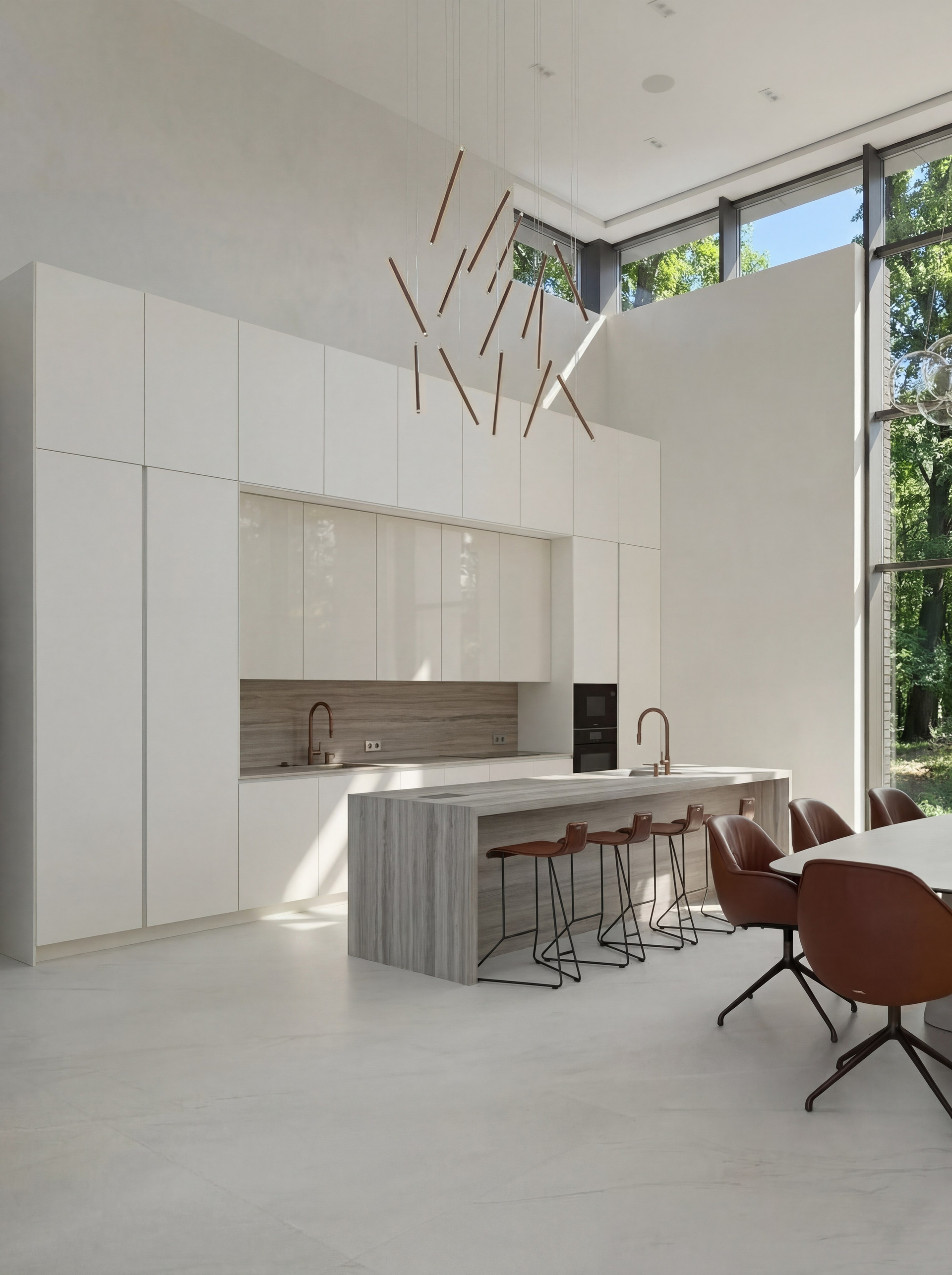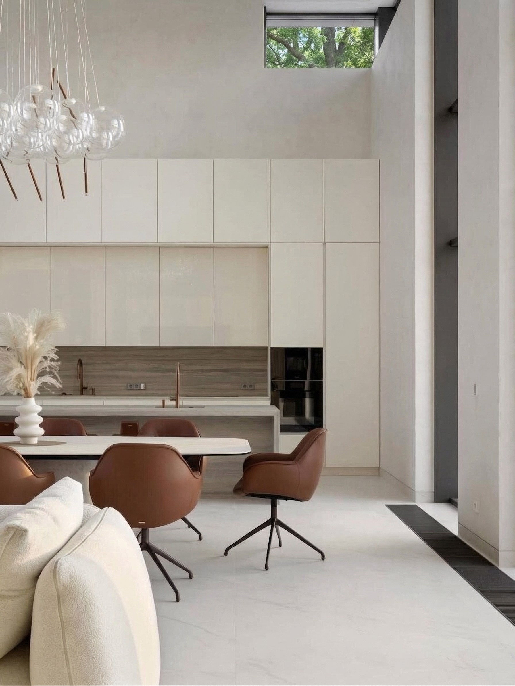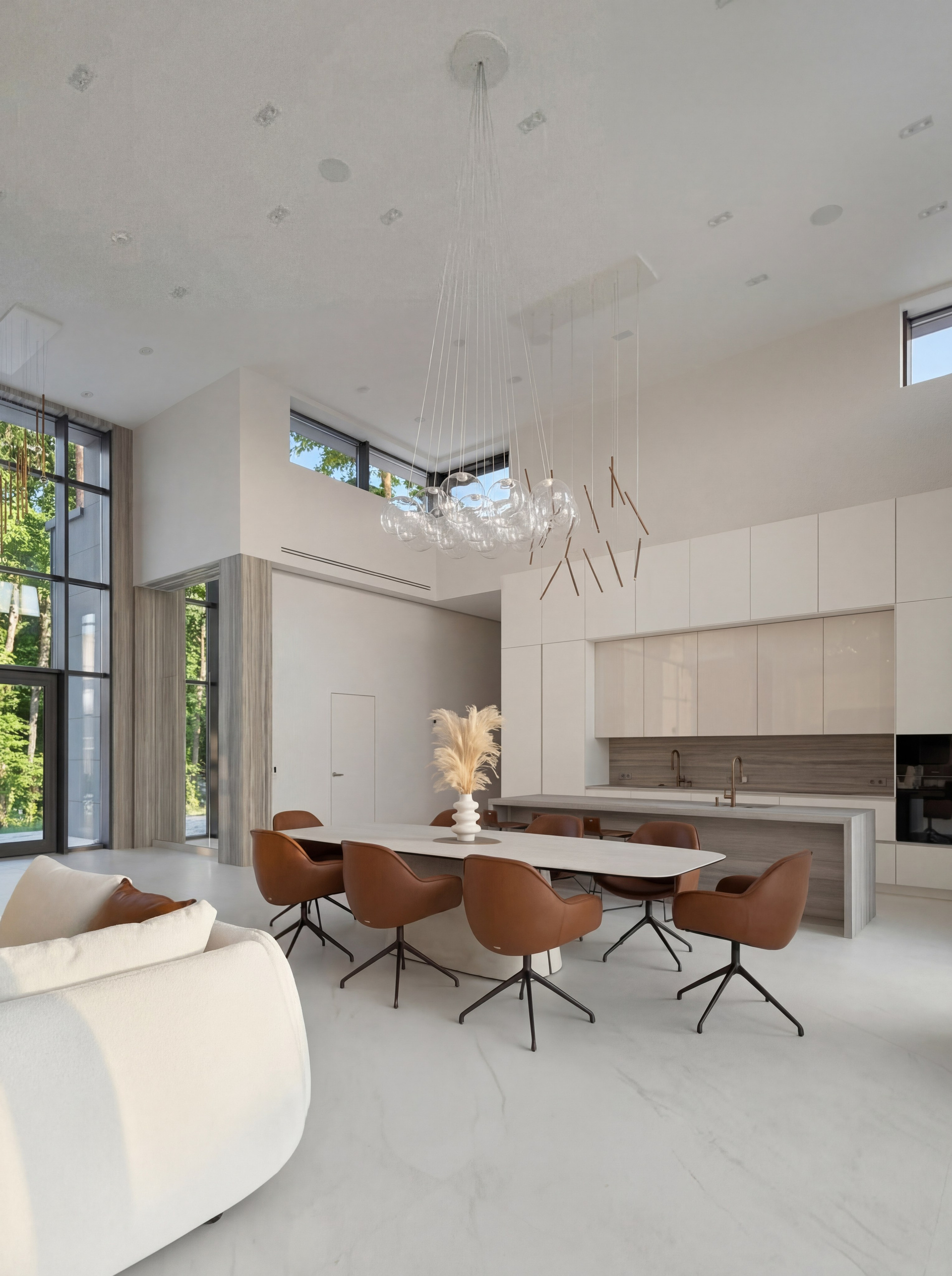Кухня интегрирована в общественную зону как лаконичный архитектурный объём. Светлые фасады поддерживают цельность пространства, а остров с выразительной каменной текстурой становится композиционной осью и центром повседневного сценария. Столовая группа связывает кухню и гостиную в единое целое, а тёплые оттенки кожи, металла и дерева уравновешивают масштаб и добавляют интерьеру жизненности.