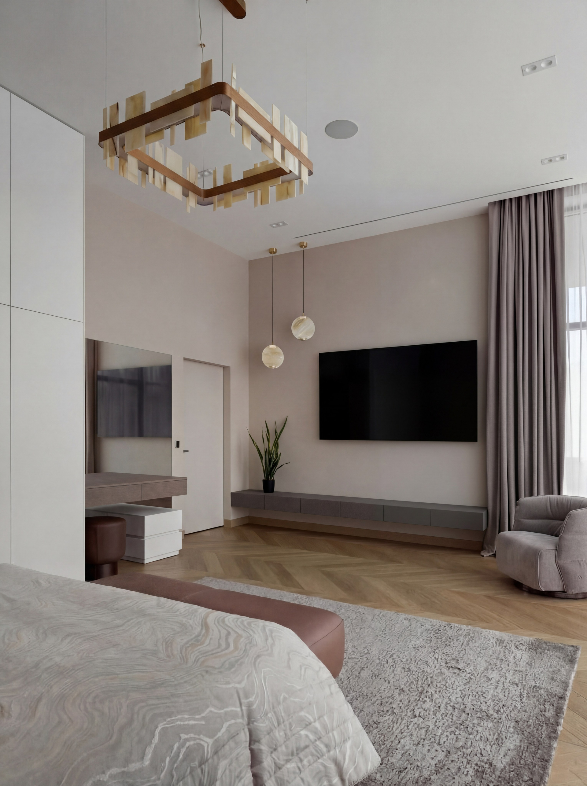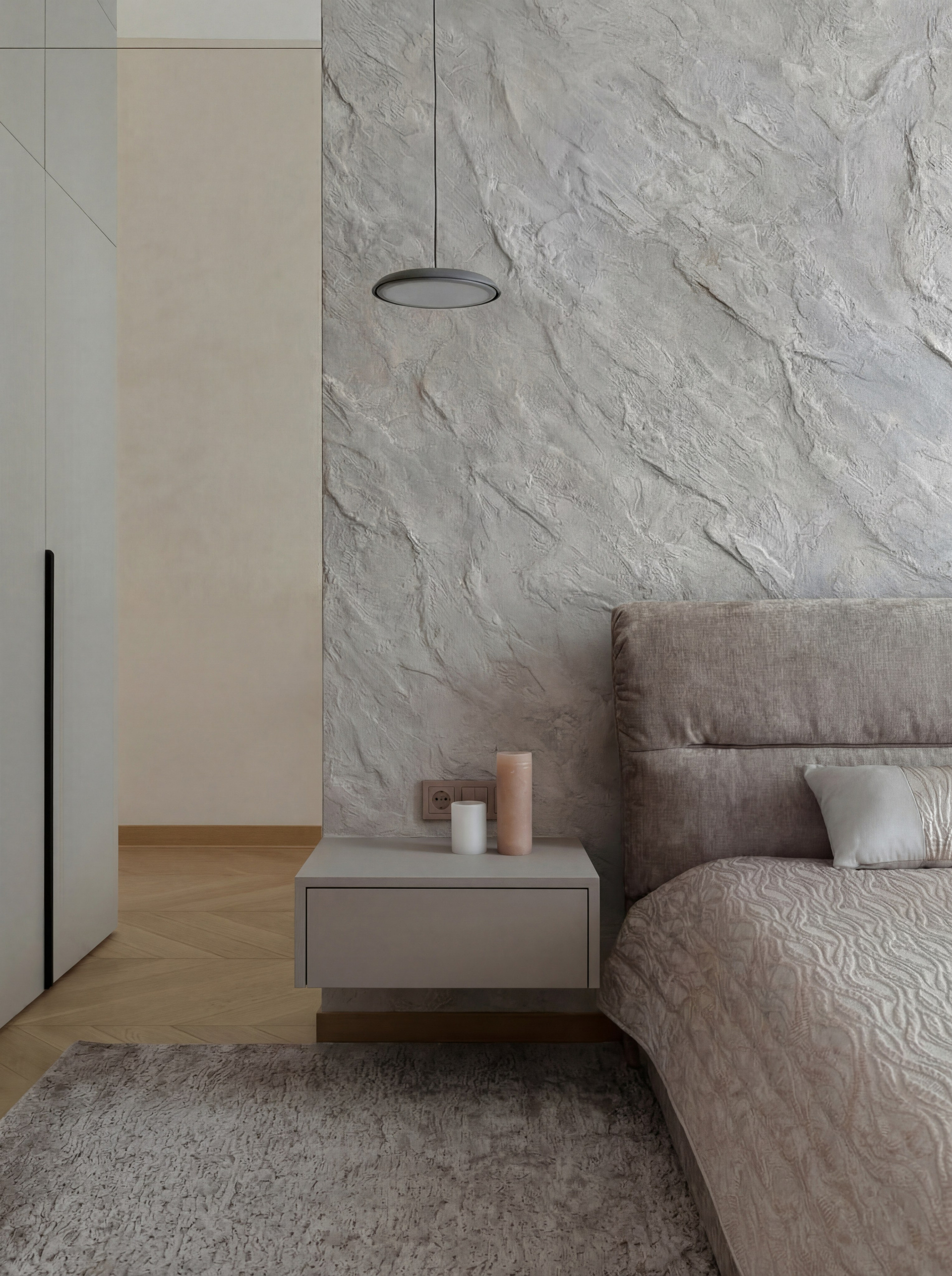 Вторая спальня раскрывает ту же эстетику в более мягкой и обволакивающей подаче. Большое декоративное панно, пудрово-бежевые оттенки, встроенные объёмы хранения и более тёплая палитра создают камерное пространство с чувственным характером. При этом комната остаётся собранной и архитектурно чистой.
