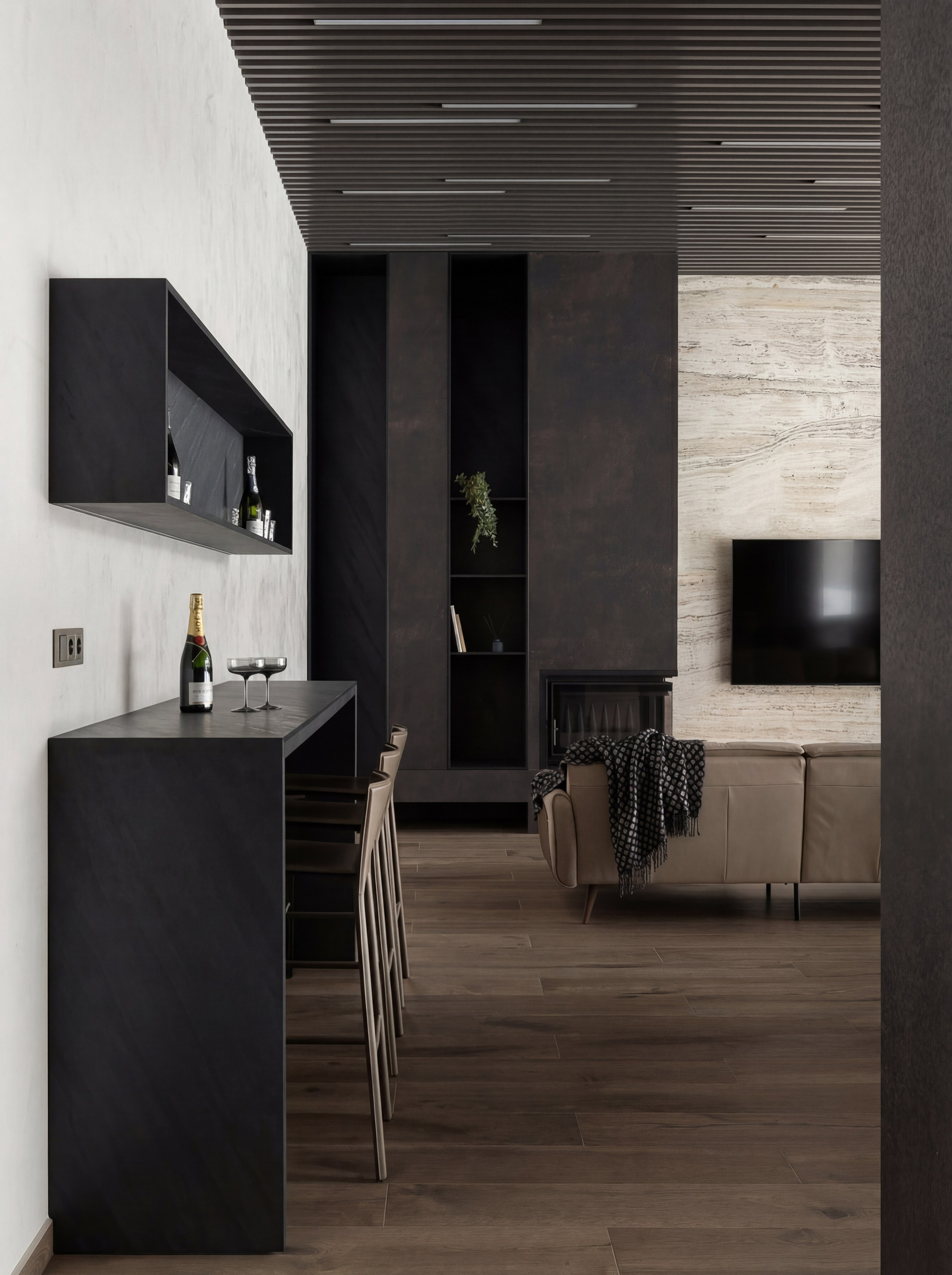 Тёмная кухня, реечный потолок, каминный блок, строгая мебель и плотная палитра создают самостоятельный сценарий жизни внутри дома — более приватный, более вечерний, более спокойный. Это не просто ещё одна гостиная, а полноценная контрастная зона, которая делает весь интерьер богаче и сложнее.