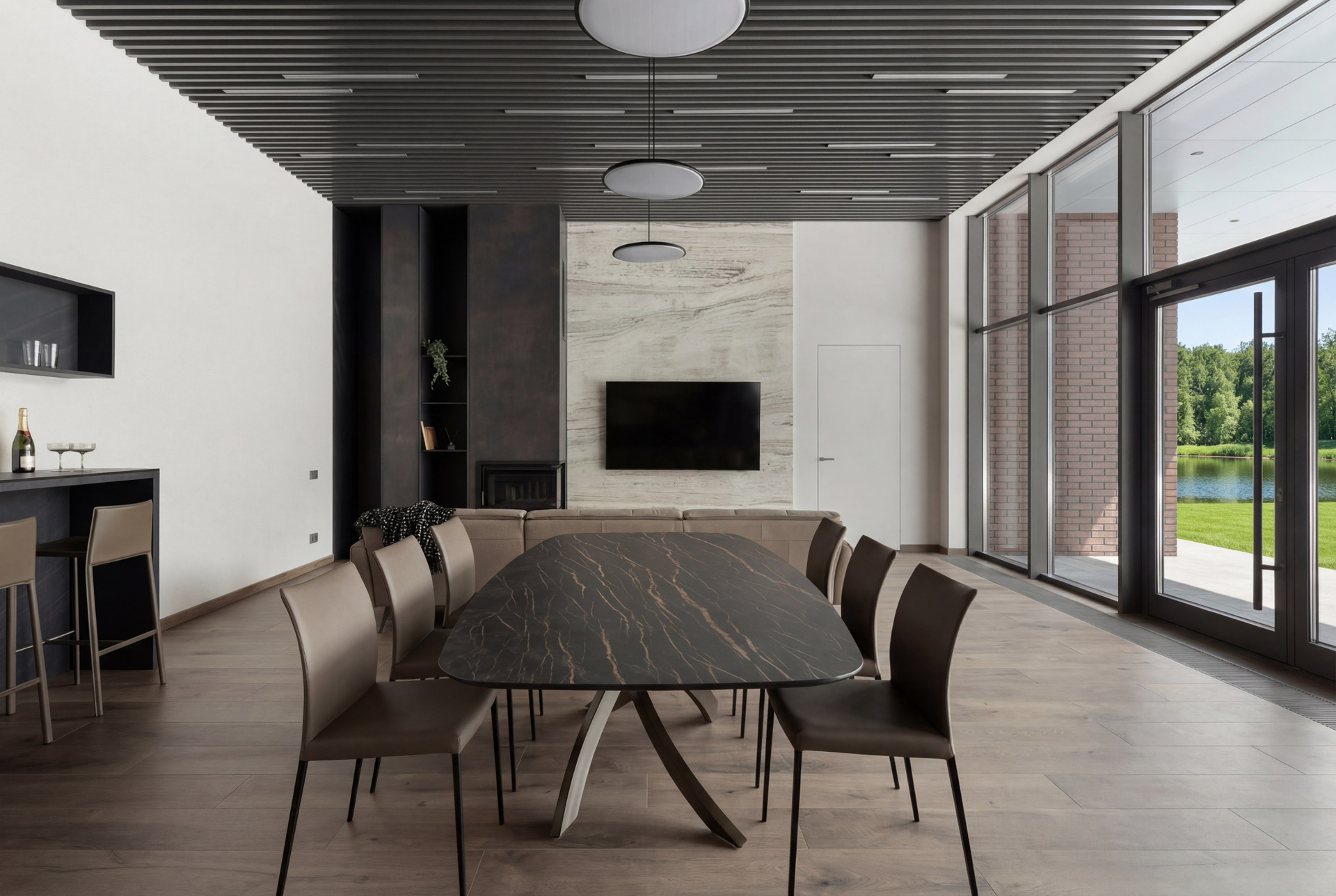 Образ дома строится на сочетании панорамного остекления, видов на воду, больших вертикалей, спокойных плоскостей и материалов с выраженной фактурой. Здесь нет случайных акцентов: каждый элемент поддерживает общую композицию, а ощущение премиальности возникает не за счёт избыточности, а за счёт качества среды, чистоты линий и точности решений.