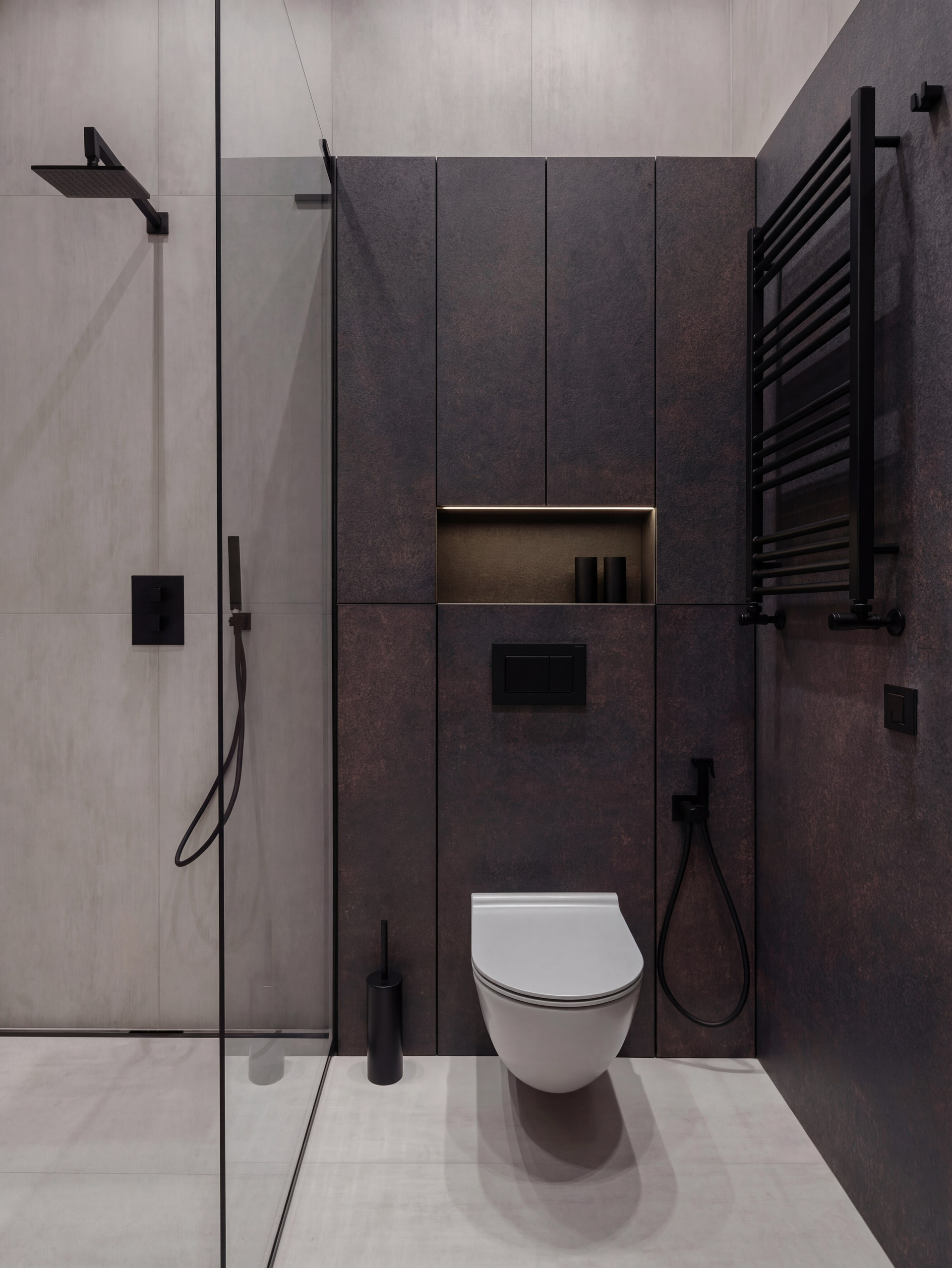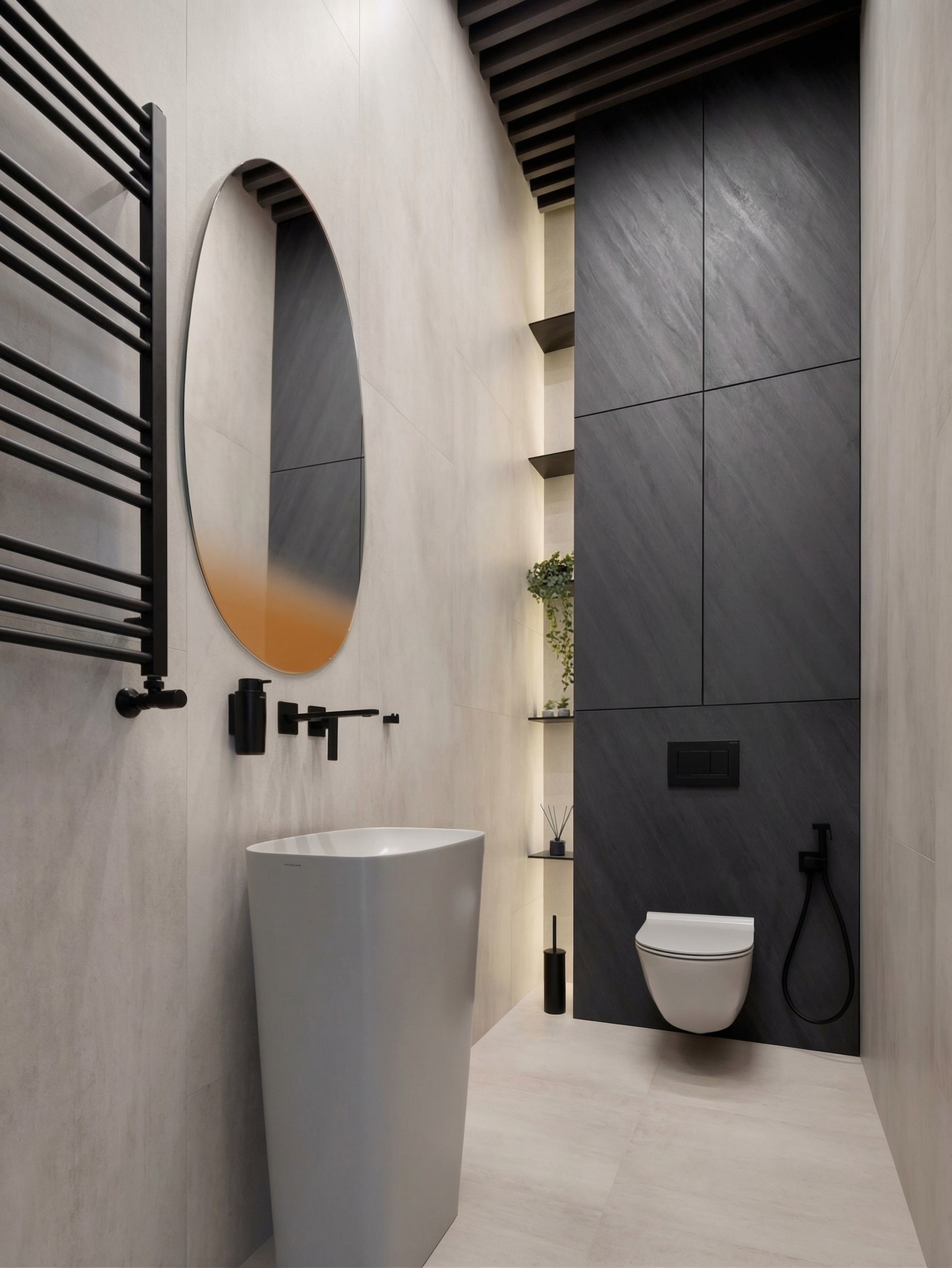 Компактный санузел с тёмными акцентами