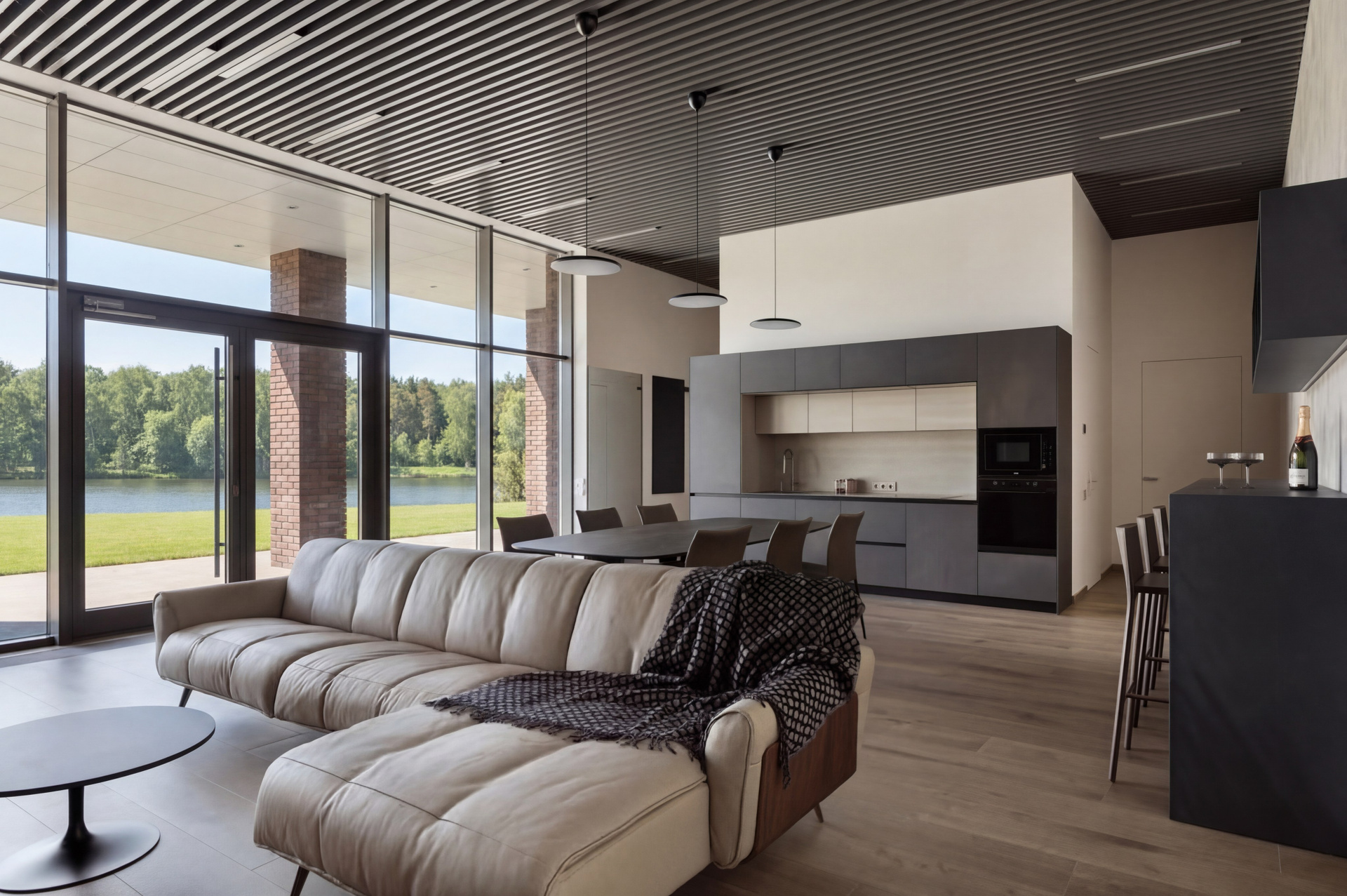 Отдельную роль играет природное окружение. Виды на воду работают не как фон, а как полноценная часть композиции. Они усиливают глубину пространства и делают интерьер визуально шире, мягче и эмоционально богаче.