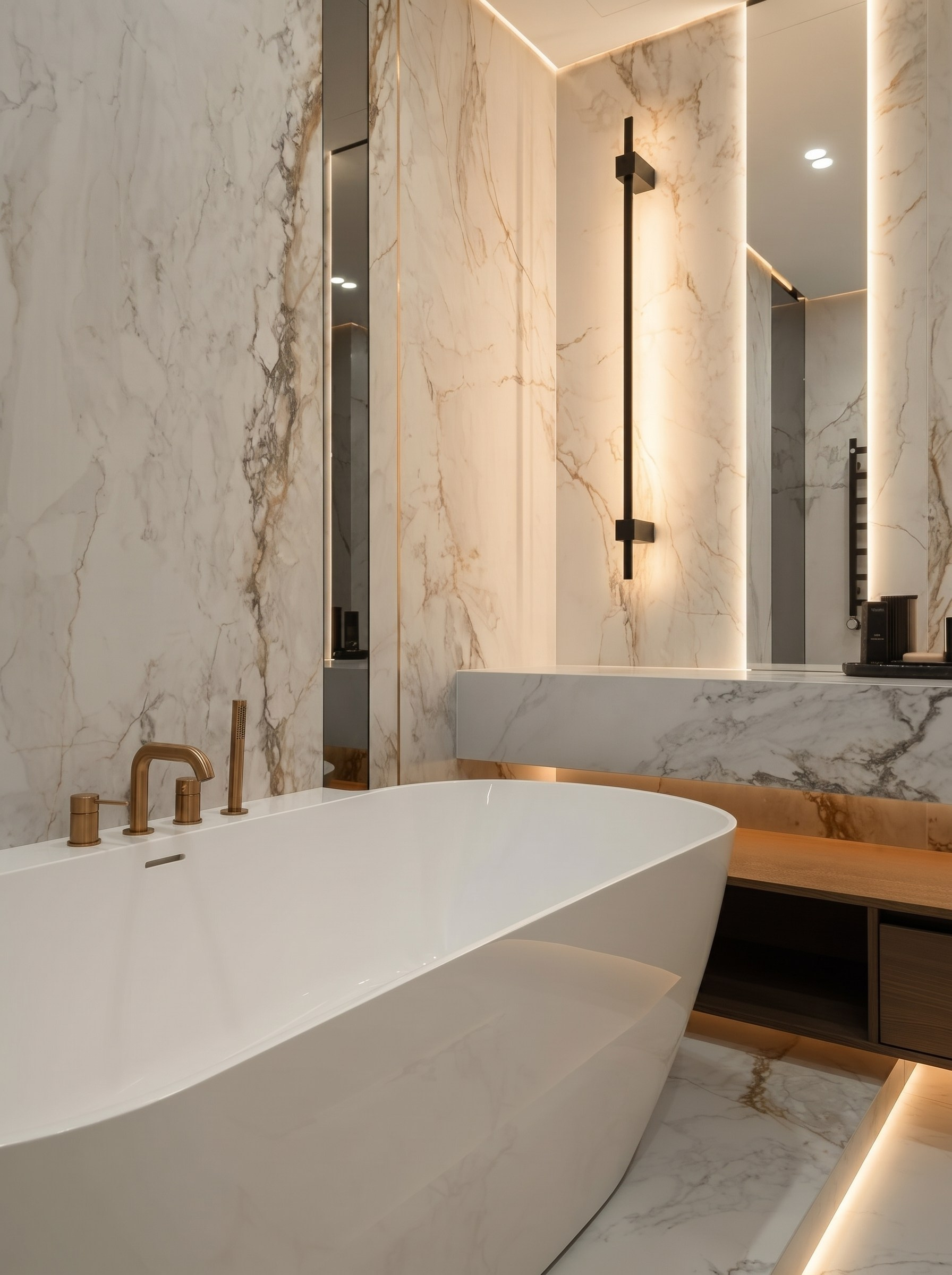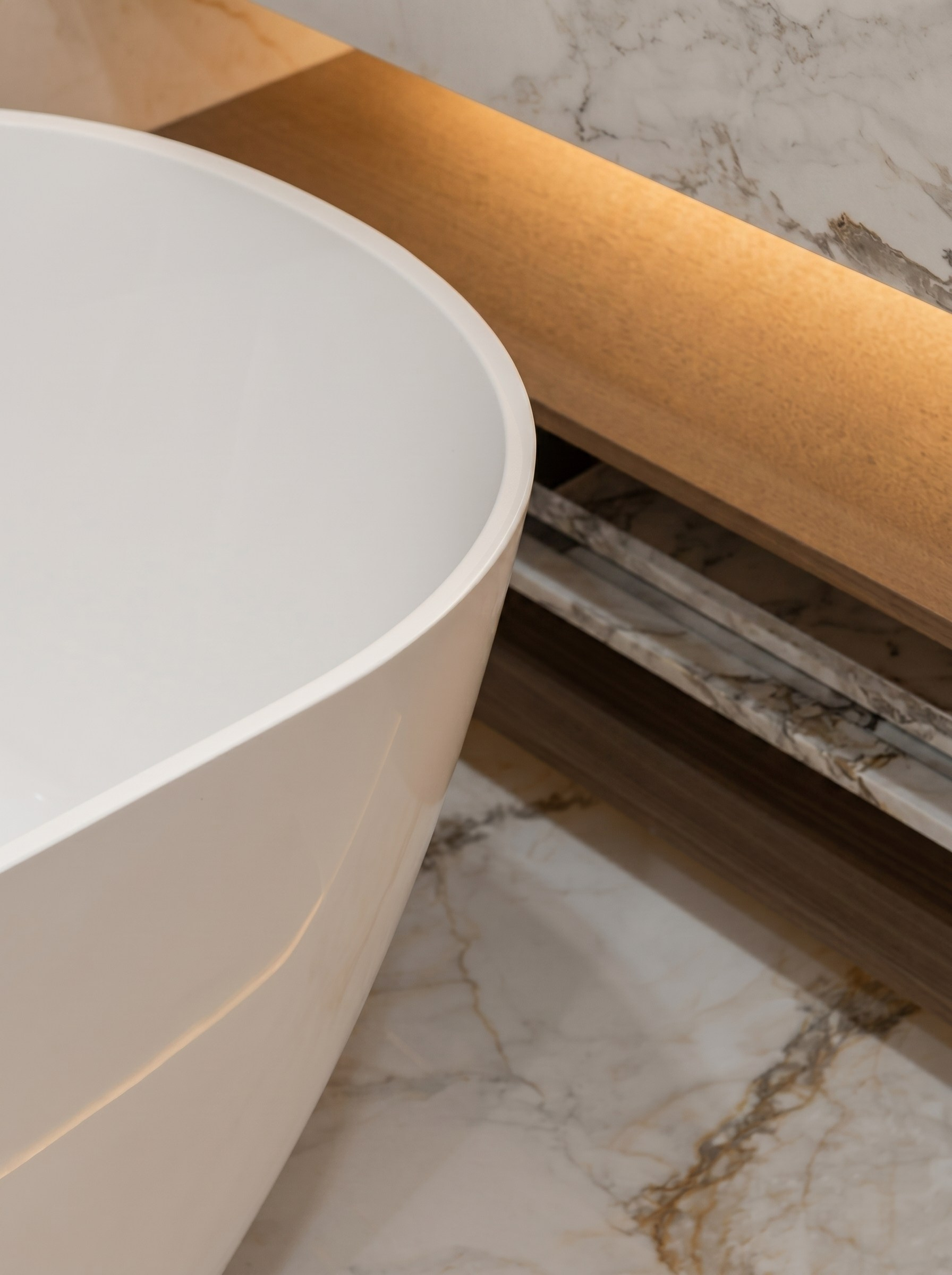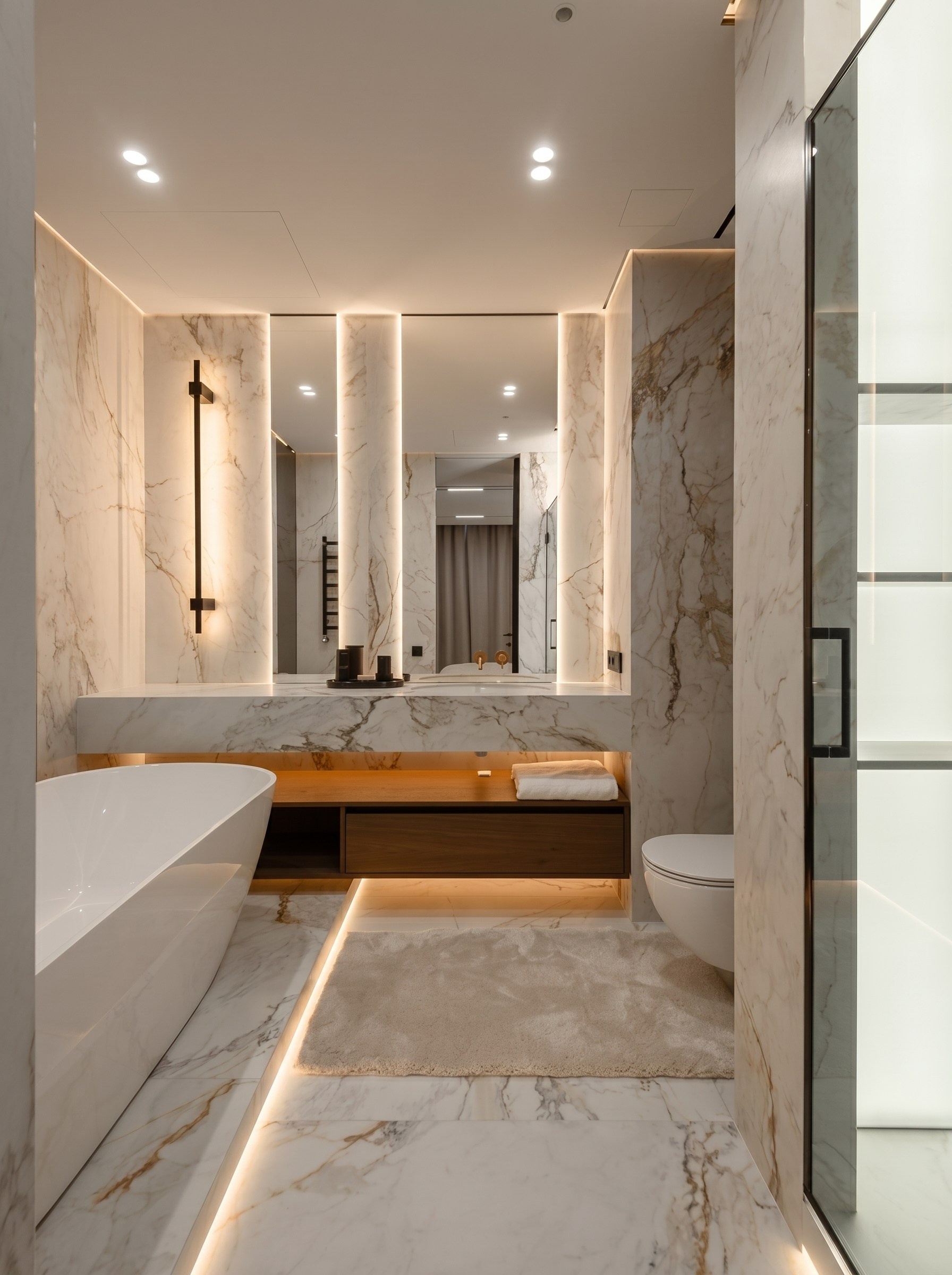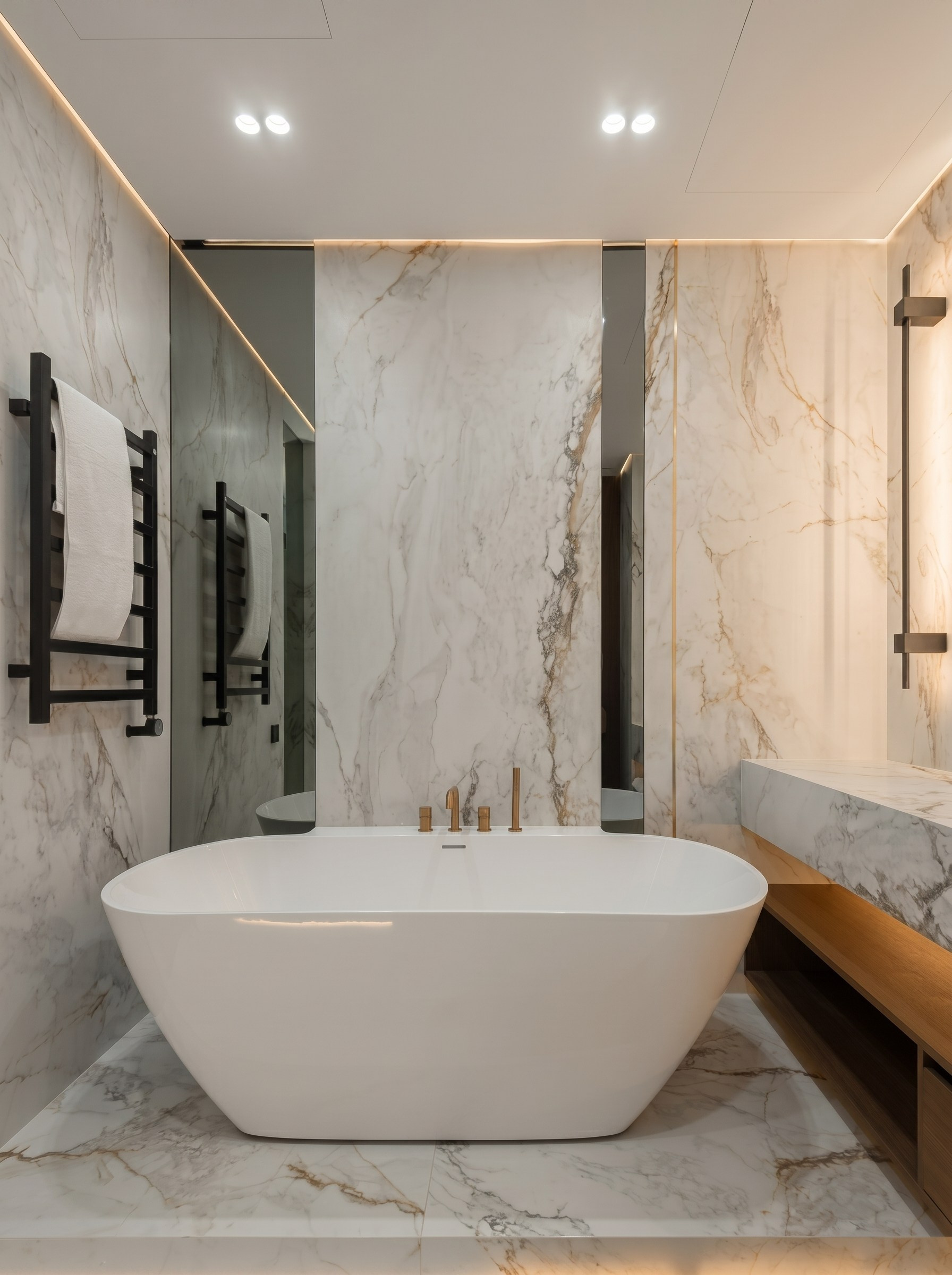 Отдельно стоящая ванна становится главным эмоциональным акцентом мастер-санузла. Подсветка, глубина каменных плоскостей и точное расположение внутри пространства делают её не просто сантехническим элементом, а центральным объектом интерьера.