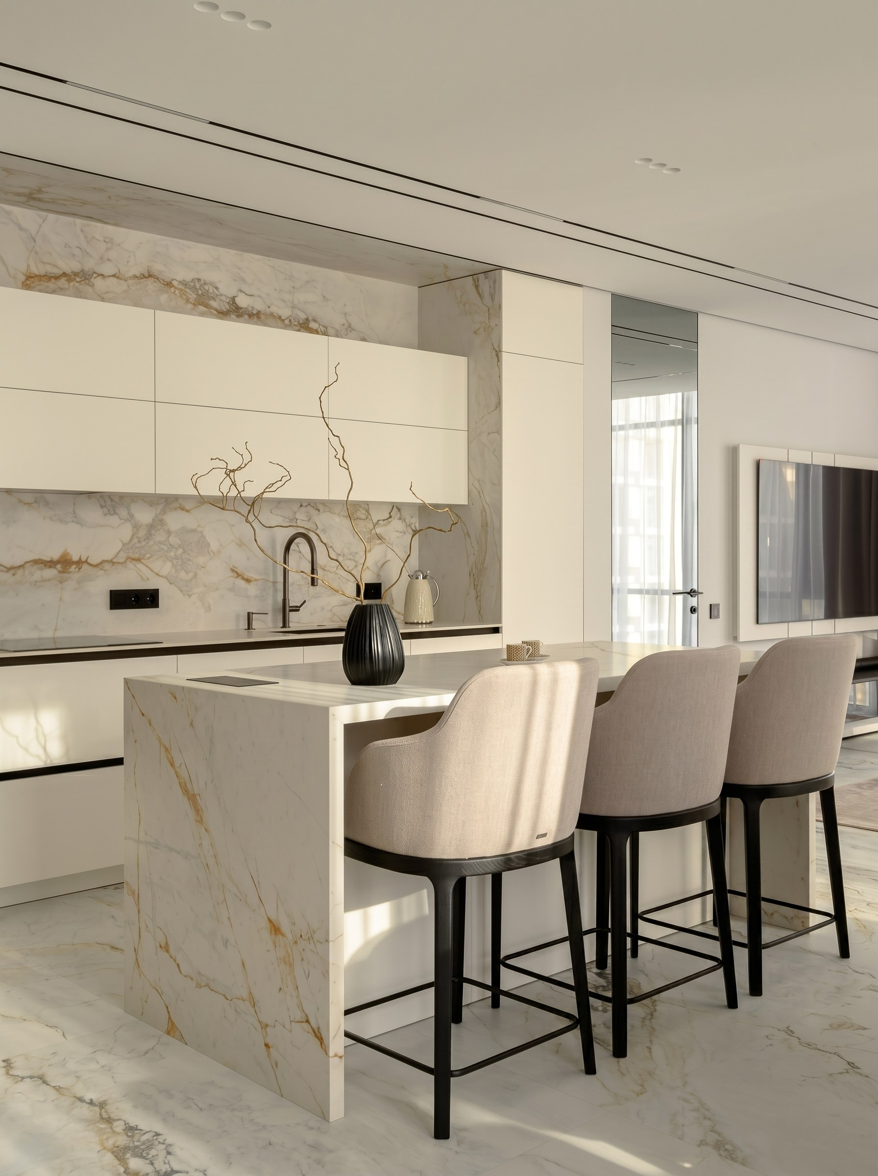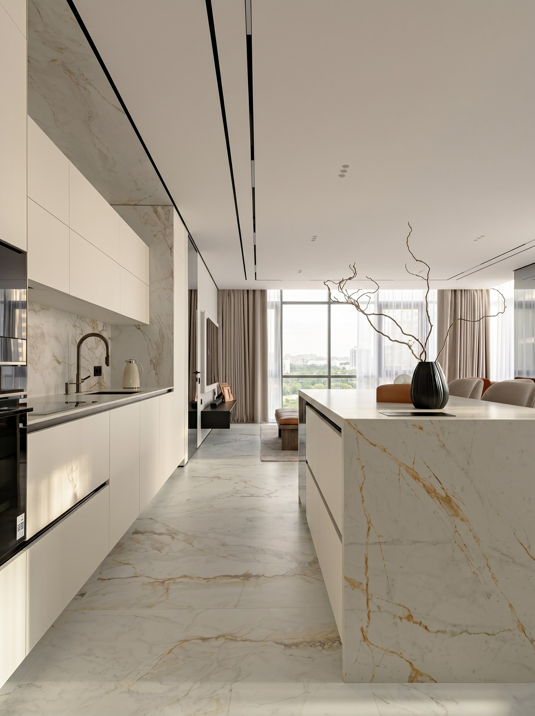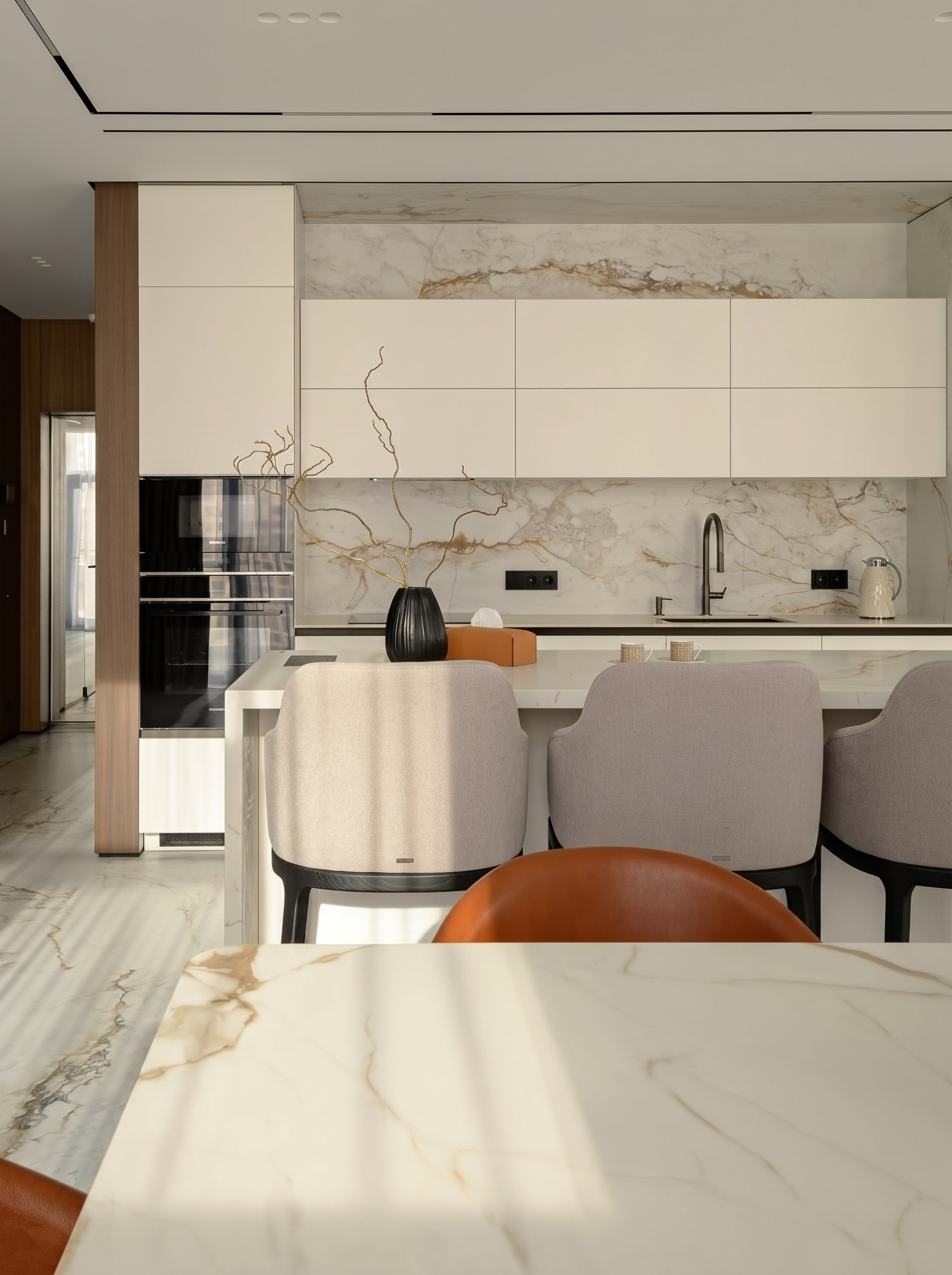 Крупноформатный светлый камень задаёт масштаб и объединяет ключевые поверхности: пол, кухонный блок, остров и акцентные плоскости. Ореховый шпон добавляет глубину и тепло, благодаря чему интерьер не выглядит холодным или слишком формальным.
