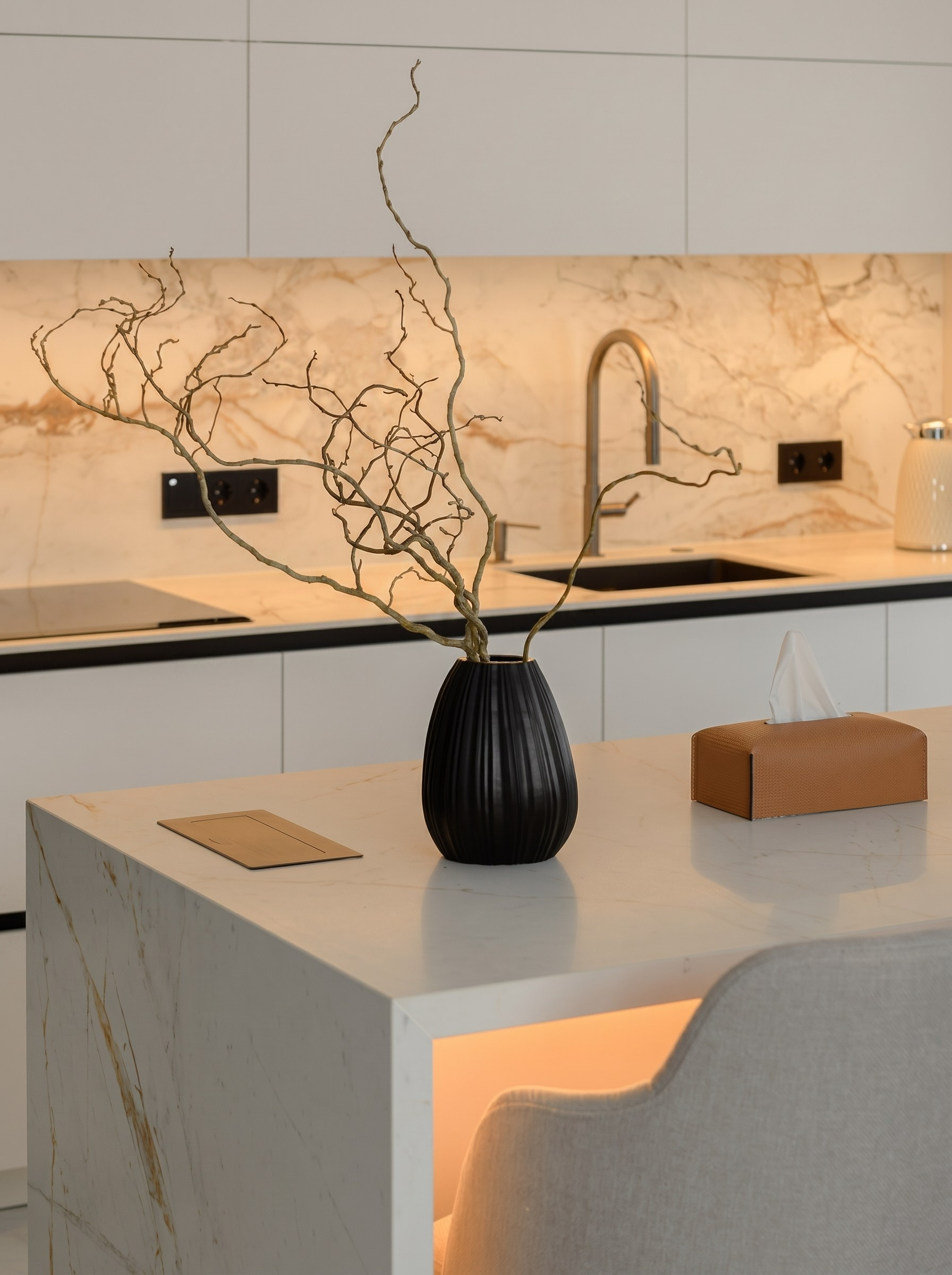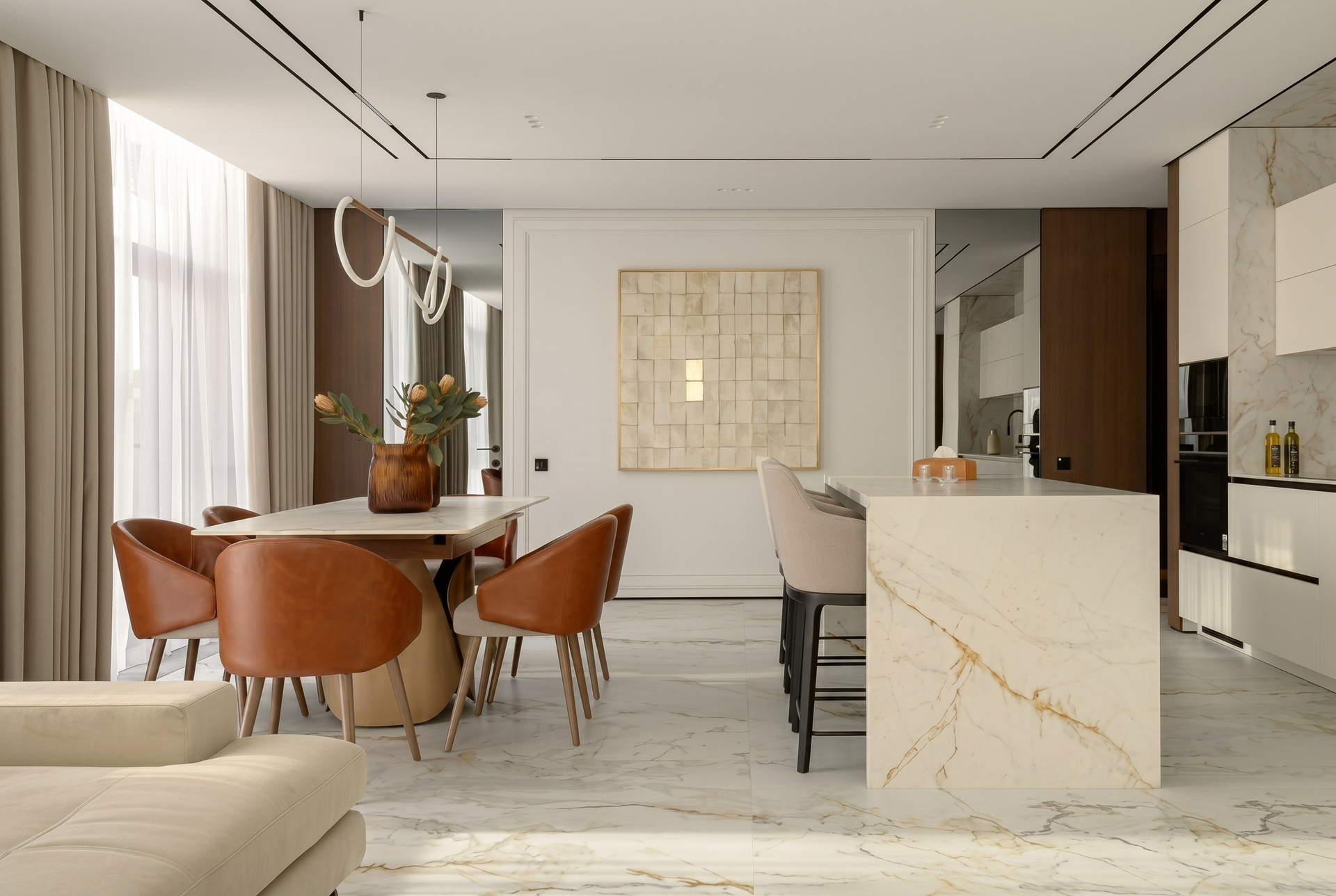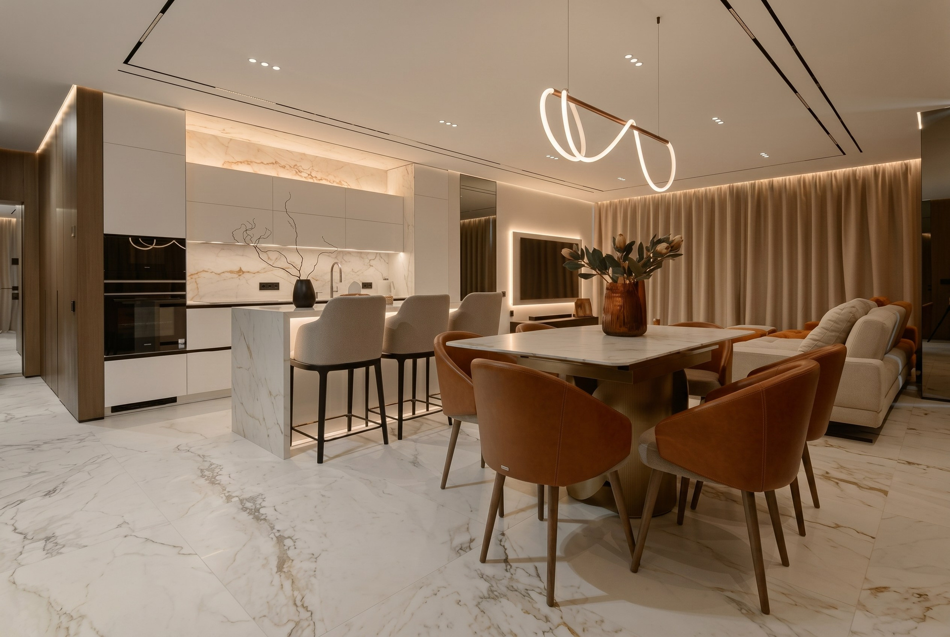 Крупноформатный светлый камень задаёт масштаб и объединяет ключевые поверхности: пол, кухонный блок, остров и акцентные плоскости. Ореховый шпон добавляет глубину и тепло, благодаря чему интерьер не выглядит холодным или слишком формальным.