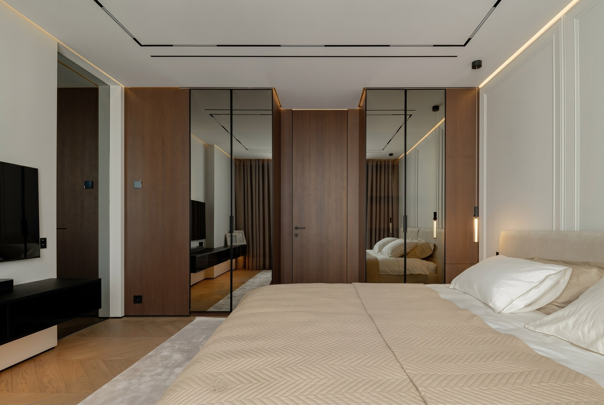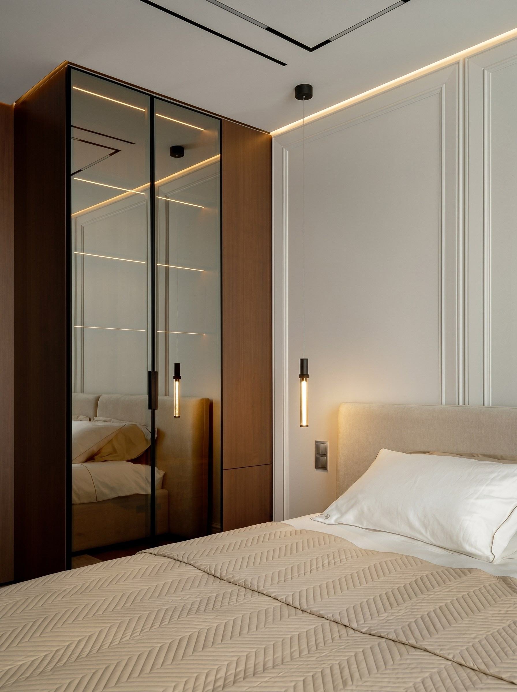 Мягкое изголовье, молдинги и деликатный свет формируют в спальне защищённую и очень собранную атмосферу. Здесь особенно хорошо считывается баланс современной чистоты и мягкой классической пластики.