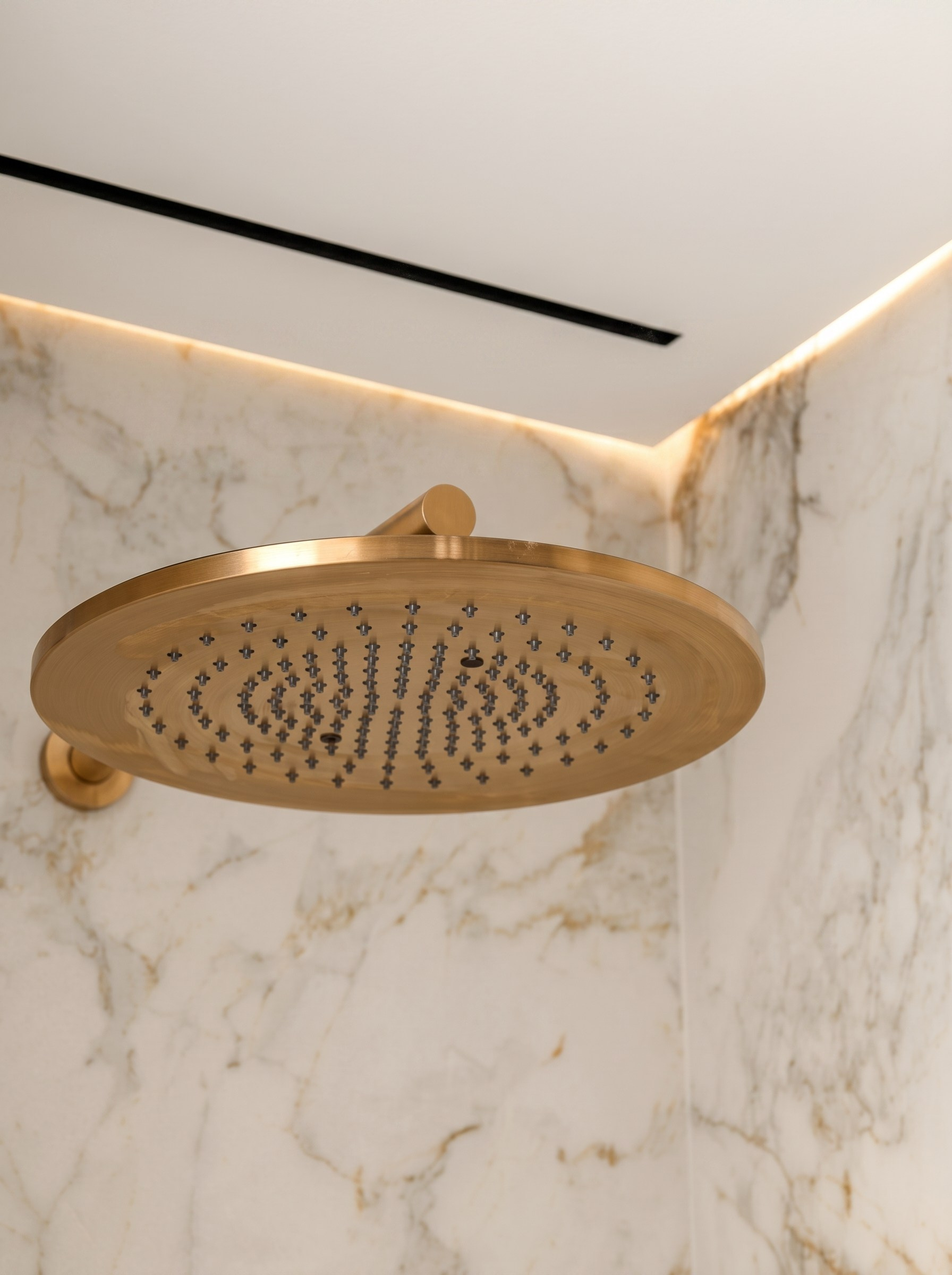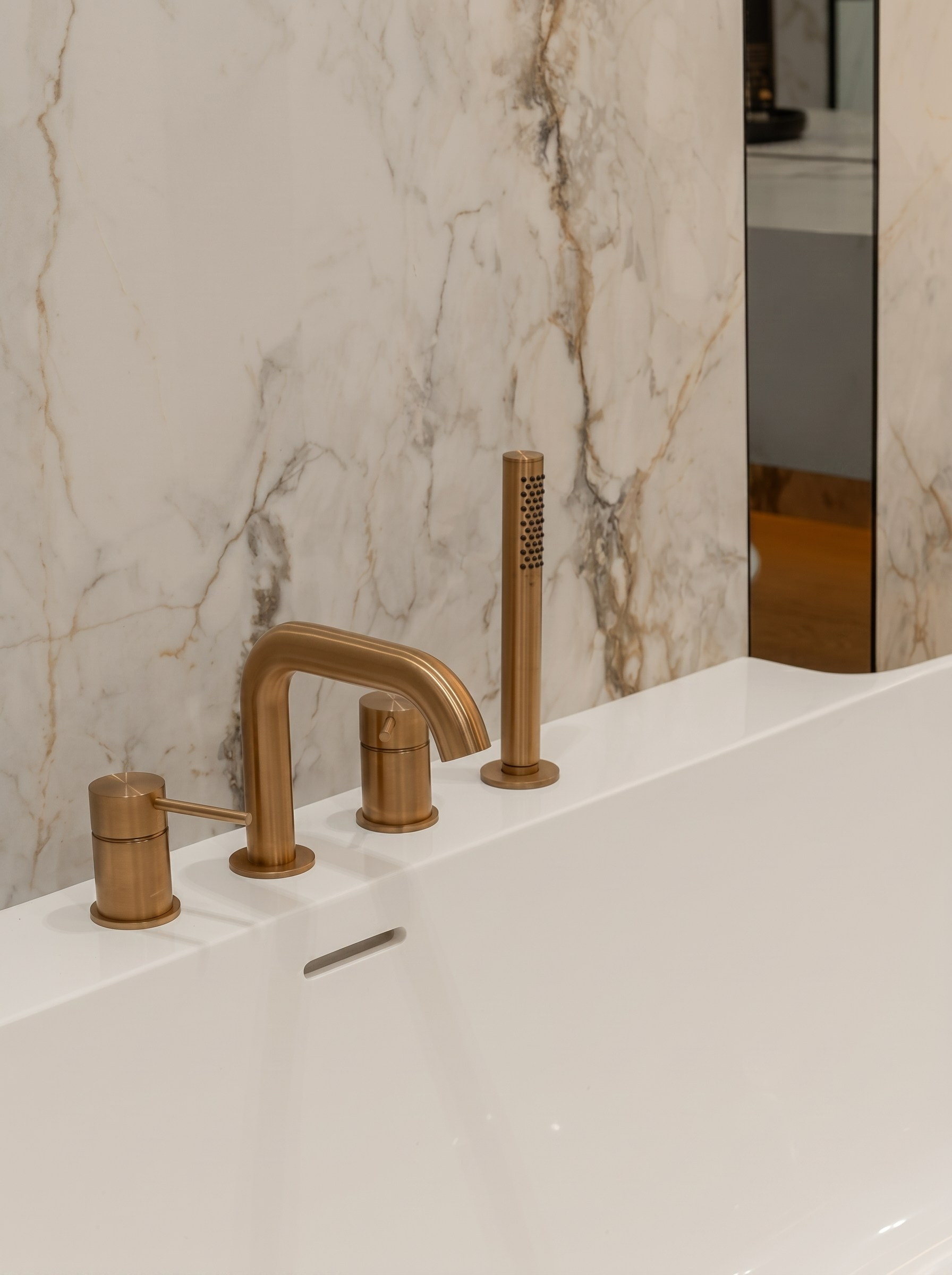 Латунная сантехника добавляет деликатный акцент и поддерживает общий характер интерьера — спокойный, собранный и дорогой.
