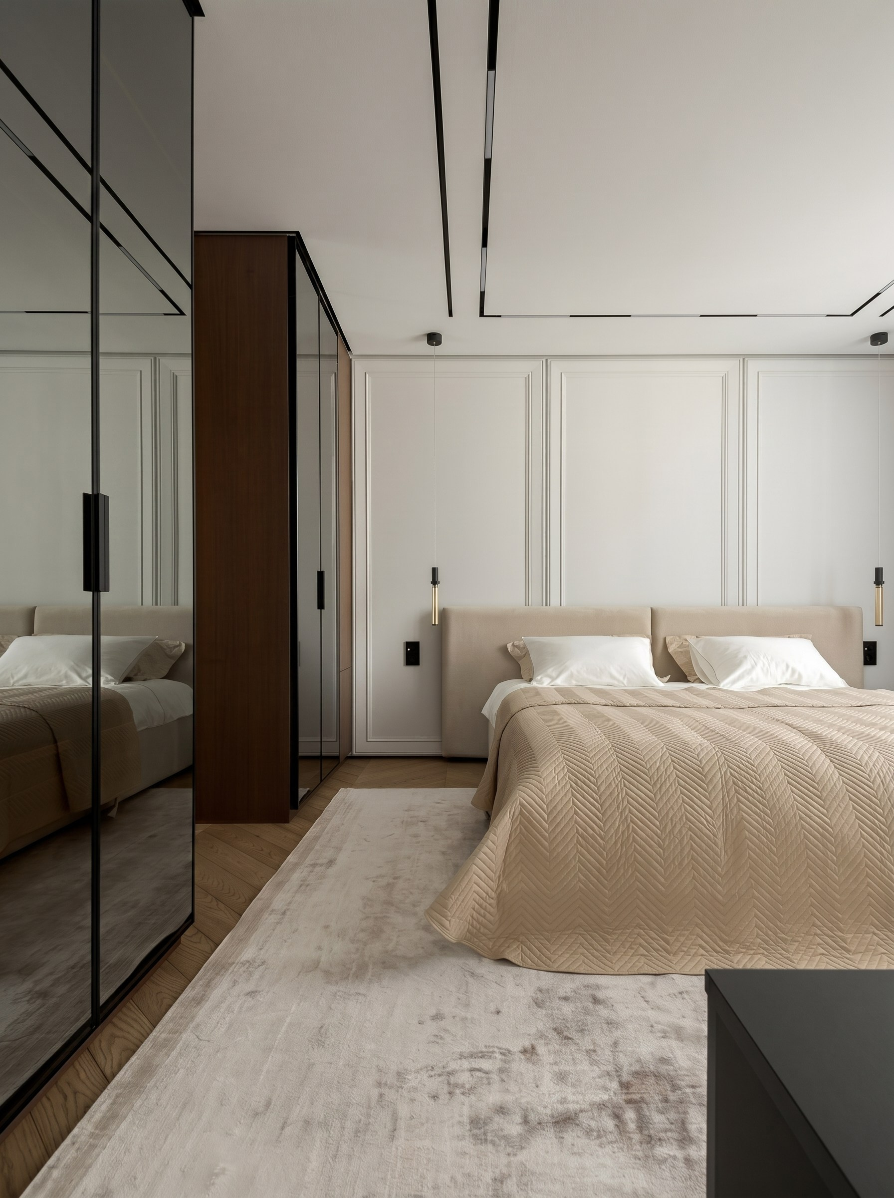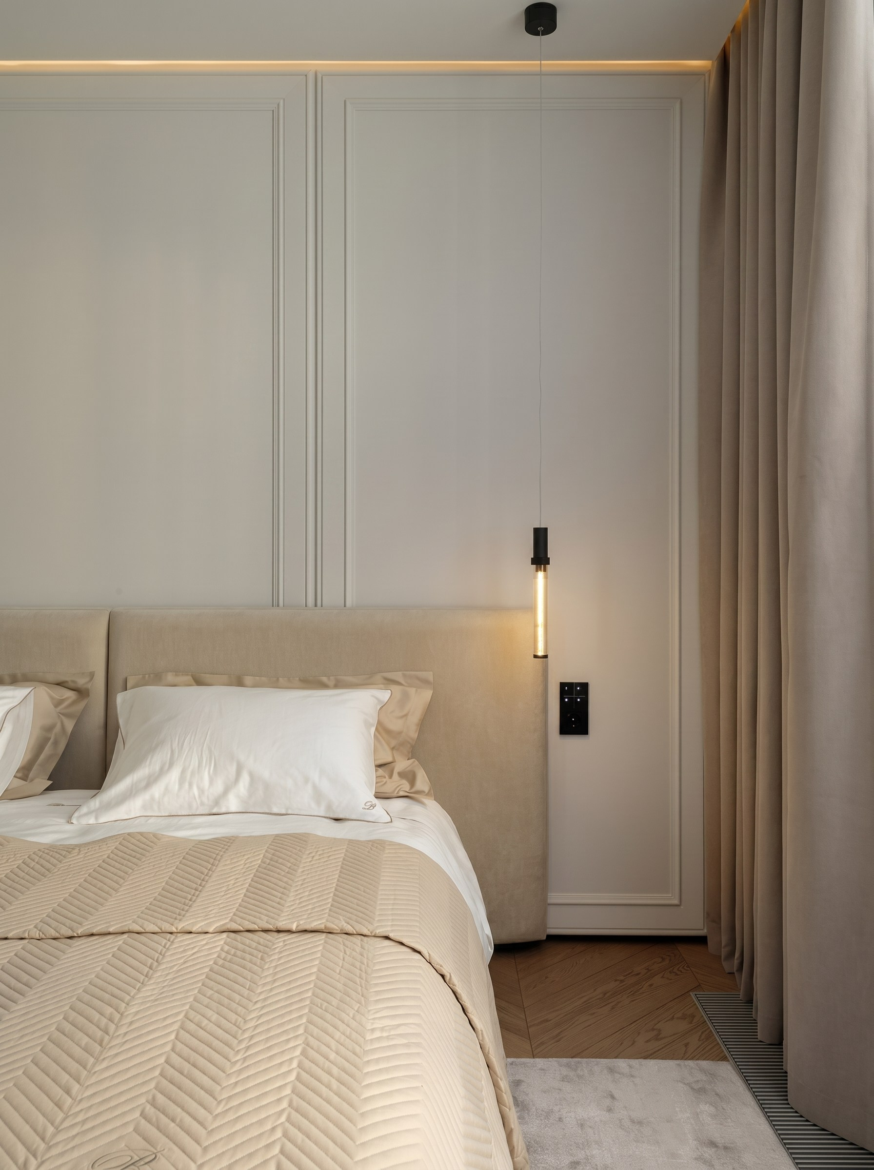 Кровать с мягким изголовьем встроена в плоскость стены с молдингами. Этот приём делает пространство глубже и благороднее: классический ритм читается деликатно и не перегружает интерьер. В результате спальня выглядит статусно, но остаётся очень спокойной и уютной.
