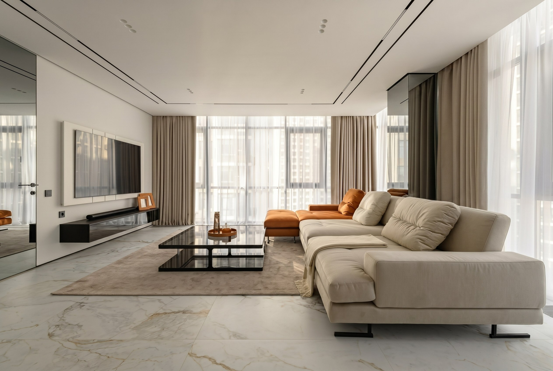 Гостиная построена на крупных, спокойных формах. Мягкий диван, большой ковёр, лаконичный журнальный стол и чисто решённая ТВ-зона создают ощущение масштаба, уюта и визуальной тишины.